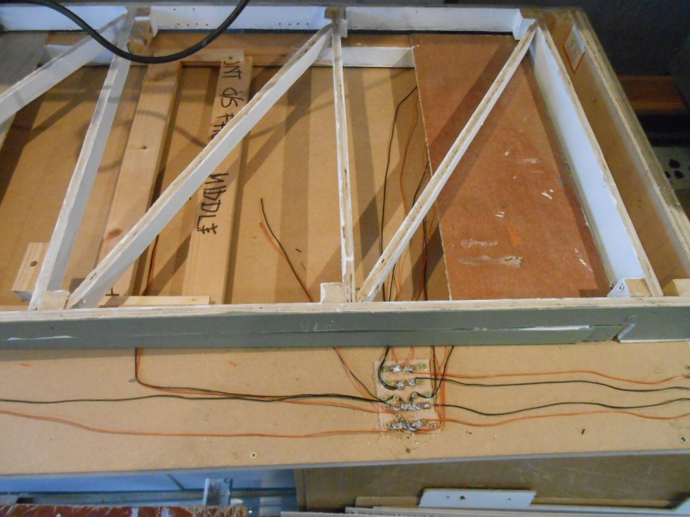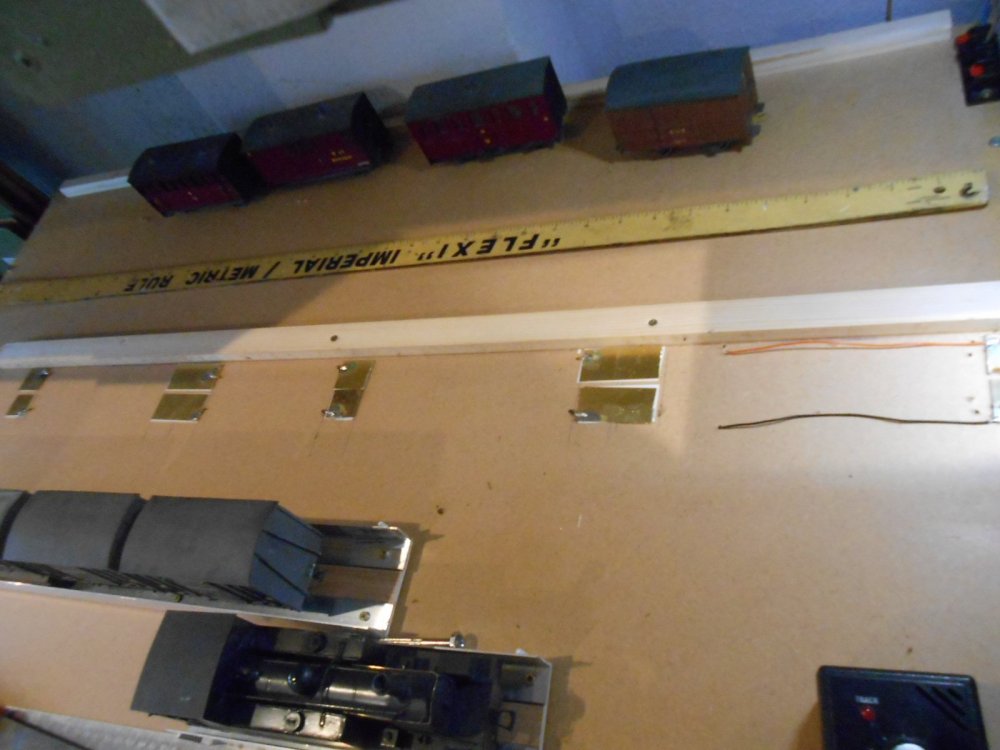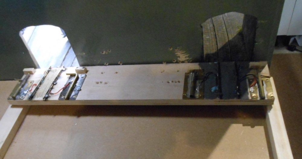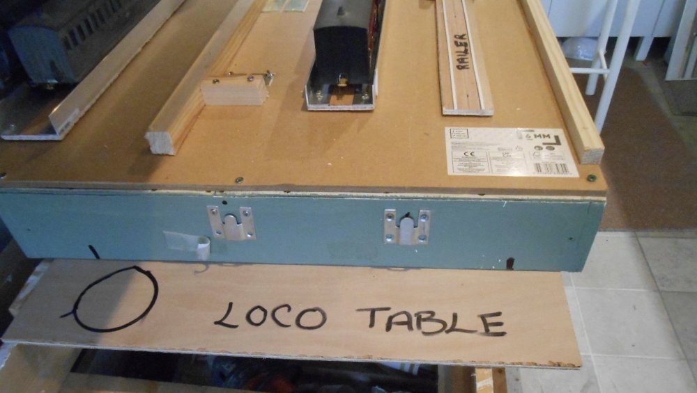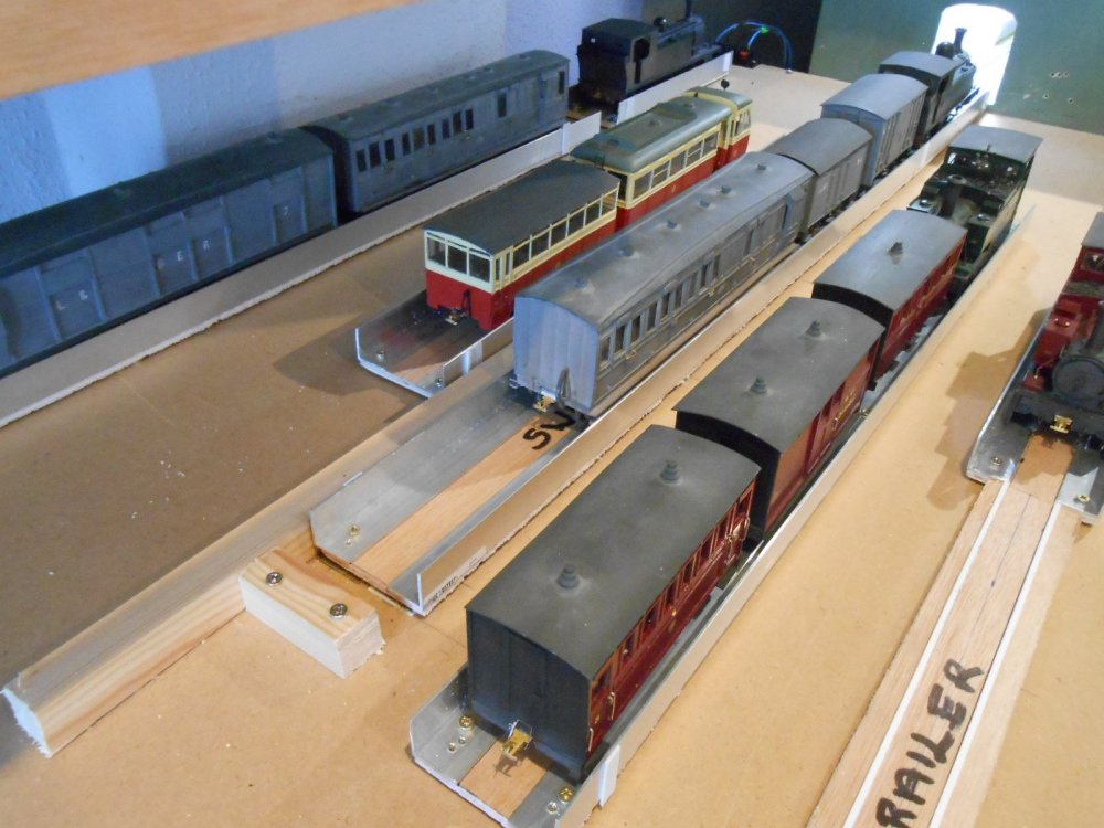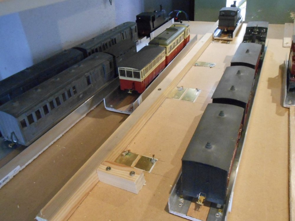 Cassettes I'd long had a feeling that my sliding/turntable fiddle yard for Northport Quay might not be completely compatible with Swillybegs and so it has proved. A slight discrepancy of height on the interface causes stock to uncouple - not good. Also, the short interface section between the train table and the layout means two joints in the space of 10cm AND on a gradient. So, what to do? After much thought, decided the best option was to remove the train table and fit a new top that could take cassettes instead. Cassettes are not a new idea, but my take on simple alignment and power may be of interest. The cassette table itself is just a piece of 6mm MDF, strengthened with a piece of softwood along each edge. Each cassette is a piece of 5.5mm plywood, with two 20mm L section aluminium angle pieces that act as the track. The angle is screwed to the plywood, though I also use double sided tape to position it initially. The clever [?] bit is that the screws project through the plywood, sticking out about 1.5mm the other side. Why? Because these screws carry the electric power, which comes via brass strip fitted at strategic points to the cassette table. Another piece of softwood is screwed to the cassette table and is used to align the cassette, as shown below. While two long pieces of brass strip could be used to span the full length of the cassette table, for economy, I use several smaller pieces, spaced to match the separate loco and train cassettes. This requires a bit of extra wiring, of course, but have found it works well in practice on a previous 0 gauge layout. Some cassettes [eg a railcar, or a short freight] are not difficult to pick up and turn round when the trains come back to the fiddle yard, so they are ready to be sent out again. Longer trains are better having separate loco and train cassettes, so just the loco has to be picked up, turned and moved to the other end. So, loco cassettes are 9" long, train cassettes are 24" and railcar [+ trailer] 18", equating to how the brass strips are spaced out. Vertical and horizontal alignment is fine tuned with pieces of plasticard. The brass strips sit on 20thou [0.5mm] plastic sheet, which ensures the aluminium angle matches the rail height on the layout. Horizontal alignment uses micro strip of various sections to ensure the cassettes line up with the rails. While am sure some of you out there would make a jig to ensure this, on the cassettes illustrated, all I've used are pieces of 2.5mm square plastic strip. There is no physical connection between a loco and train cassette - simply pushing them together and against the central strip of wood is all that is needed. Below is a sequence of photos that hopefully show how this happens. Youshould also be able to pick out the plastic strip used for fine tuning horizontal alignment, which may thicker or thinner on other cassettes, so they will need to be clearly labelled so the work properly as pairs. A bit of wiring is shown below. Notice too how the cassette table is wider than the layout. This is deliberate, so there is enough room on the table to move the trains around. Having seen a variety of complex ways for aligning and powering cassettes over the years, I wrote my version up and entered it in a competition for original ideas in Model Railway Journal and was pleasantly surprised to be awarded second prize and a Wild Swan Books voucher. This was at least ten years ago, so if anyone thinks they thought of the same thing before me, sorry, but the voucher has long since been spent!