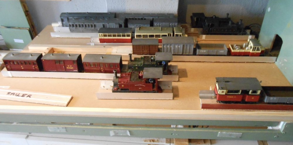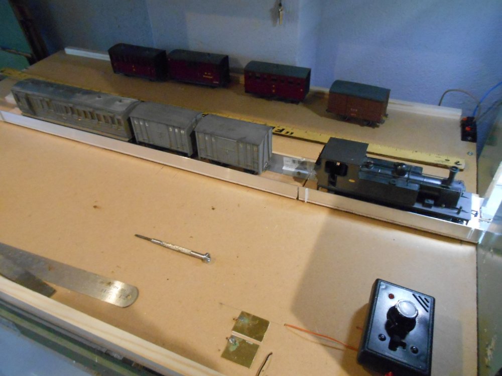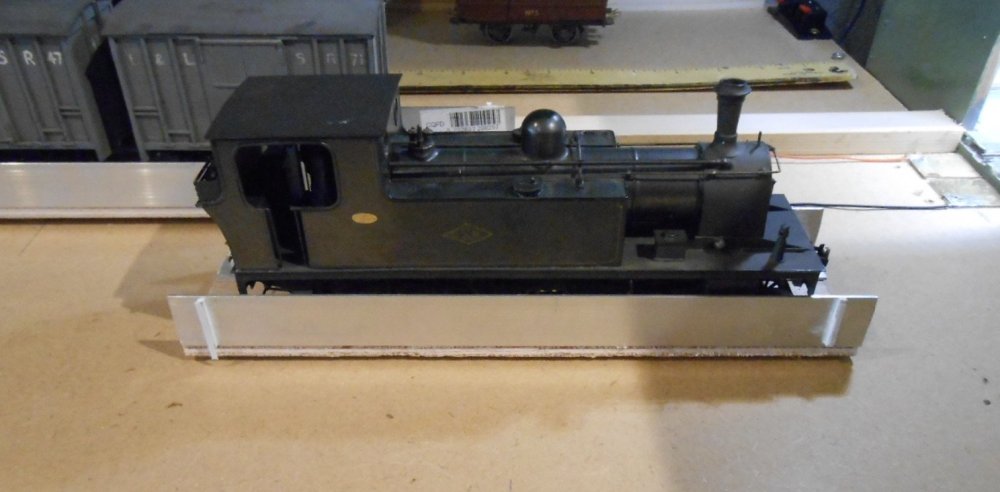 Much time has been spent this week fine tuning the cassettes and fiddle yard table. Above you can see the five trains, spare engine, plus Phoenix and its wagon cassette. I was expecting a bit of work because experience with Fintonagh taught me that if the back to backs are more than 0.2mm out, then derailments are possible on the points and so it proved. Horizontal alignment is achieved by glueing plasticard strip to the vertical wall of each cassette. Mostly this has been 40 thou/one millimetre thickness, but occasionally, only 20 thou has been needed and in one case 60 thou [20+40]. Vertical alignment is really just careful filing of the fixing screws. Occasionally, I found I'd taken too much off and a fresh screw was needed. Also managed to fix one or two screws too far inboard, meaning bogies, axle boxes etc could clout them. Needless to say, this brought out more than a bit of creative bad language, but only myself to blame. Quickly realised that a different cassette was going to be needed - one without any sides to make railing stock easier. Narrow gauge vehicles are hard enough at the best of times, with their wide overhangs, but the cassette sides make putting on anything other than a four wheel vehicle pretty much impossible. My simple solution was to stick 60 x 100 plastic strip to a piece of plywood that has flat aluminium strip glued underneath. White plastic works well with dark wheels too. Though there is plenty of room on the cassette table, have found a piece of plywood pushed under the outer end of the table gives space to put a loco cassette while it is being turned. Doubles up as space for a coffee mug and nicely levels the cassette table too. An important safety item is this small block of wood, just beyond the end of where the main cassette goes - just in case a train should over run. The height is just right for the DG couplings to clear it. A couple of other pictures show how the train cassettes might be shuffled around. Otherwise, so far so good. Now need to work on rehearsing operation on the layout itself, while all the new couplings need to be checked and then chemically blackened.