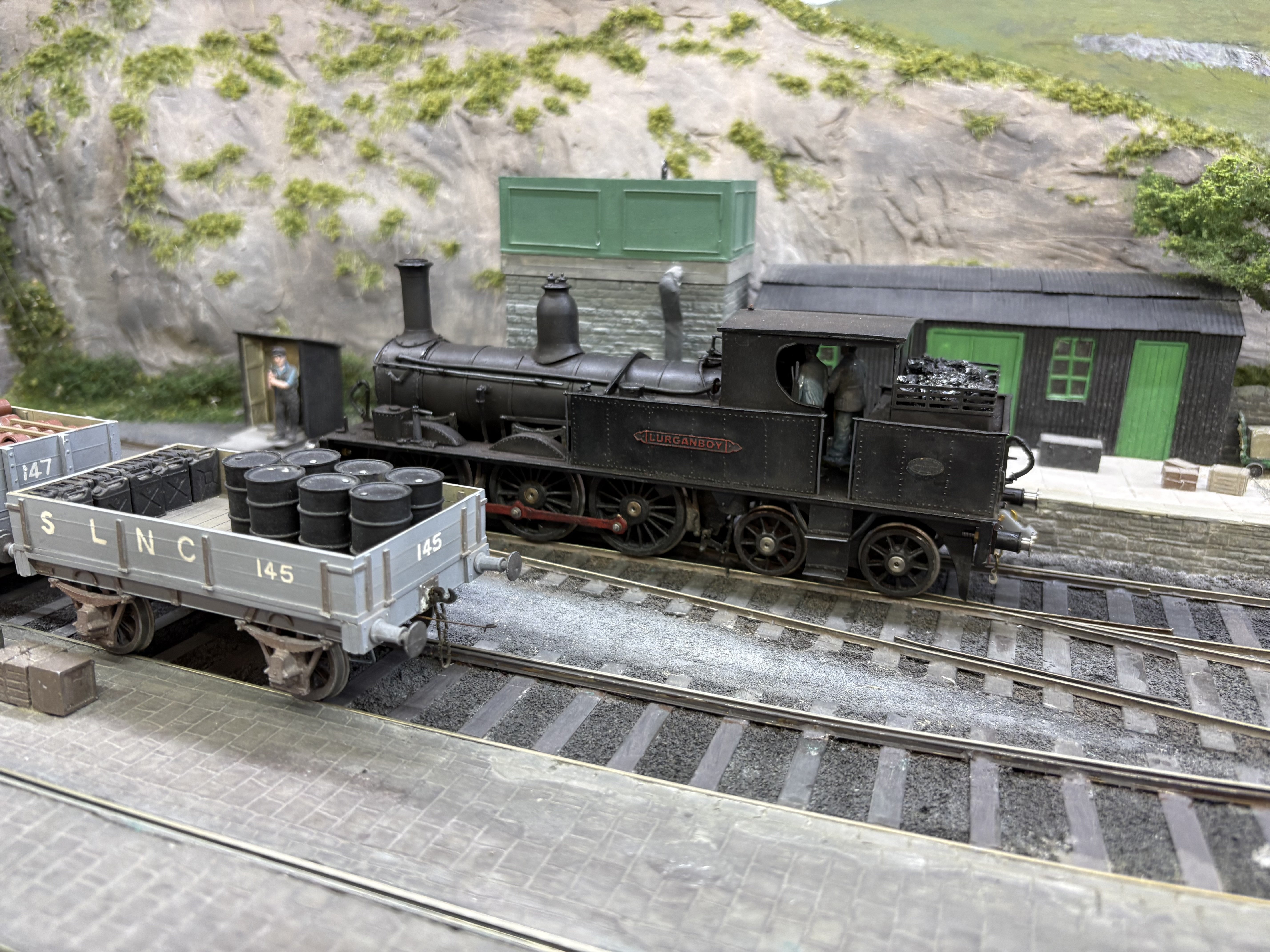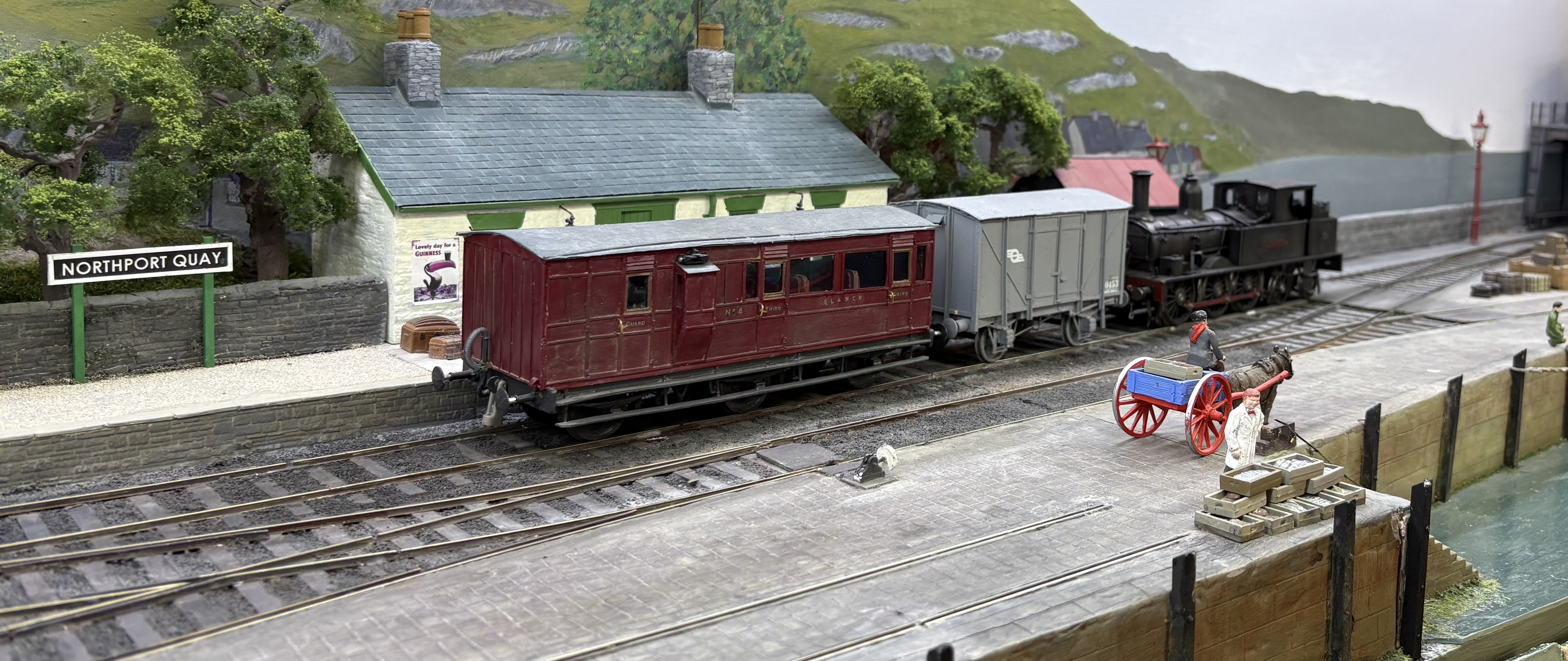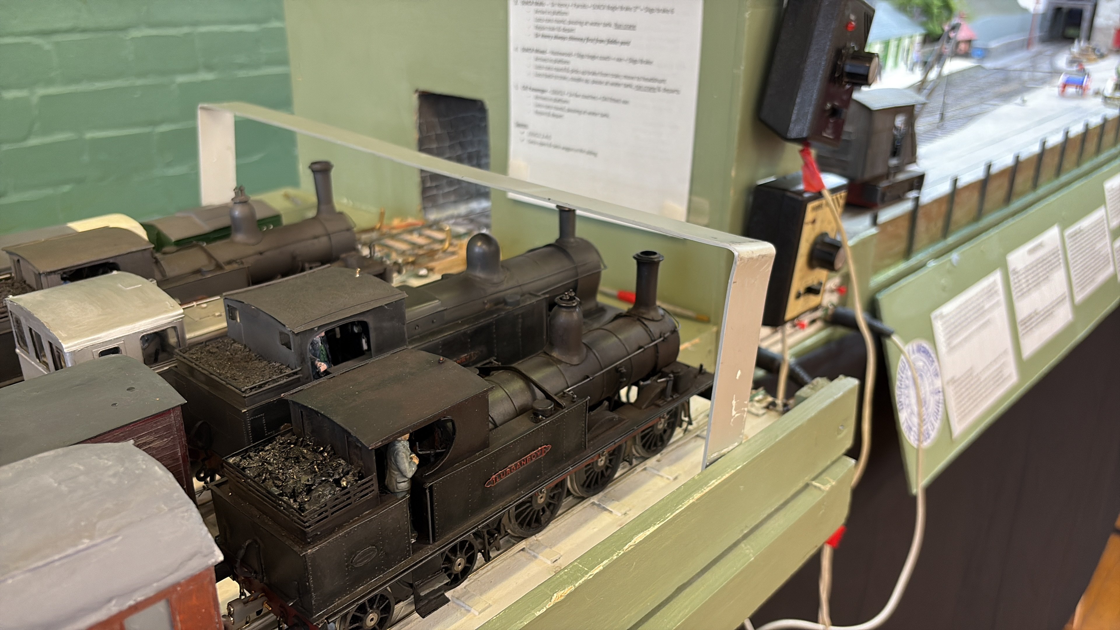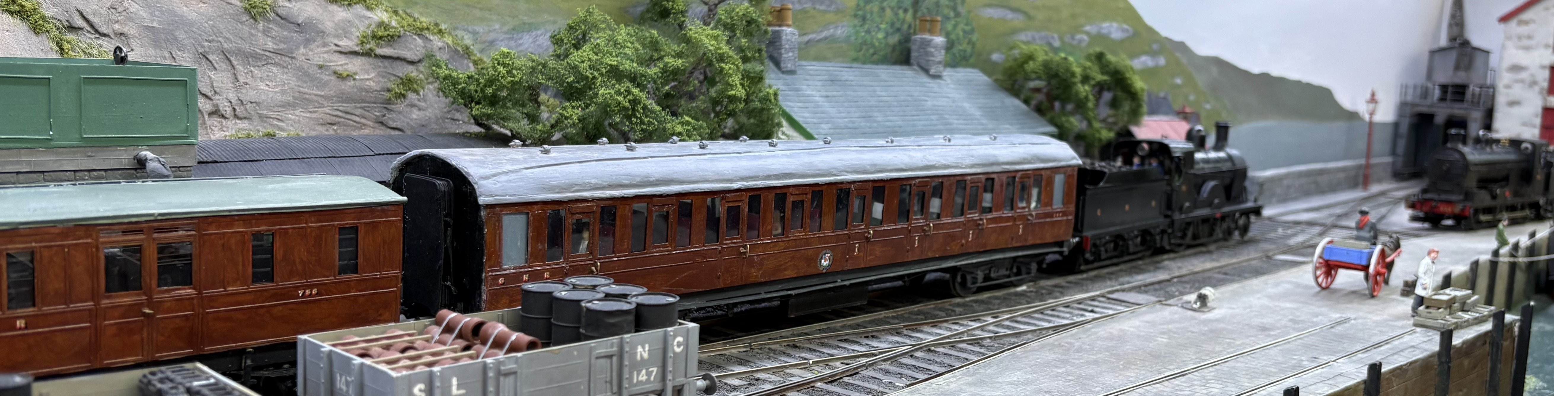 Well that was fun - a day on NPQ at Aldershot. A few annoyances - the SG2 keeps shorting out, and there were one or two stock issues which I trace to dodgy back to backs or stray pickups. The PP, on examination at home, has a pickup now bent at a strange angle, which explains at least one derailment….The GN coach needs more finishing work, and the magnetic couplings, highly effective though they are, will get some tweaking, not least camouflage. What an enormously fun day it was all round though. Great company and what an absorbing layout to run. To please Leslie we even ran a through portion of the Bundoran Express! Unless I’m greatly mistaken, I think this is the first appearance of corridor stock on NPQ. The coach is also about a foot and a half long ! I also achieved two personal goals. One was to operate the traverser in turntable mode. This is quite a responsible task, given that the deck is loaded with Mr Holman’s years of effort and dedication and a false move on my part could send it floorwards… The second one was to have a train of my own stock occupying a fiddle yard road and working a full part of the NPQ roster. Lurganboy, which has lurked in her box for months after disgracing herself at Uckfield and Tolworth, ran as sweet as a nut, and hauled my coach 4 and H van quite happily. The van is vacuum braked of course…. Willing suspension of disbelief and all that…. splendid day and always a joy to spend time with David H. Lots of advice, help and general chat in the margins. Very pleasing to see Leslie and companion too!