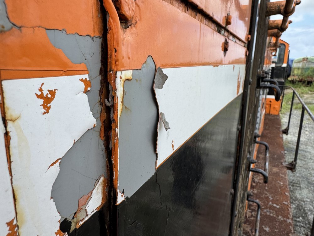 They got it without anything on the tender so I assume (as they didn’t really care about the significance of the paintjob, which I can’t blame them entirely) they stuck in the GS to make it look better and call it a day. But to have something 60 years in virtually untampered paint from service is fascinating. Some of the things in cultura are getting touch ups paint wise. The longer 800 avoids this the better. speaking of original paint. I was with the ITG the day 134 was being moved out of Moyasta. Some paint was naturally peeling off revealing its old liveries including the 1960s original GM Grey colour Most interestingly of all though was a Dart Green. Part of an experimental livery only 124 wore w probably for the best that this colour scheme never took off
