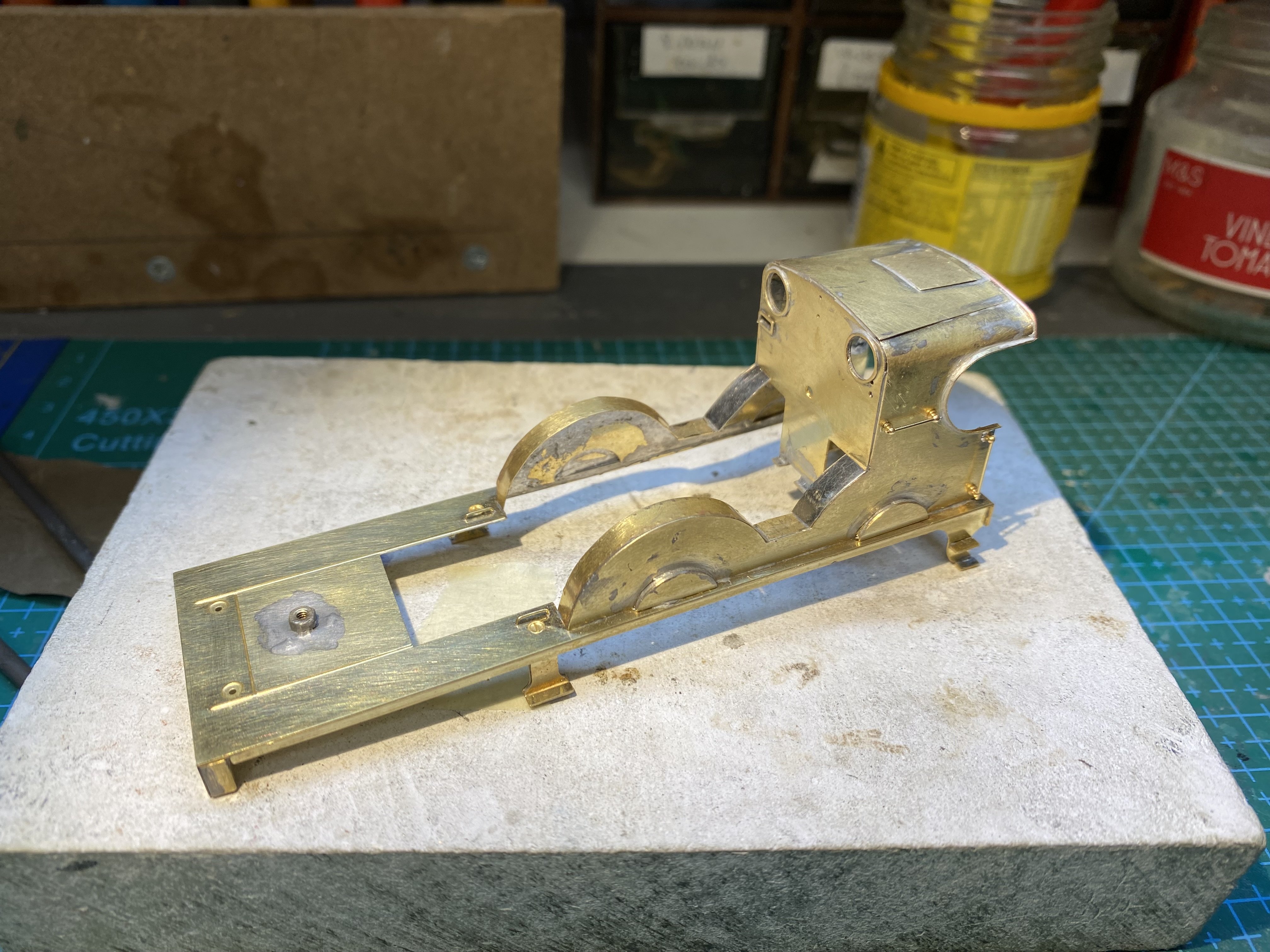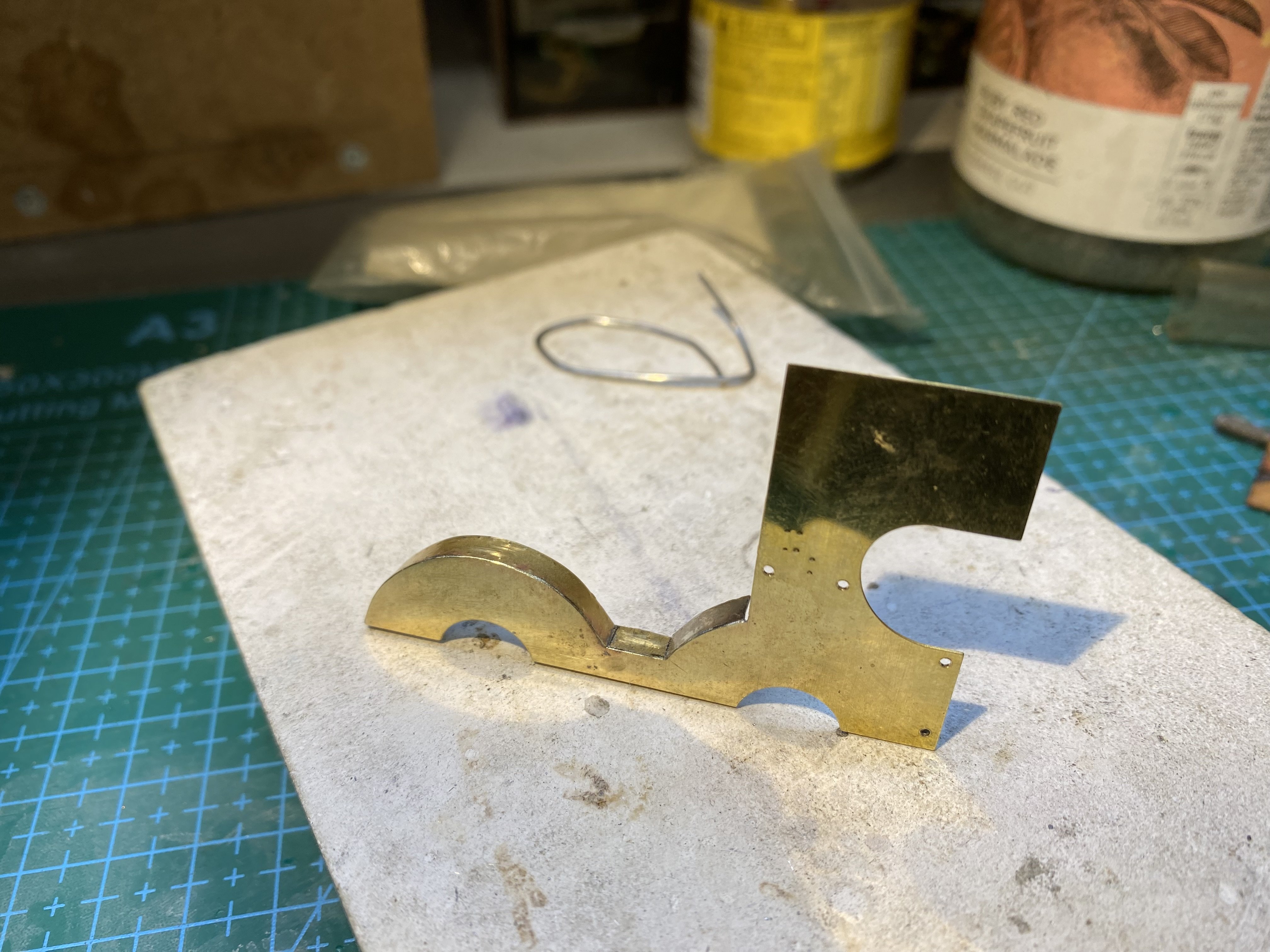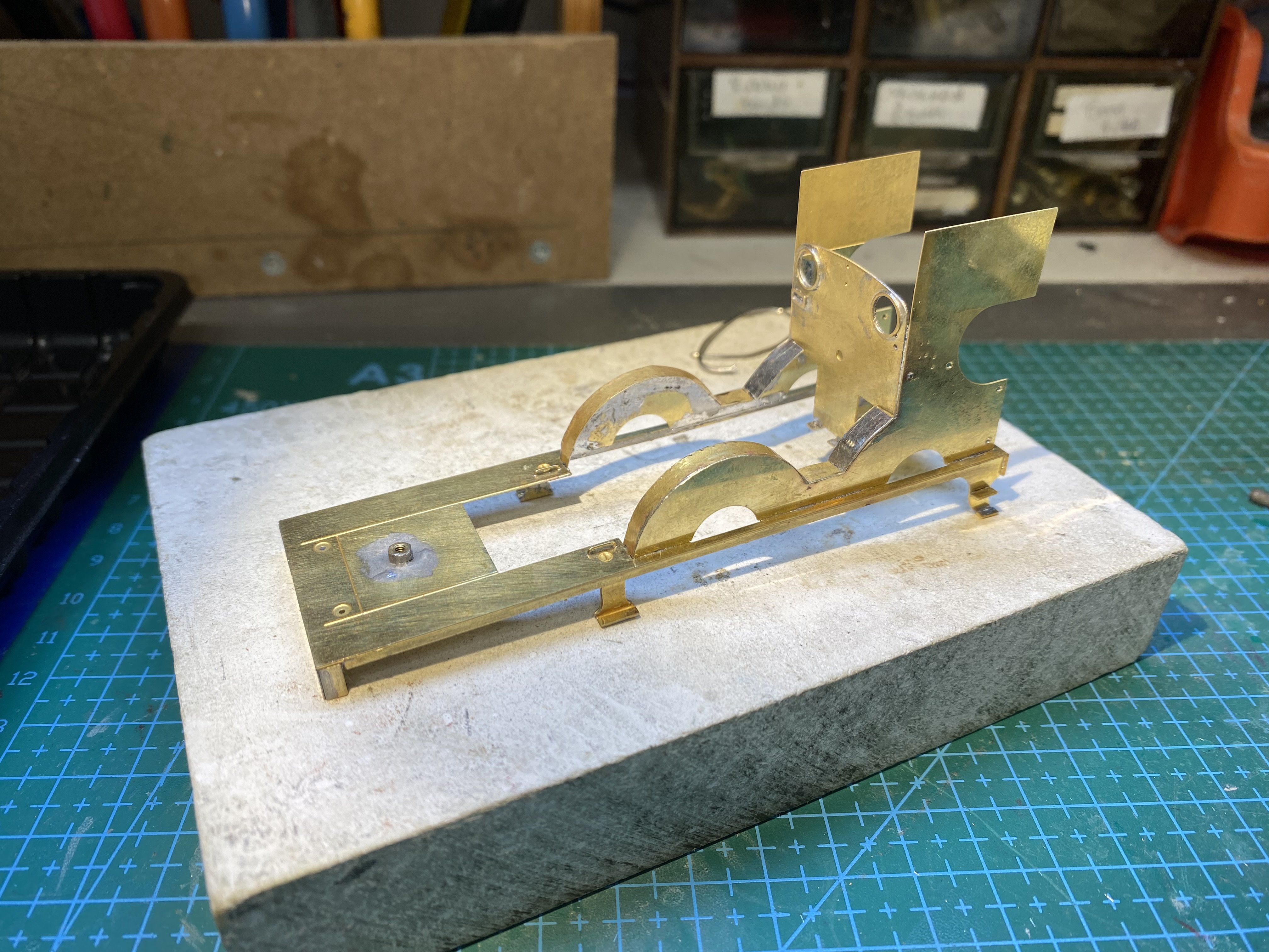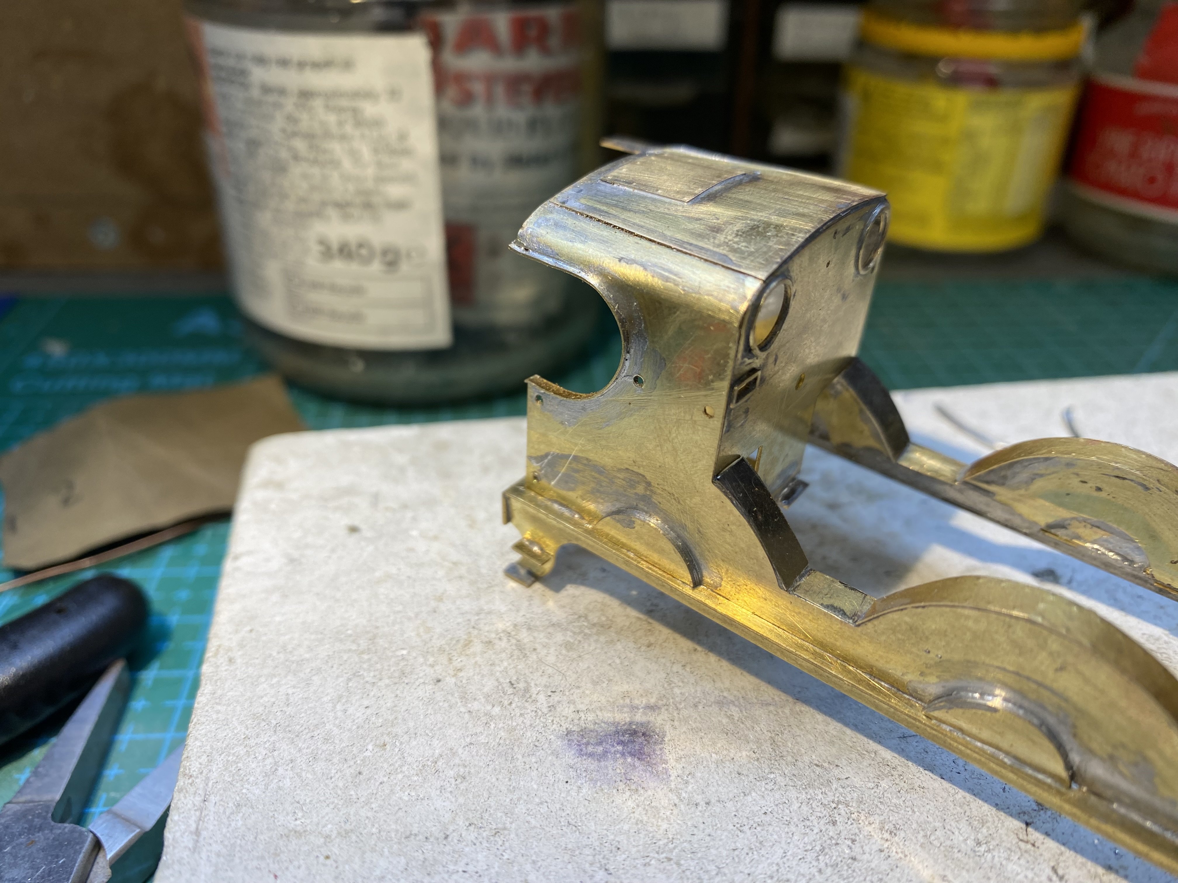 More work on Kieran's GNR(I) PPs. Pickups fitted and shouted at until they worked reliably... IMG_3925.MOV ... then a start made on the superstructure. Tricky stuff this, with a lot of soldering edge-to-edge in two planes. Difficult to keep it both straight and neat. This one will need a bit of filler here and there. The instructions recommend making cab beading from soft copper wire soldered round the edge of the curve, not on the face of the etch. I found this just about impossible to do neatly so resorted to my usual method of using scrap etch strip and filing it back. The little crankpin splashers were a job in themselves, each one laminated from two bits then soldered in place on the main splashers. I spent as much time puzzling over the instructions as I did making them. As is often the case with etched kits, head scratching and soldering require roughly the same amounts of time.
