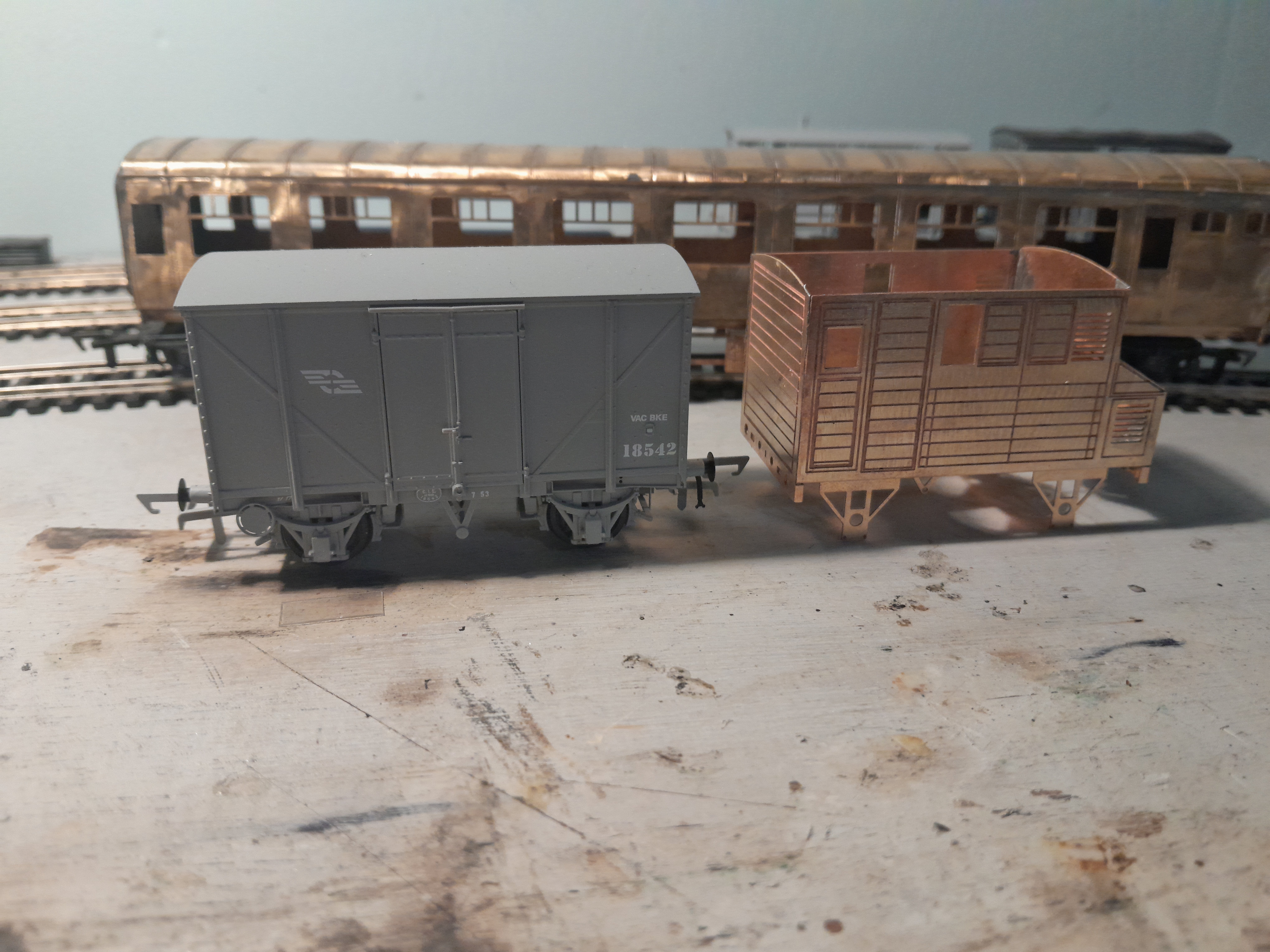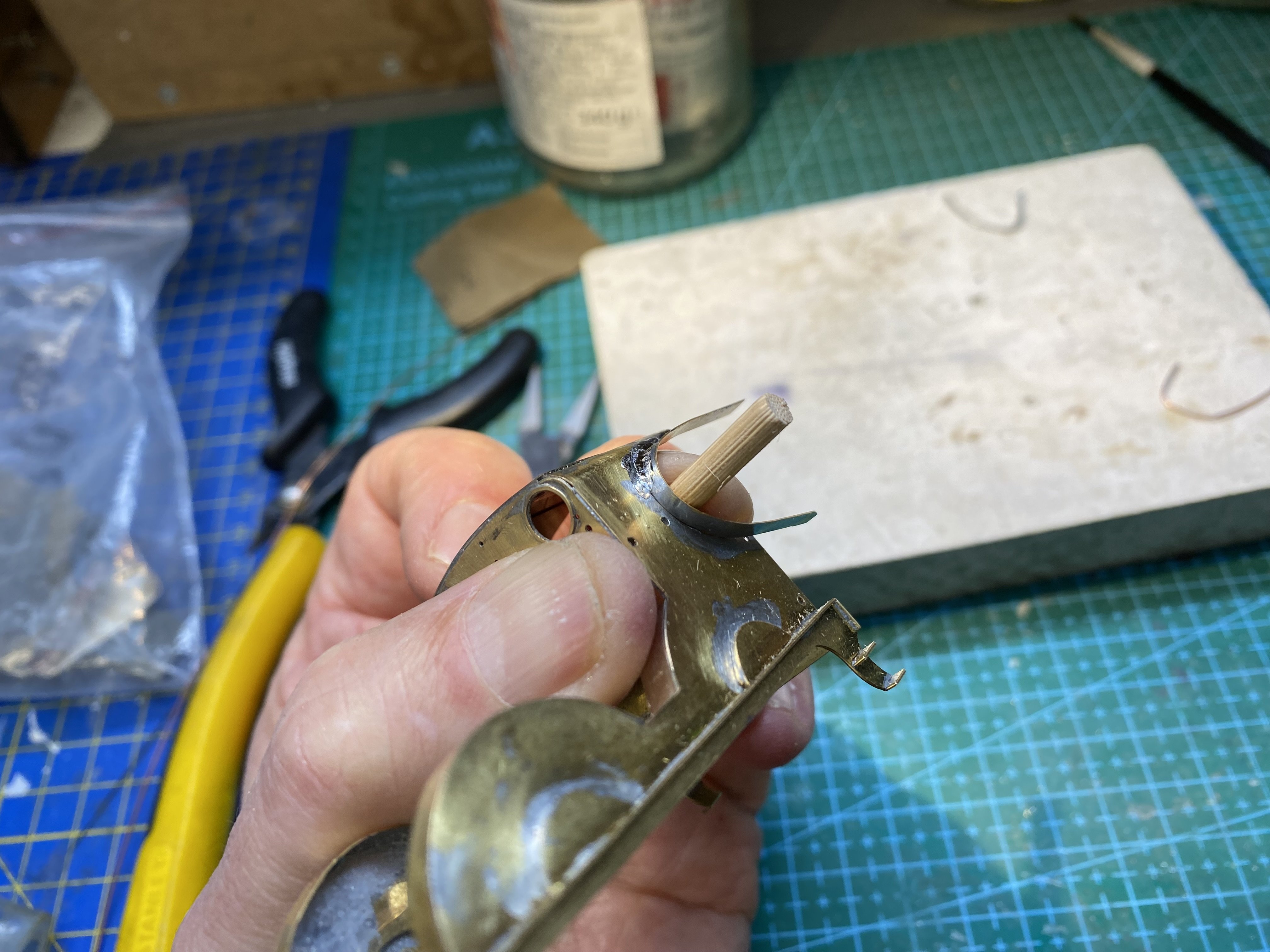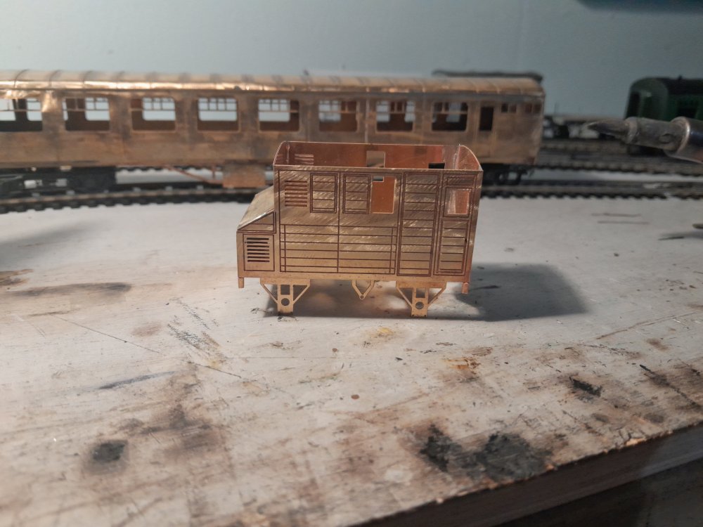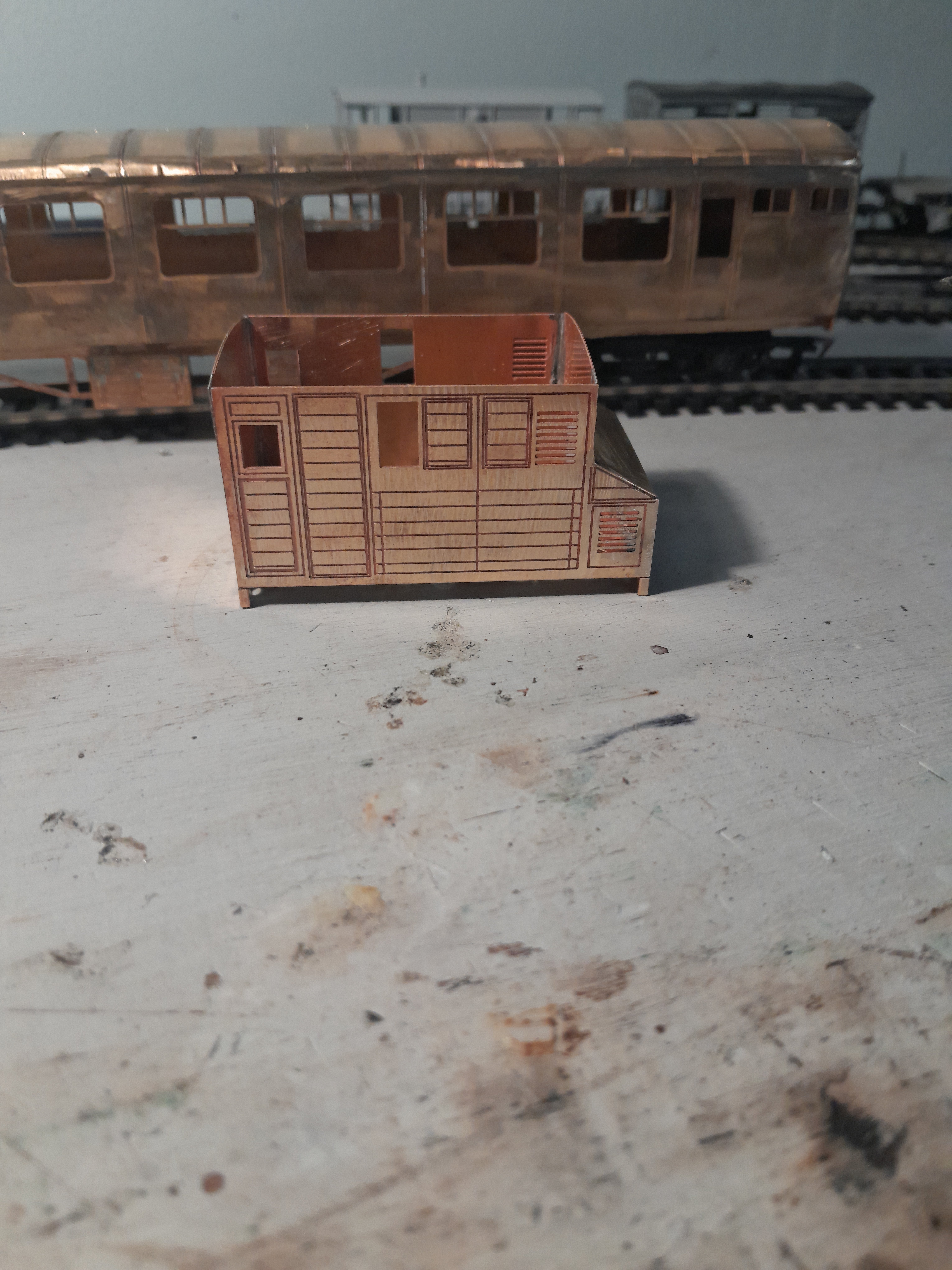 More work on Kieran's GNR(I) PPs. Pickups fitted and shouted at until they worked reliably... IMG_3925.MOV ... then a start made on the superstructure. Tricky stuff this, with a lot of soldering edge-to-edge in two planes. Difficult to keep it both straight and neat. This one will need a bit of filler here and there. The instructions recommend making cab beading from soft copper wire soldered round the edge of the curve, not on the face of the etch. I found this just about impossible to do neatly so resorted to my usual method of using scrap etch strip and filing it back. The little crankpin splashers were a job in themselves, each one laminated from two bits then soldered in place on the main splashers. I spent as much time puzzling over the instructions as I did making them. As is often the case with etched kits, head scratching and soldering require roughly the same amounts of time.