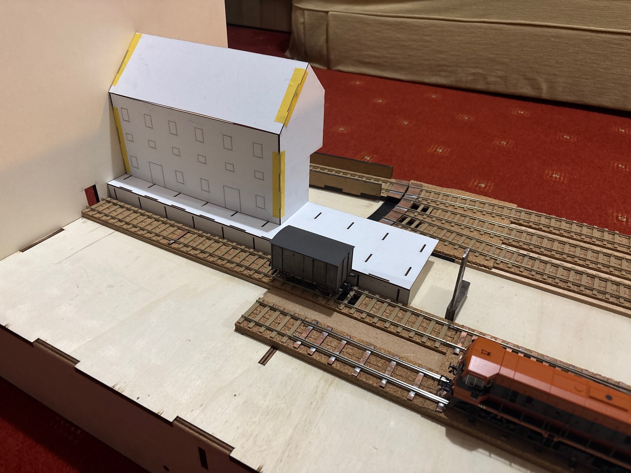 More progress with the mock-up buildings. I'm afraid that even with computer-aided toys, my progress at rough mock-ups is far slower than Darius's construction of complete finished buildings! This is definitely proving a useful exercise. With few absolute dimensions to work with, and photos from a limited range of angles, making the mock-ups helps me to see how the buildings fit together and whether the proportions look anything like the photos of the real thing. I've already identified some dimensional tweaks that are needed, but I feel I'm creating the right atmosphere. The 141 has yet to be re-gauged - it's sitting on the checkrails which are at 17mm gauge. -