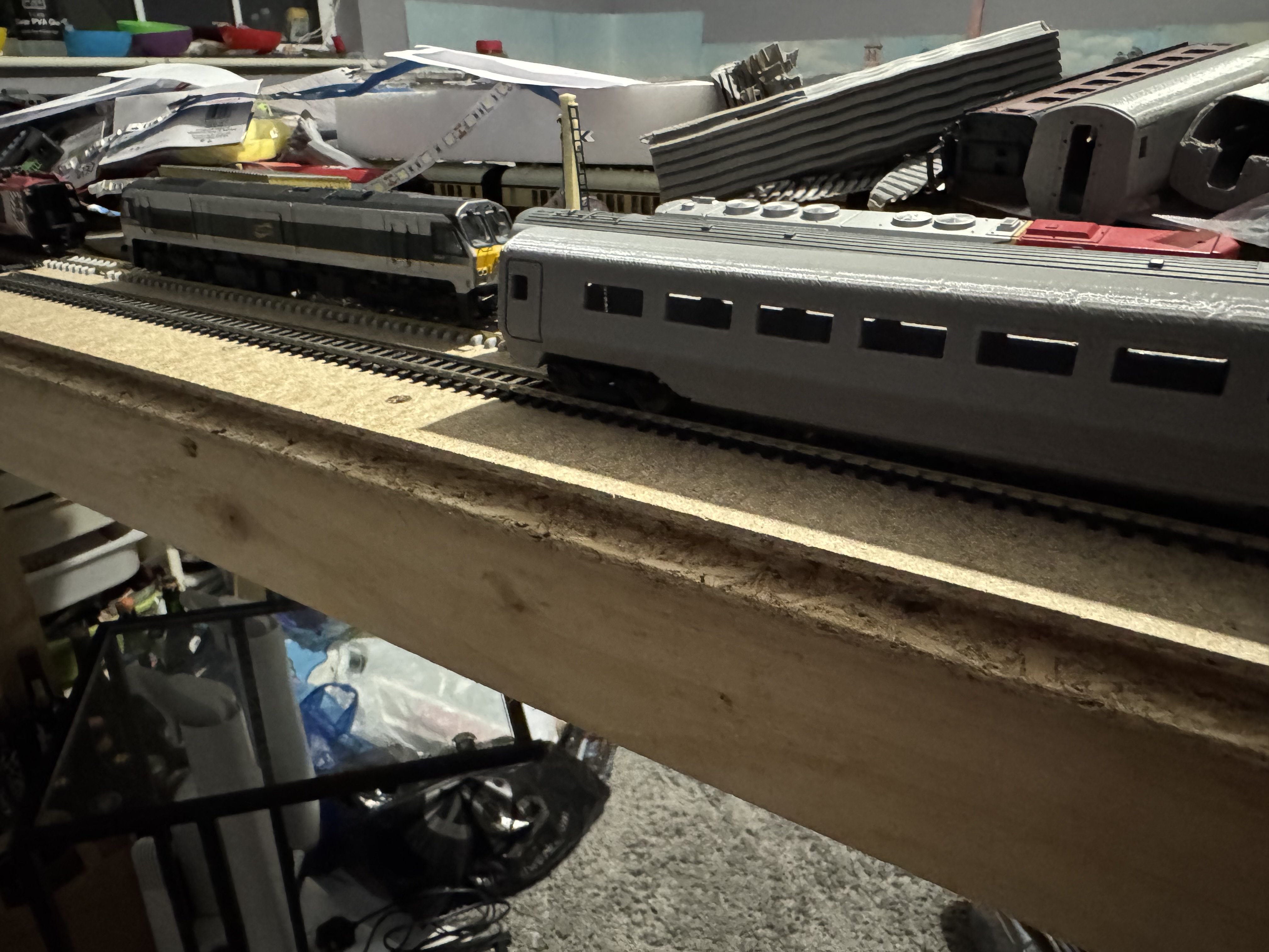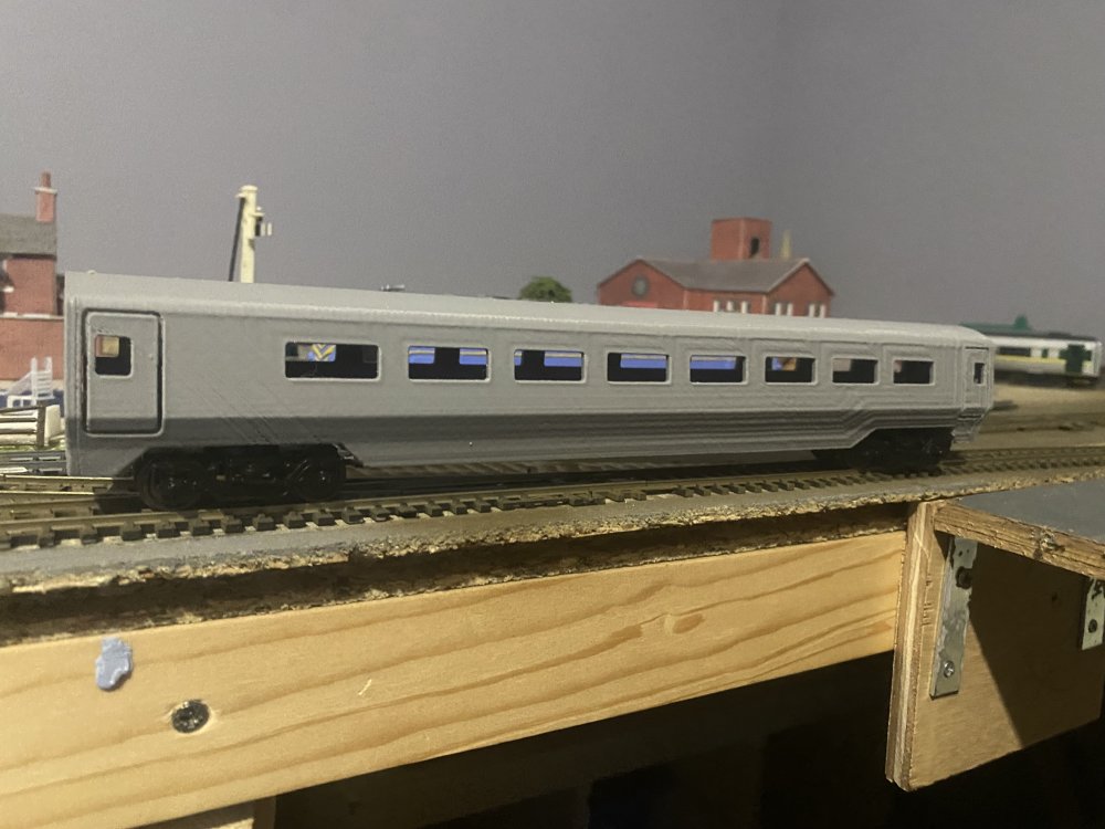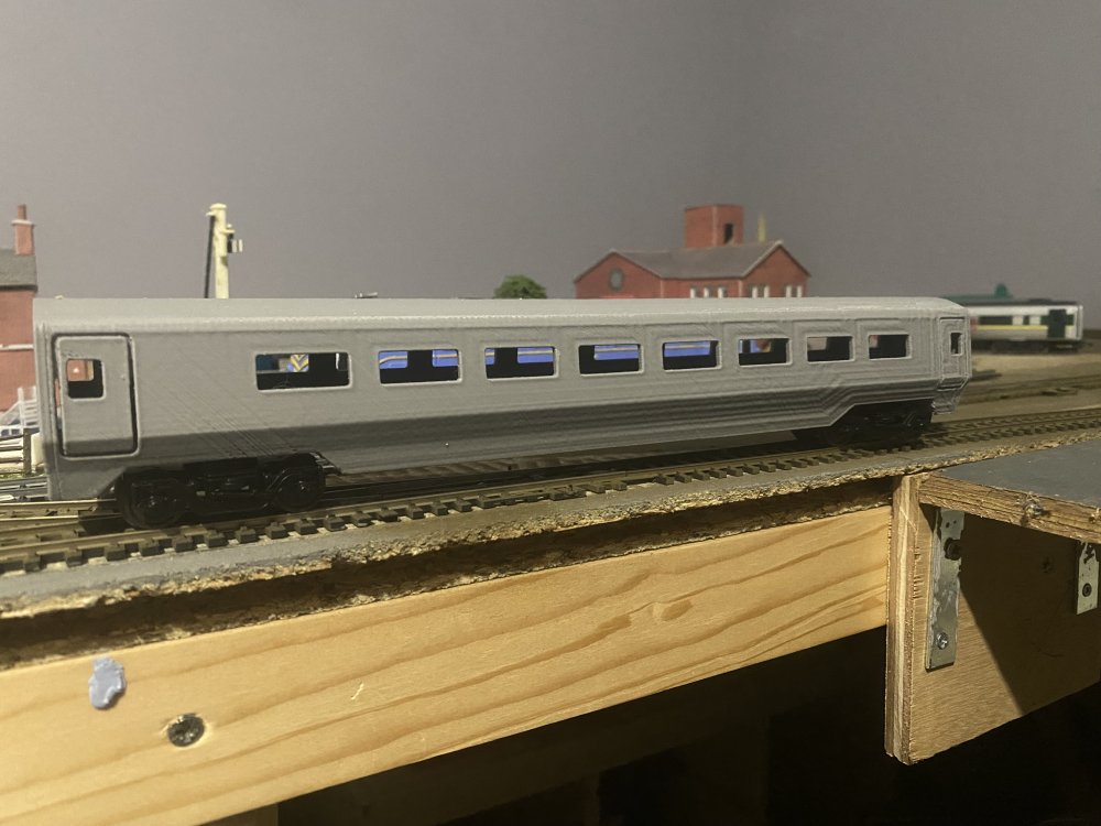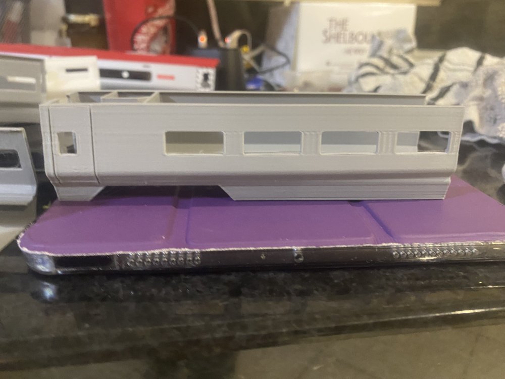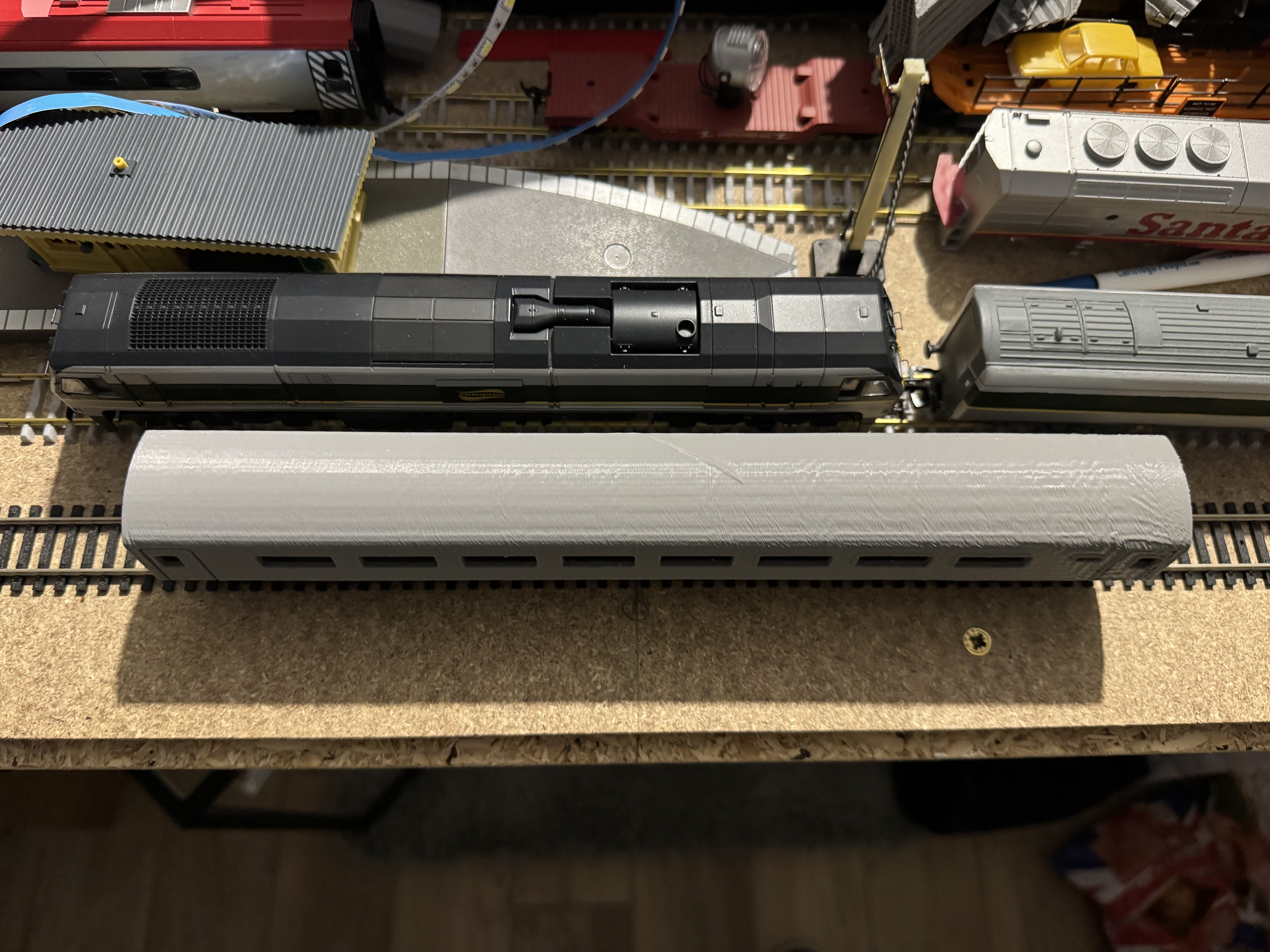 Here are the first prints I had done, attempting to print the carriages in halves and glue the together. This didn’t work with parts warping after being removed from the build plate. These videos are from the final, completed CAD designs. As it stands I am currently unable to print these as a whole entity but I’m looking into it and solutions for my second run of prints. My most recent print, a stronger and sturdier print. It is able to hold the bogies without the floor imploding, and I’m generally happy with the overall finish. I can’t reach the internals of the carriage so I will just post process (ie sand and paint) them and then use tint plastic to fill in any windows. I’ll do more updates and background info as I continue working on these! Note, I don’t know how to add the specific files in a specific order. The halves are pretty obvious as are the videos. The clear photos of the carriage by itself on the layout was my first ‘successful’ print, which has since imploded but is good test dummy for learning to spray paint. The most recent print is sitting beside the 201 on the messier side of the board. RPReplay_Final1753187001.mp4
