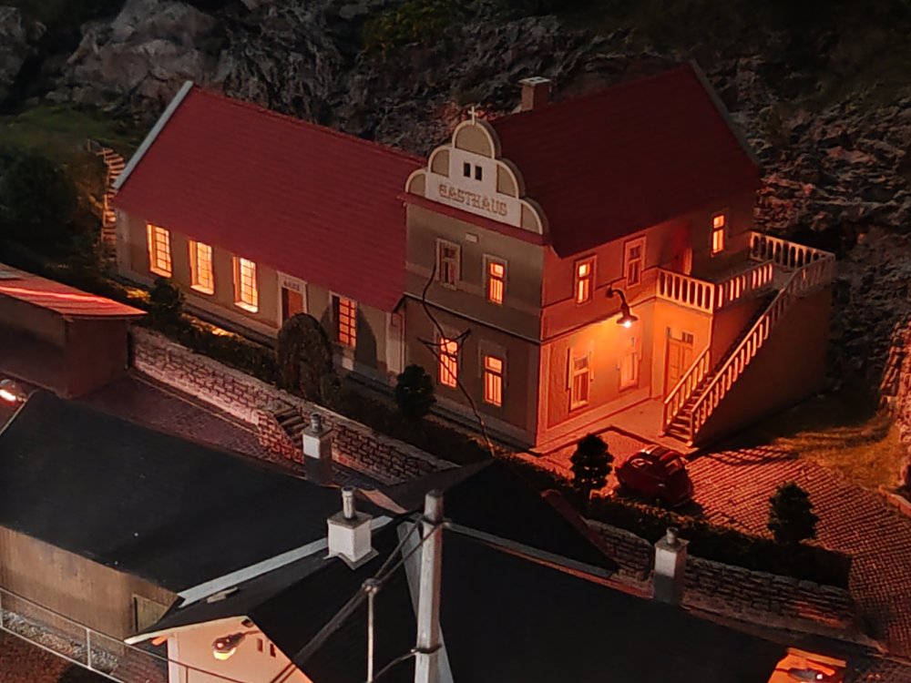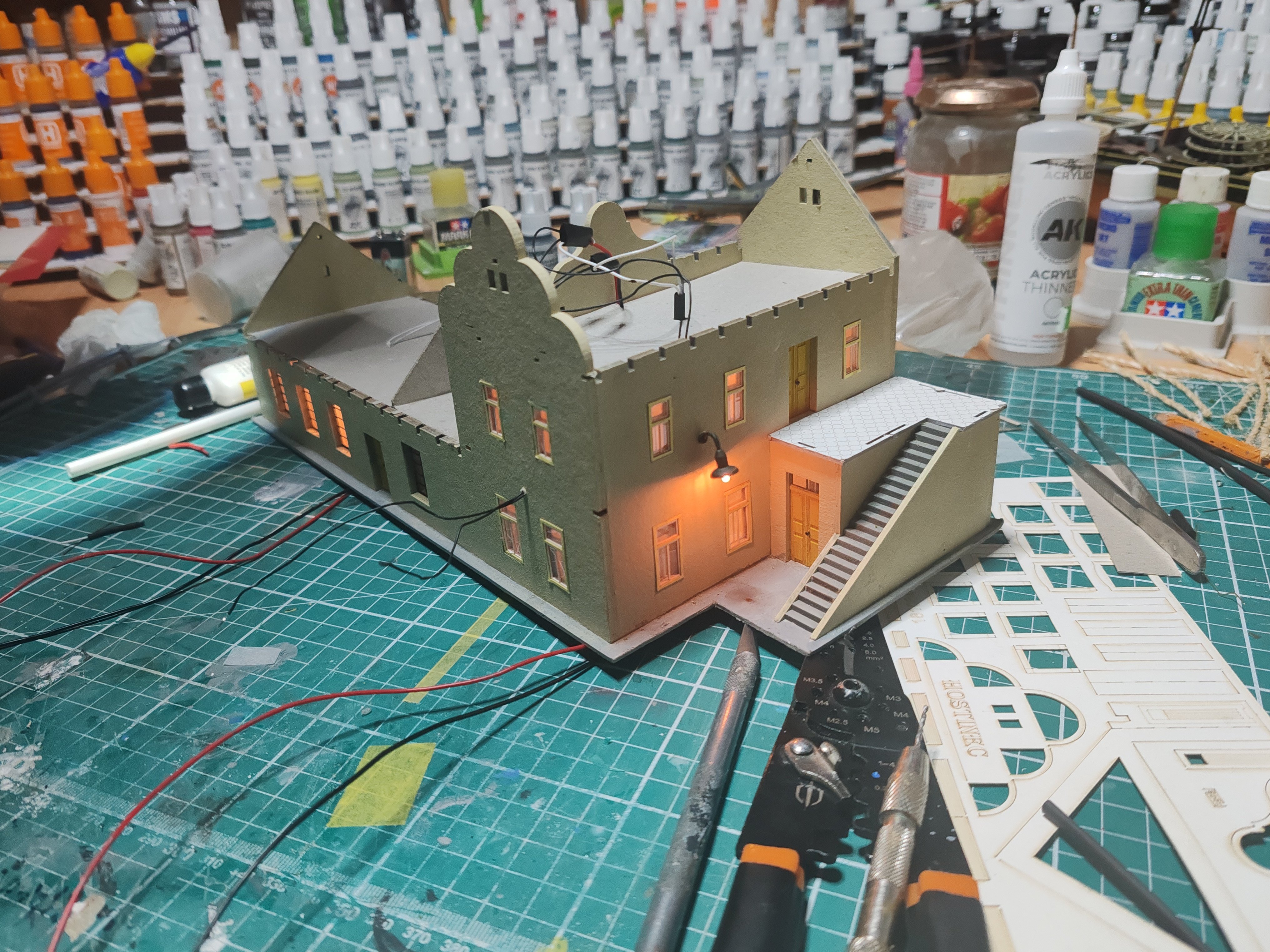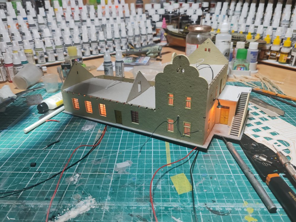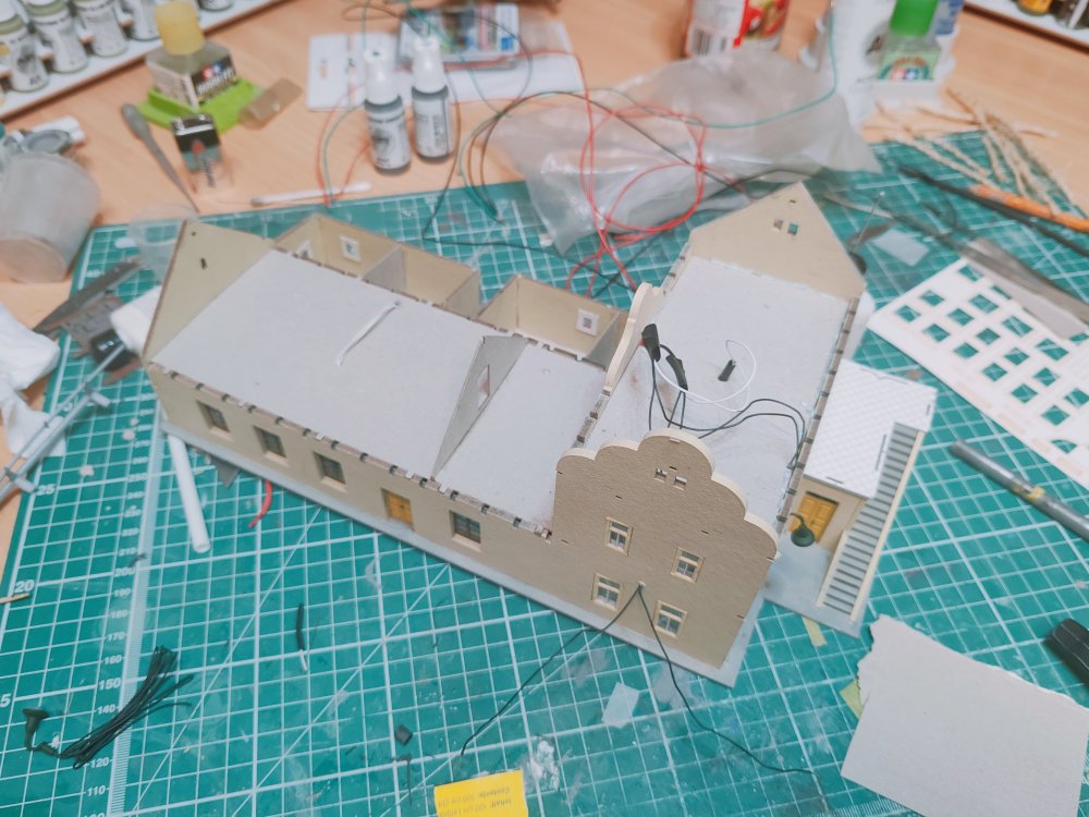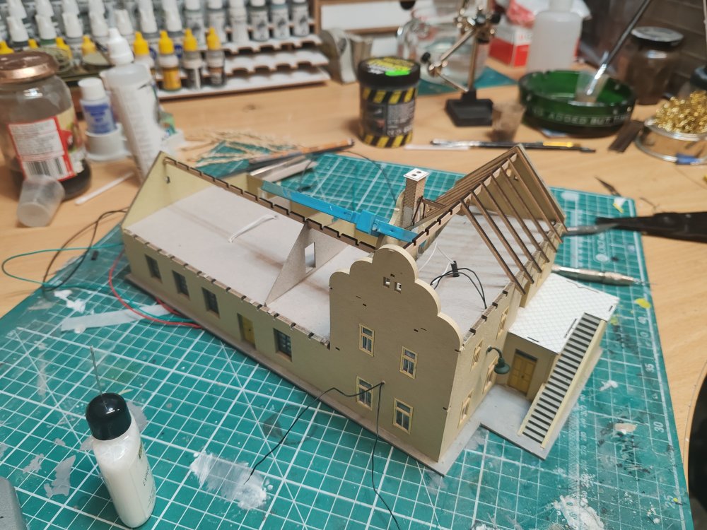 Finally got the Guest house wired and roofed and looks nice and finishes the setting. This was laser cut card and wood from Igra models. Excellent kit and quality. -