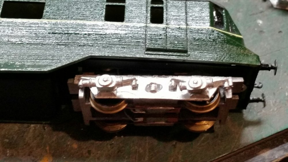 A bit of time today, avoiding the blow meant along with a delivery of tiny castings the GWR railcar has lurched forward with bogie side frames fitted on one side. The axle end gear box comes as double drive ended add on casting to the basic side frame so in BR days the double drive was removed I have trimmed back to more like photos. Body is a shapeways grainy affair bit having had quite a bit of sanding does look ok Power bogie is a blast from past it is a Mike Chinery 12mm NG power bogie intended for Irish NG railcars but is a lovely runner and railcar does not need to shoot about like an HST so works well on Branchline layout. robert -