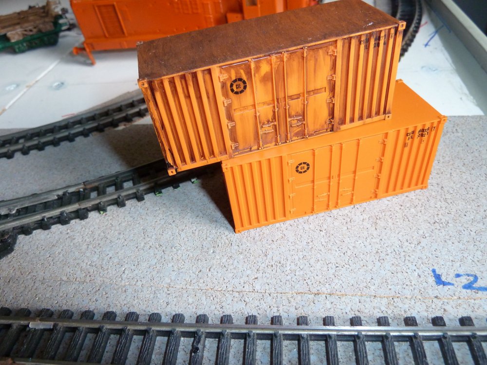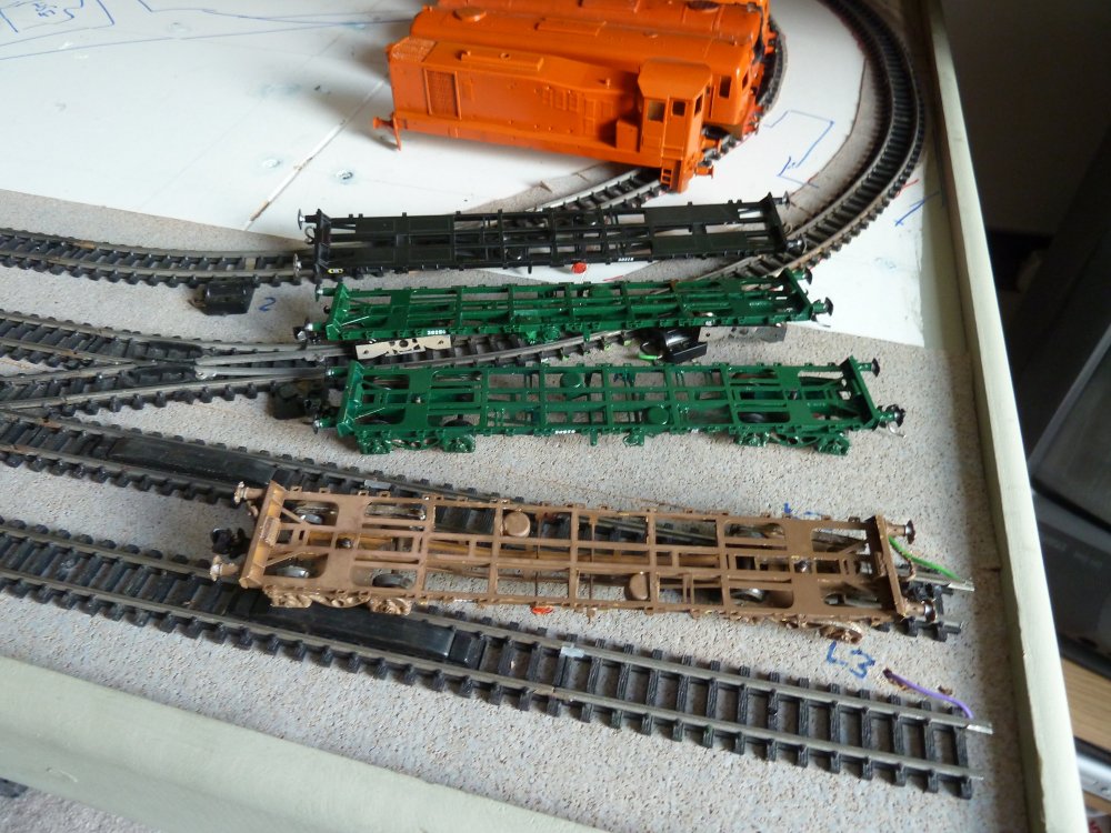 Well the green barriers numbered and a 20foot CIE weathered also a 47 foot flat for the Sperry just awaits bogies. so orange works in the back ground as well. Three SSM brassgami and Shapeways 47 footer , bogies on the way from SSM.