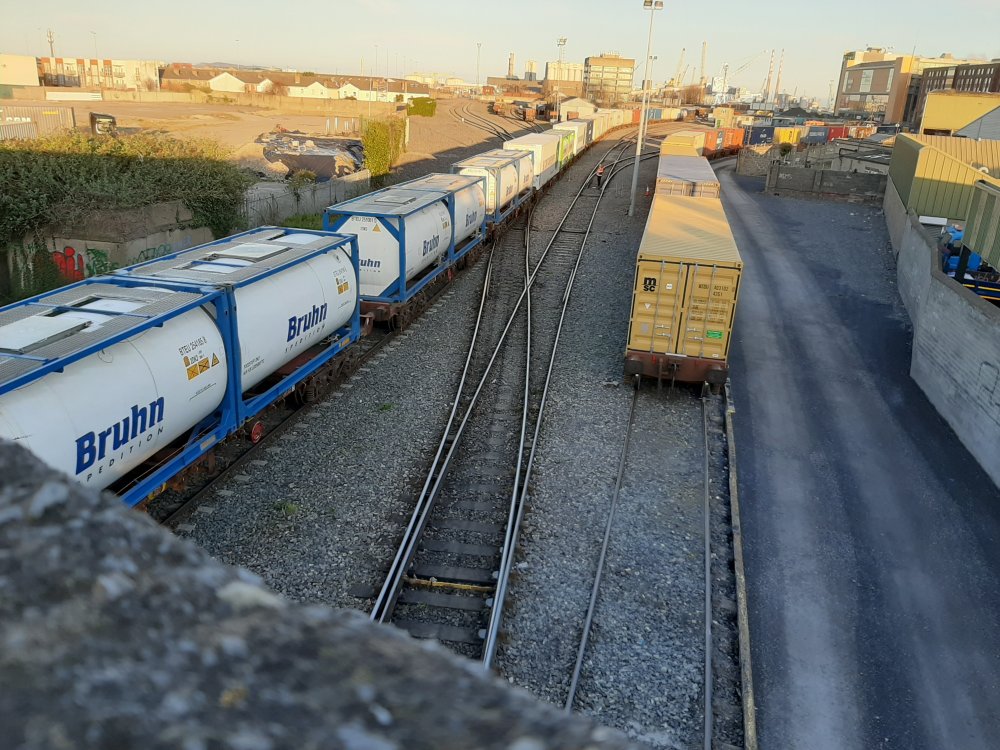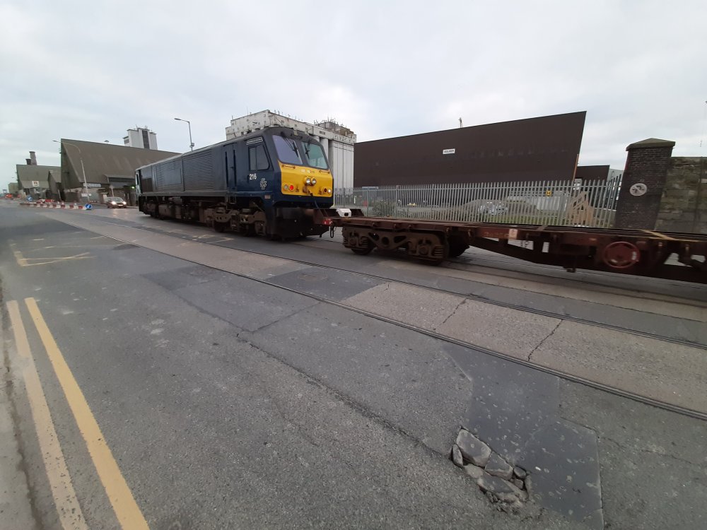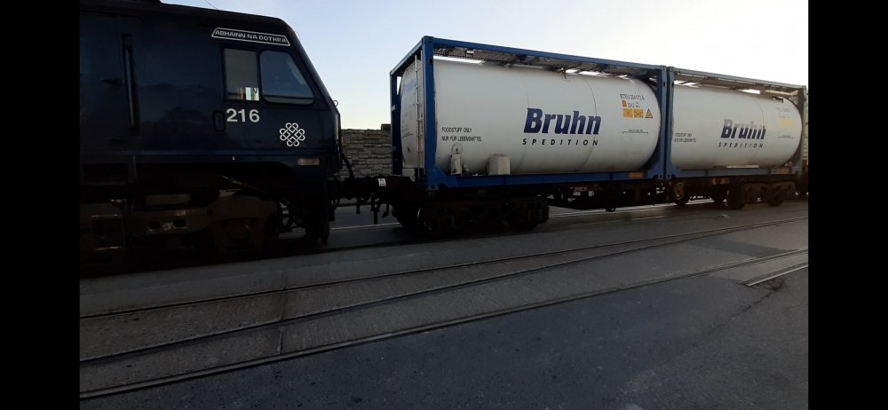 216 (used to pulling the Belmond Grand Hibernian) was leading something less glamorous, but still exciting at North Wall today! Reversed out of the East Wall yard before heading down Alexandra Road to Dublin Port with a lengthy container set. Never saw such a gleamingly clean set of tanker containers- was like they were washed and polished! Great to be able to see this freight actionat such close quarters still.