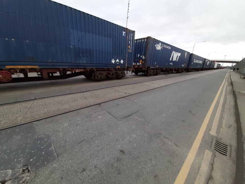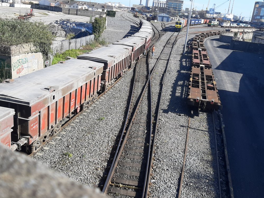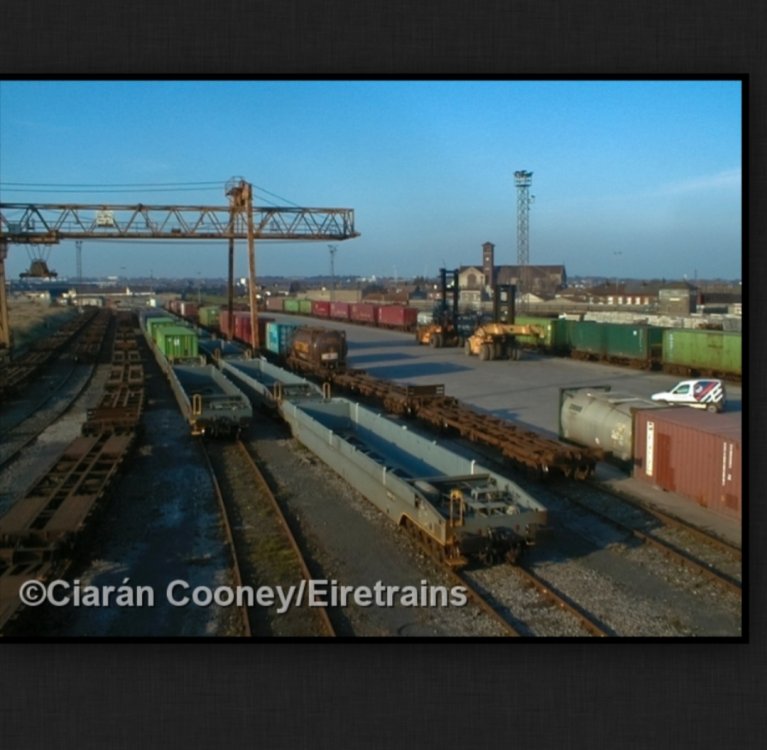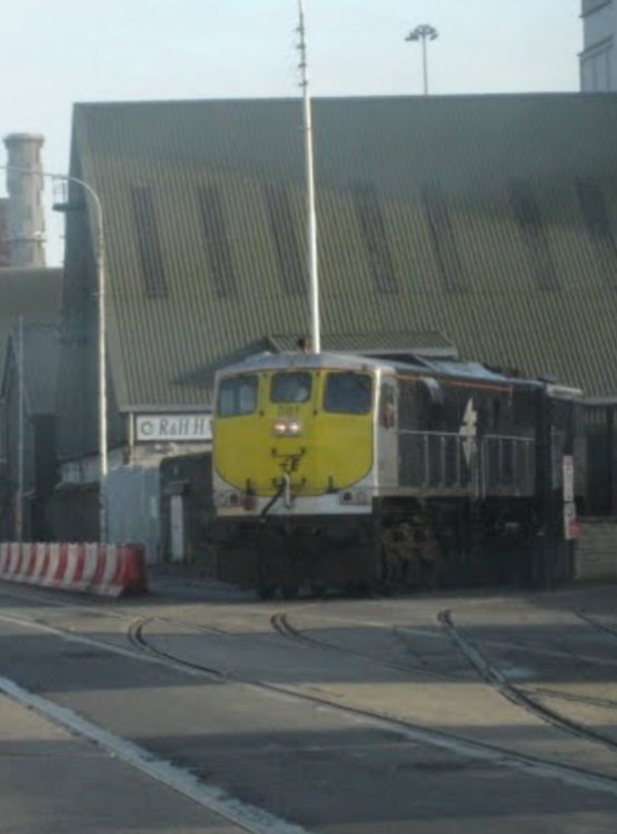 At one end in Ballina and at the other end, in Dublin Port. IWP container and Tara Mines trains travel through North Wall and onto Alexandra Road before disappearing! Never seen any photos of what happens once the trains leave Alexandra Road. Understandably, given the nature of the loads carried in the Taras we never see the unloading of that but would have thought some records exist of the container unloading at Dublin Port. Maybe some day....!!! Photo below of 081 reappearing onto Alexandra Road from the port.