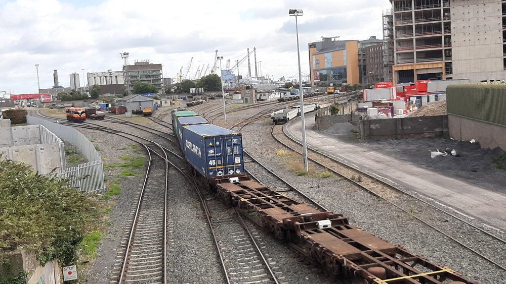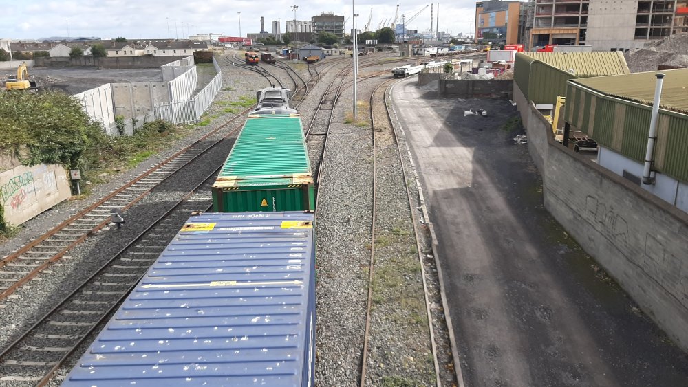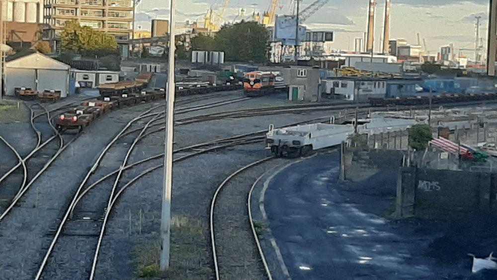 086 arriving in North Wall from Ballina today 26/9/22 with the liner. 071 (gleamingly clean again) on maneouvres down Alexandra Road shunting the Taras. Busy day!