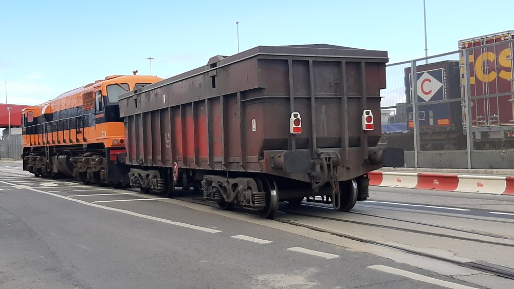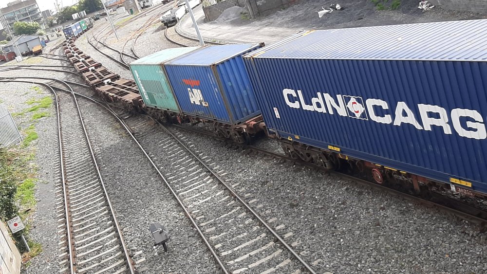 085 heads up the liner waiting at Heuston North freight yard before going to Ocean Pier after earlier arriving from Ballina. 201 idles in a siding.