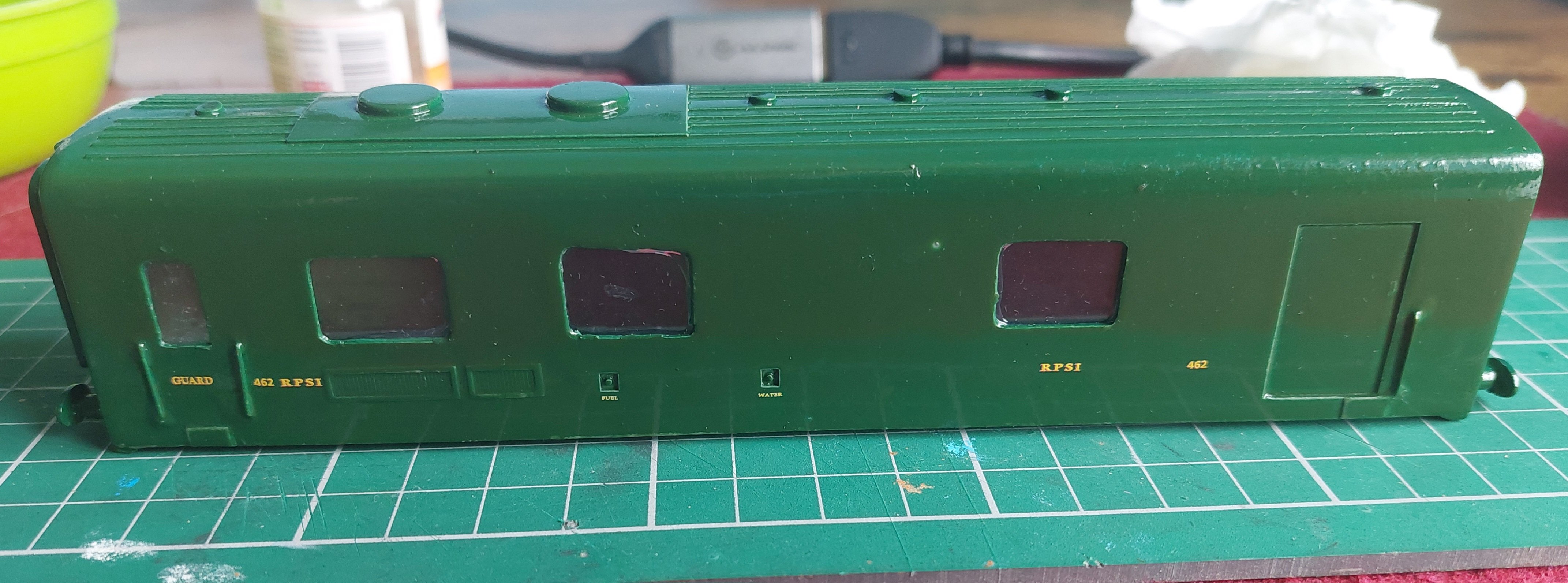 Well bank holidays are good for getting up into the attic and spending a few hours on the hobby. Today was more painting of 171. Transfers ready when the paint is dry, some additional detail painting in cab, a crew, and final touch ups before sealing. Almost there.