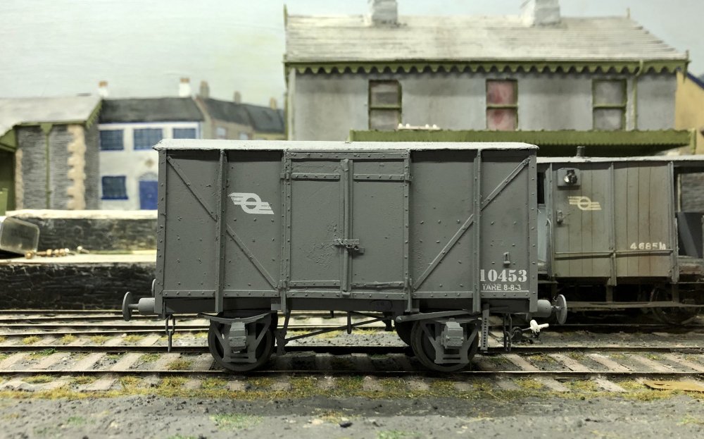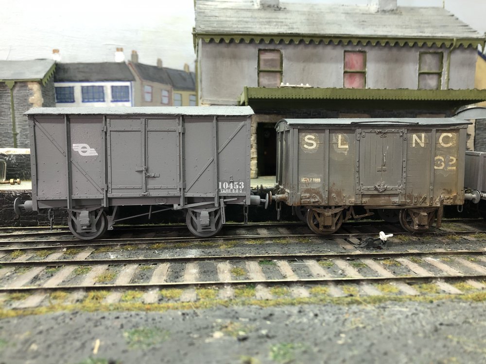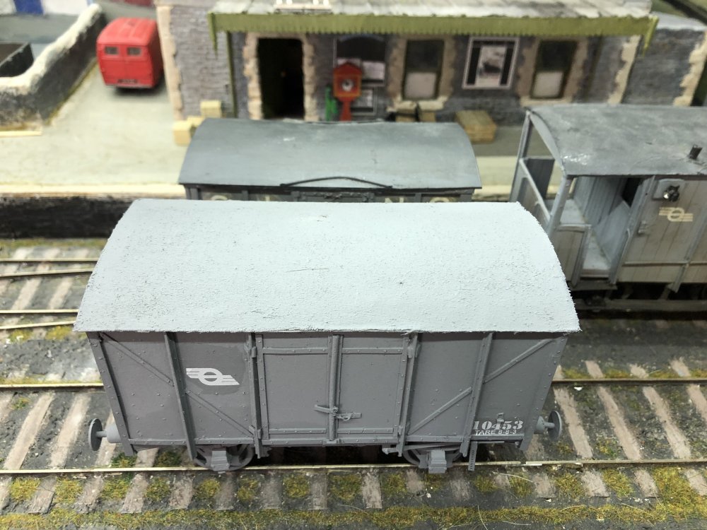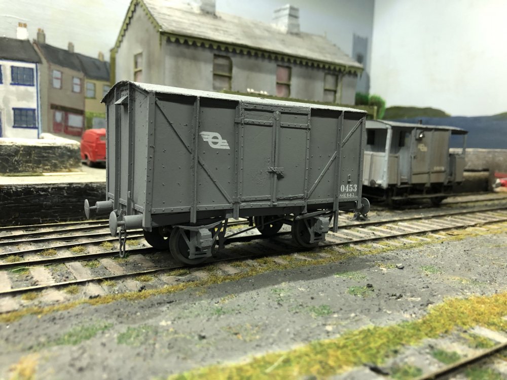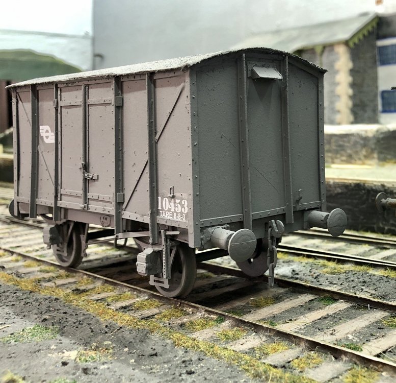 One of my favourite SLNC pics hangs on my wall at work - it shows a ‘Holy Well’ or ‘Garland Sunday’ excursion at Glenfarne. Lurking on a siding is an H van, which although only in traffic since 1953, made regular appearances on the Sligo Leitrim up to closure. So I had to have one. As pics above show, basic plastic structure on an Alphagraphix chassis. A card kit from that source gave the dimensions, and one of @Irishswissernie ‘s excellent pics gave useful info. Pics below illustrate various of the themes above - including my attempt at a tribute to the original picture! Also a shot alongside my SLNC van shows how small traditional Irish vans are by comparison. And if @leslie10646 can have a consignment clip on his 4mm H van - I had to try and include one! Sorry the images are all over the shop and not in order, taken at various stages in the finishing process. And just for @jhb171achill, no black ironwork in sight ! Few useful learning tips from this including use of Limonene solvent, and a real fabric roof, ‘doped’ with PVA to seal the nap. It’s not perfect by any means, but given that I almost reduced the underframe to scrap during construction, it could have turned out worse! https://www.flickr.com/photos/irishswissernie/6593632857/in/album-72157628618688939/