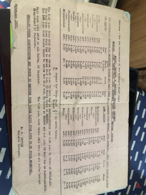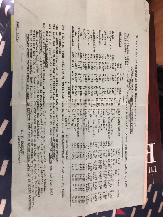 Thanks Mayner. The prototypical example of a pilot loco being attached for a short turn at a station about 5 miles from Sligo helps resolve a neat operating dilemma for Rosses Point! Funnily enough I received 2 WTTs in the mail from my father today - SLNC 1950 and 57. Fascinating as ever. Small things one never noticed - the 7:20 stopped at Ballygawley in 50 but not 57. Also interesting to see the movements of staff and ticket. It also includes that wonderful WTT phrase ‘runs as required’. That 1115 goods out of Sligo was critical for steam fans - When it ran, it brought the bogie coach from Sligo ready for the 7:20 pm ex EKN. When it didn’t run, there was no coach and the 7:20 was served by a railcar, much to the chagrin of some unfortunate visiting enthusiasts ! Presumably there were additional cattle specials with separate notices.