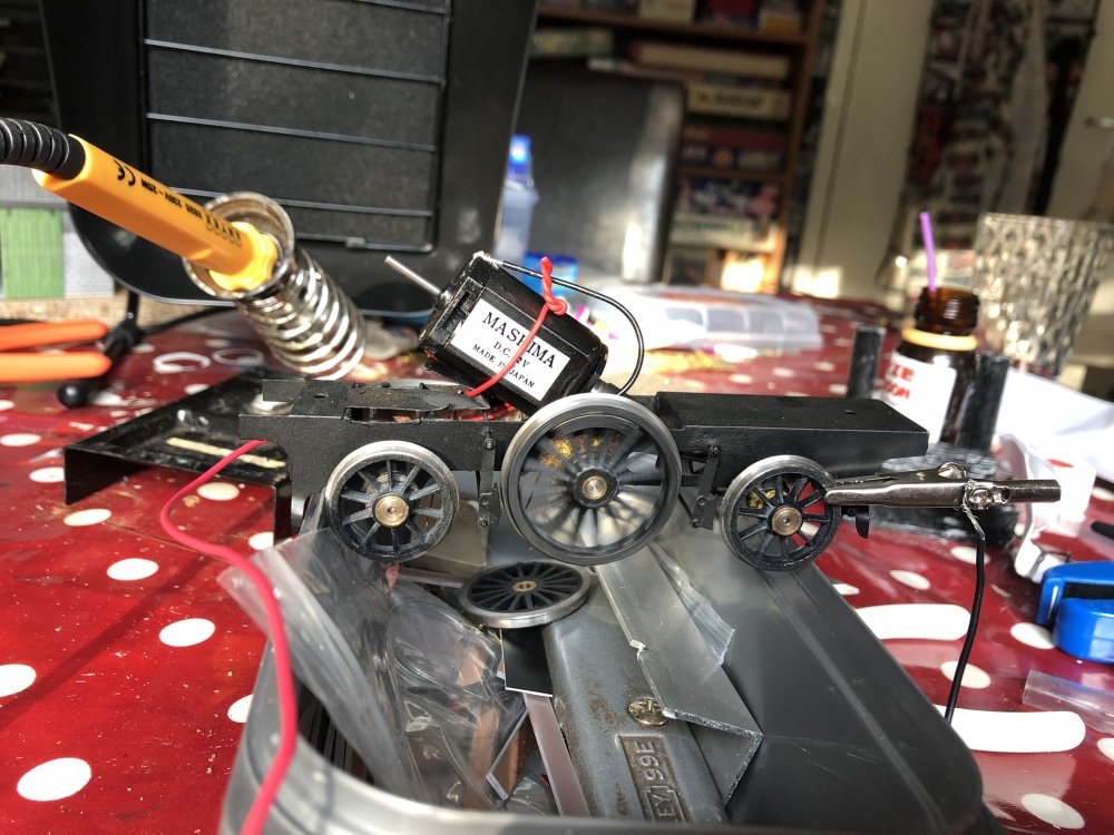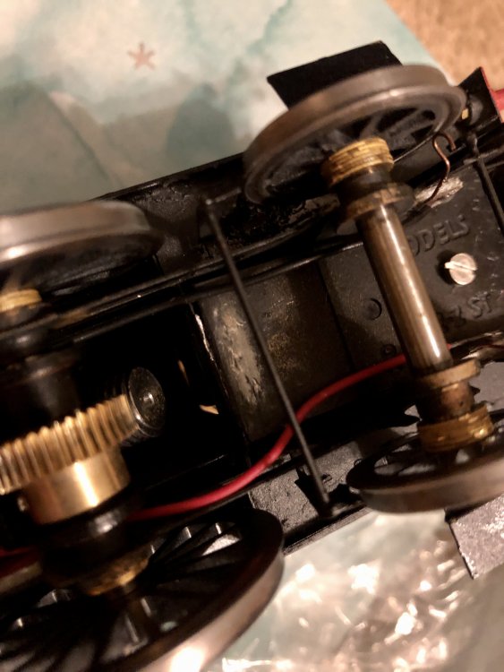 I spoke too soon! Through repeated testing and adjusting since the chassis was built earlier this year, the bracket in question has weakened and tonight it snapped - you can just glimpse the bright metal to the right of the gear wheel. Too late to tackle tonight. But will strip the loco tomorrow and clean the joint area with a fibreglass pencil before soldering back together....I did also use the opportunity of having the loco upside down to stick more lead over the front axle so hopefully when all does go back together it will work better....thankfully I know at least one other builder - who is incredibly skilled and can make such beasts as 8Fs from scratch - who has really struggled with this little kit!