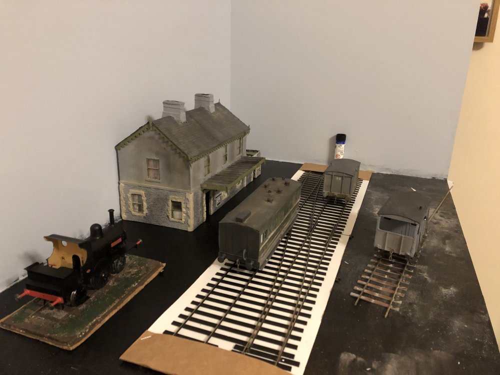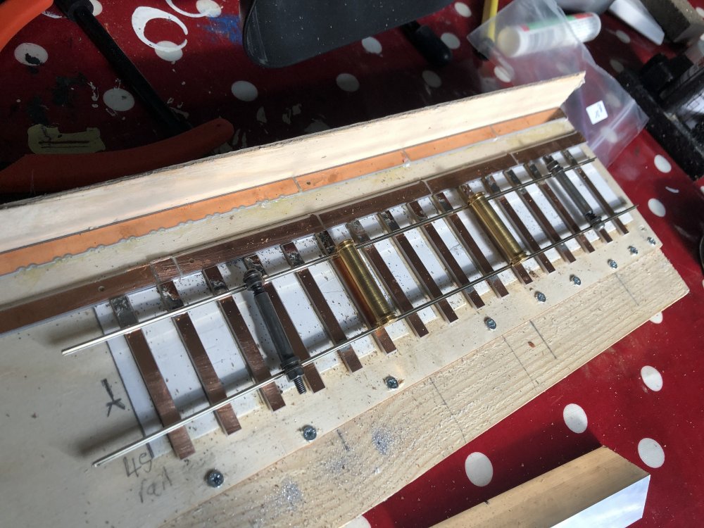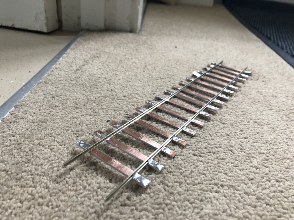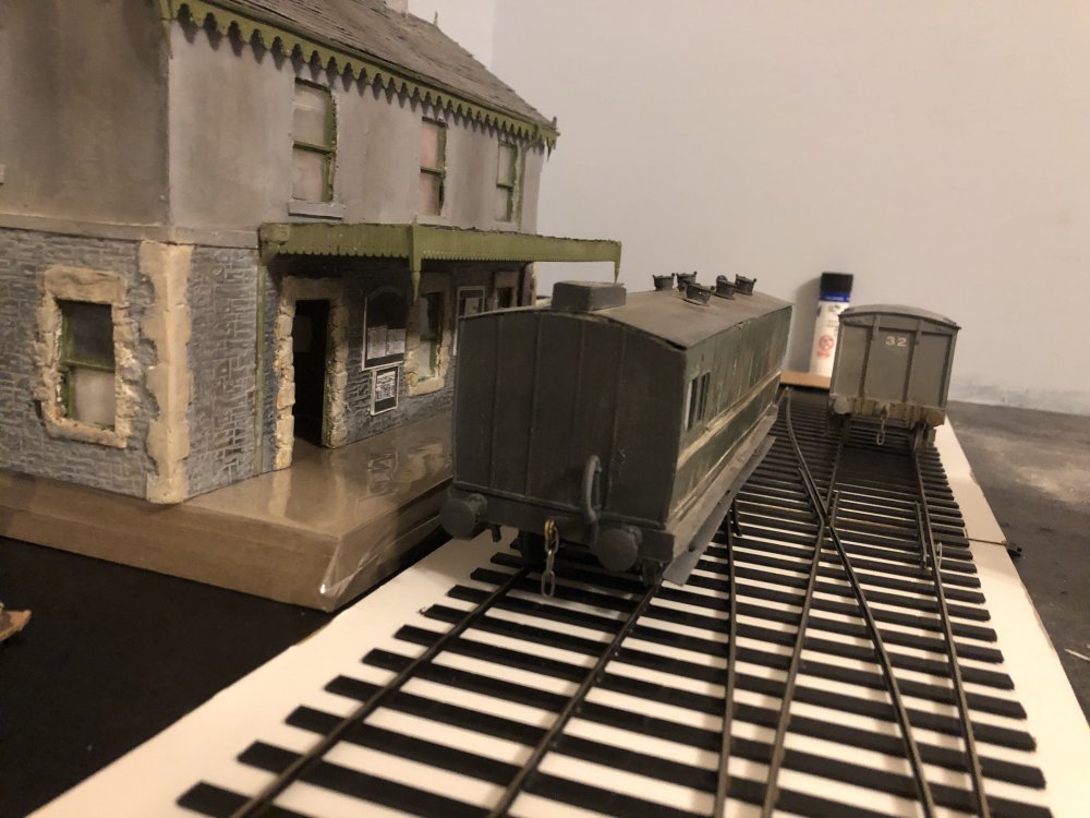 A huge leap in progress today - by tackling two jobs that I’d been avoiding....track and a working loco. Both fairly key elements in a model railway... Permanent way first. The soldering is rather dodgy but that will get better. I made the mistake of using too large an iron and the joints are solid but not neat. Smaller iron next time. Excuses over, I give you...my first panel of 36.75mm track. One of the frustrations of not doing a sensible RTR project is that, well, nothing is RTR, so everything takes a bit of time to get things together. I’d put off doing track due to a bit of a hassle experienced when cutting out the jig a few months ago. But I can’t put it off for ever. So I promised/threatened myself that as soon as the station building was done I’d start on the track. And it’s the standard SLNC 45’ length so at least I know that’s right! And to cap it all off I managed to motorise my first ever Irish loco today....the prospect of fitting pickups etc rather spooked me but here’s this afternoon’s work - including a short video.... IMG_1167.MOV