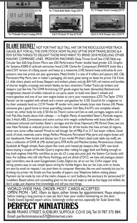 The last of them ended up in Suffolk, in the hands of a one-off character called Peter Hunt, former proprietor of an infamous model shop - Chuffs, later reincarnated as Perfect Miniatures. His adverts in the gauge O Guild were absolute classics of British humour. A sample is below.