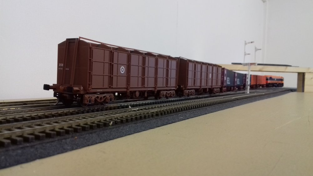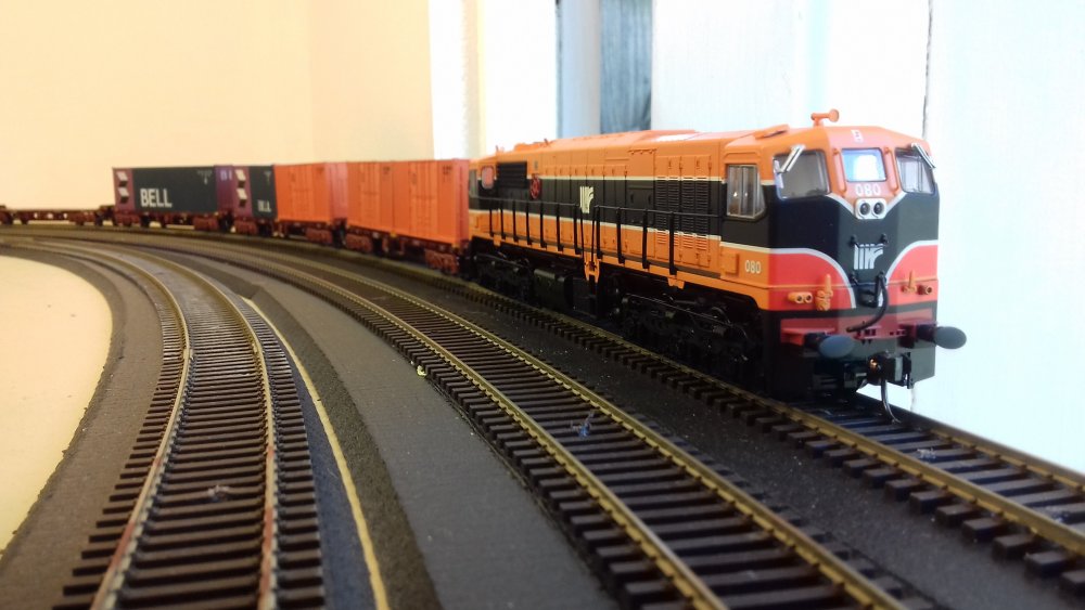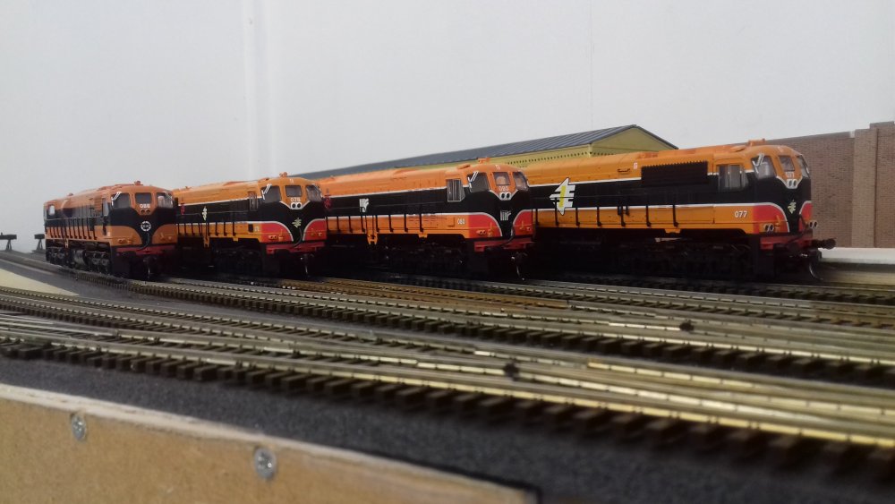 I managed to solve the problem with 080 in DC mode at least, now need a chip for her and new arrival 078. I spent an hour or so putting kadee #18s on the container flats and then made up and ran a liner train. I have reasonably generous curves (just ask the wife) so I am able to use the #18s with no trouble at all. The working buffers really come into their own, especially when propelling this lot back into the yard. The fleet at rest - I have a 201 as well, but it's too big and ugly for my little railroad. My next loco will be something very closely related to the 071s but also rather different...