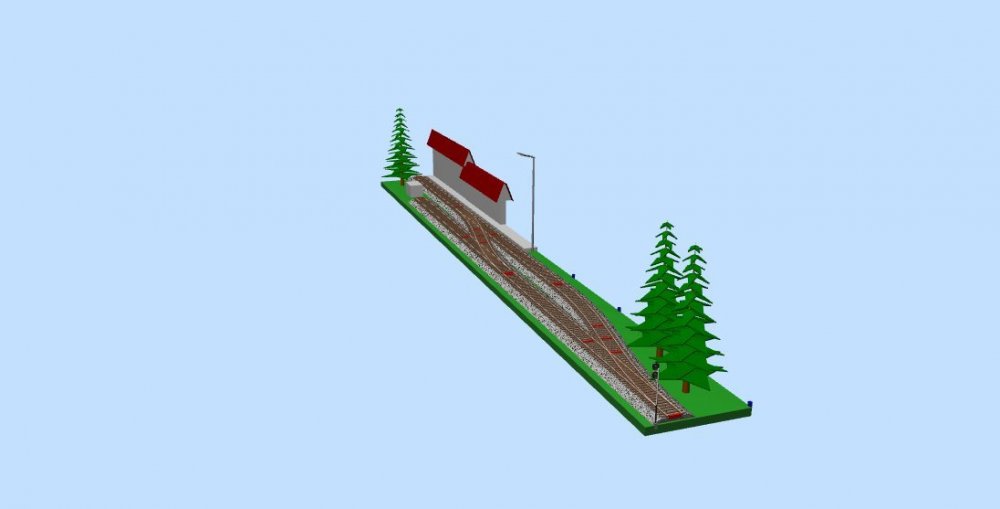 An impressionist continental European micro layout (HO, 48 x 5 inches) Single railcar arrives at the platform across the second set of points, passing wagons unloading along the loop. Station and goods shed in a single range, weird looking hut, strange lamppost, puzzling signalling... Based on Fintona, which had a surprisingly continental trackplan...