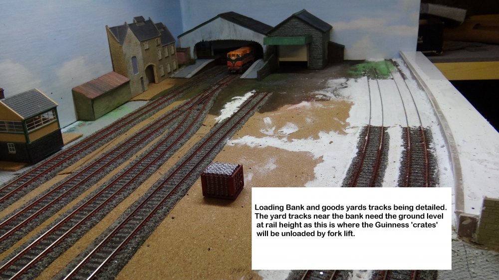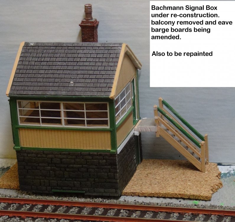 With the temperature in the loft now down to bearable level and even more importantly Mrs B , No. 5 offspring and son-in-law in London for the week and therefore only me and the dogs in residence; work has re-started. I wanted a long cattle/sheep loading bank ,one of the main features of many Irish stations but now invariably overgrown with the demise of livestock traffic. Mine runs along the front of the right hand baseboard and will be used as the Guinness storage facility. The tracks in the yard have had the ground level built up to rail height where the bogie Guinness flats can be unloaded by Fork Lift; the 4 wheel flats can be unloaded direct from the loading bank by fork lift as the wagon 'bed' is higher. I have been converting the Bachmann signal box to look a little more Irish with the removal of the balcony and re-positioning of the steps. The end barge-boards have also been amended. Only 2 more weeks of the school holidays to go and then I should be able to crack on in earnest! Ernie