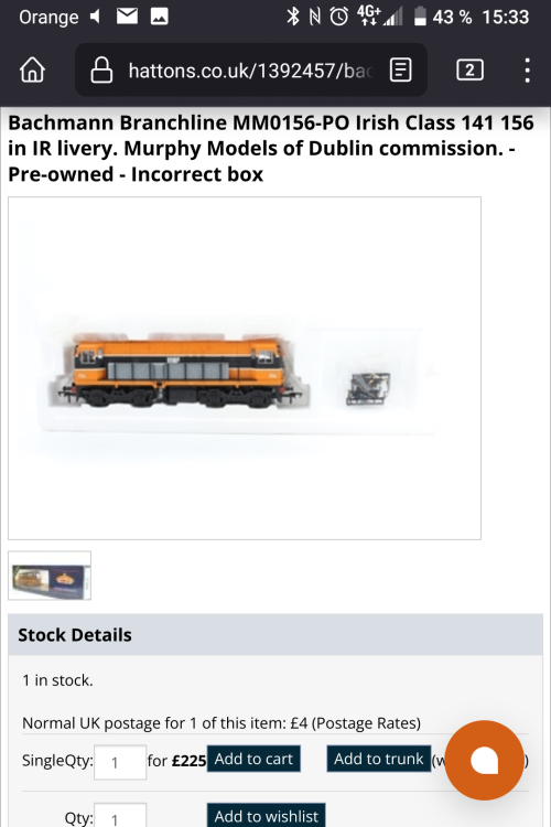 Murphy Models 141 Class no. 156 in IR livery for £225 GBP from Hatton's: https://www.hattons.co.uk/1392457/bachmann_branchline_mm0156_po_irish_class_141_156_in_ir_livery_murphy_models_of_dublin_commission_pre_owned_/stockdetail