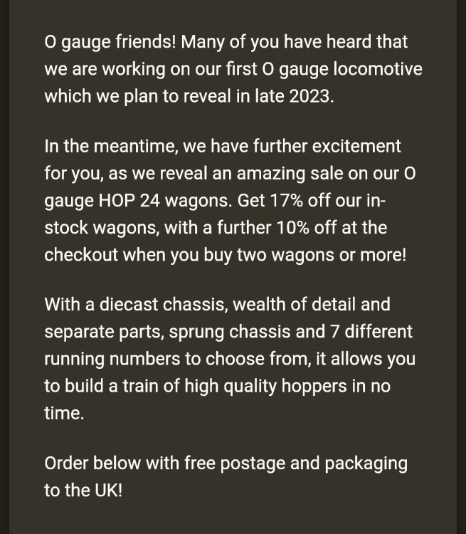 The honourable thing for David to do, assuming that he and Mark parted ways, would be to publish a list here on the forum, of exactly what he has accepted financially, and not managed to deliver on. No names, just numbers. Client no. 1 paid a deposit of X on X date for X model with a balance of X due on delivery etc. It would be a giant step towards redeeming his reputation, and a huge step towards the transparency required in case he ever wanted to get into the model railway world again. Many people will feel that there has been a (or have been several) breach(es) of trust. Despite the running qualities mentioned in the Tara Junction thread, the models do look very very good. If he doesn't have the balls to take a step like this, he is painting himself as a con-artist. I hope he does the right thing.