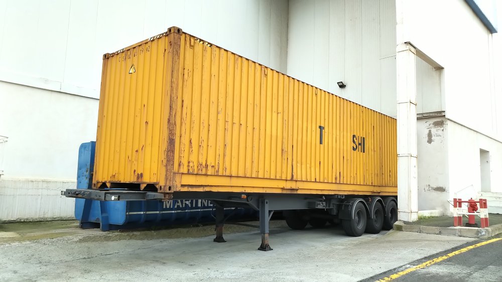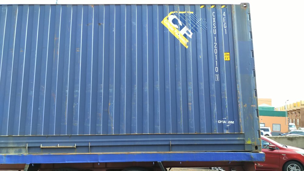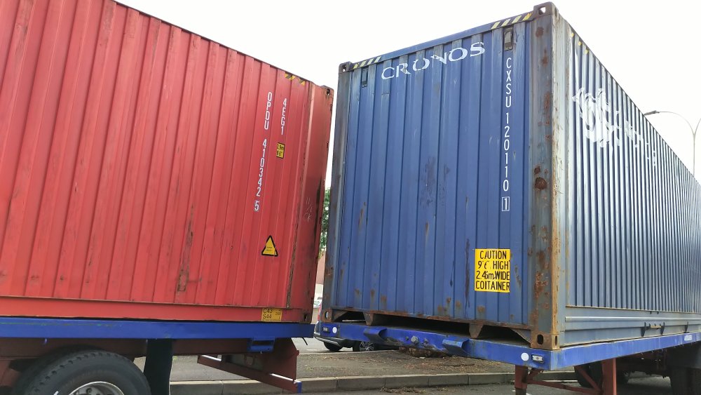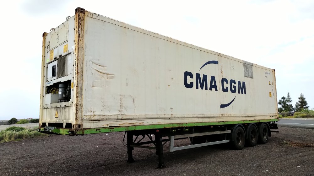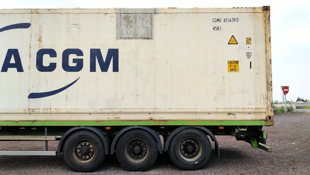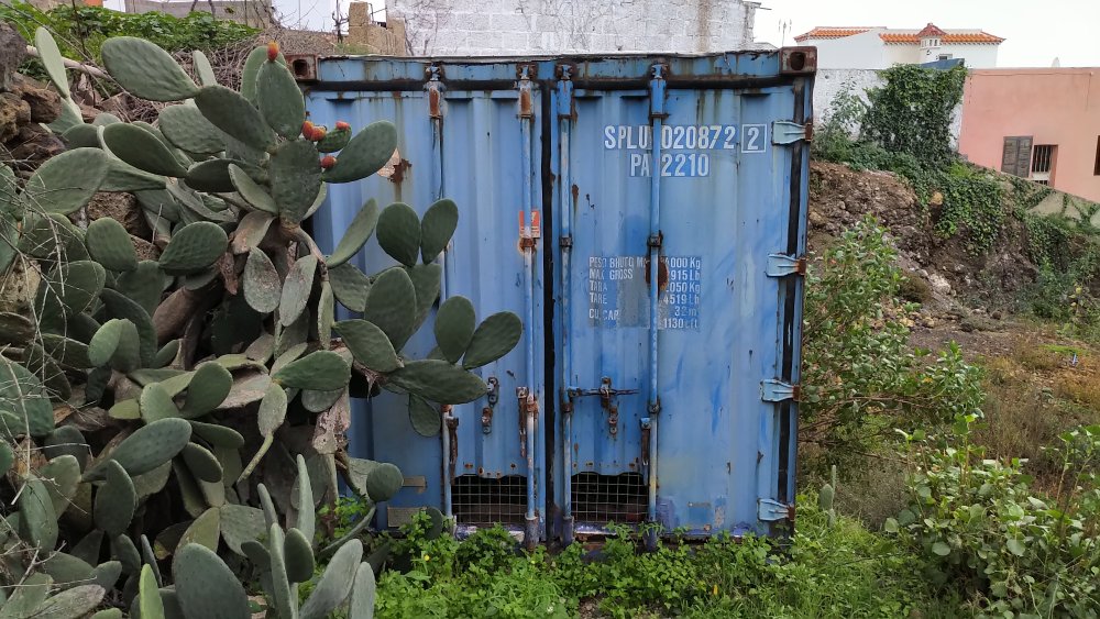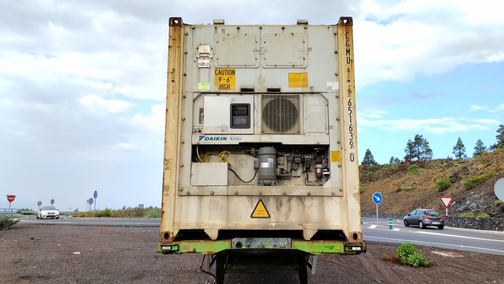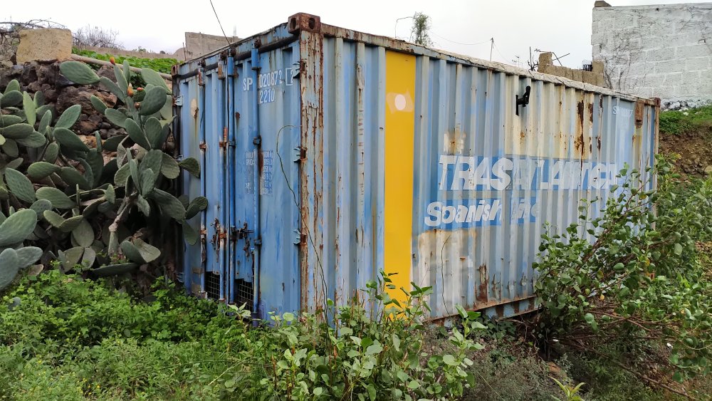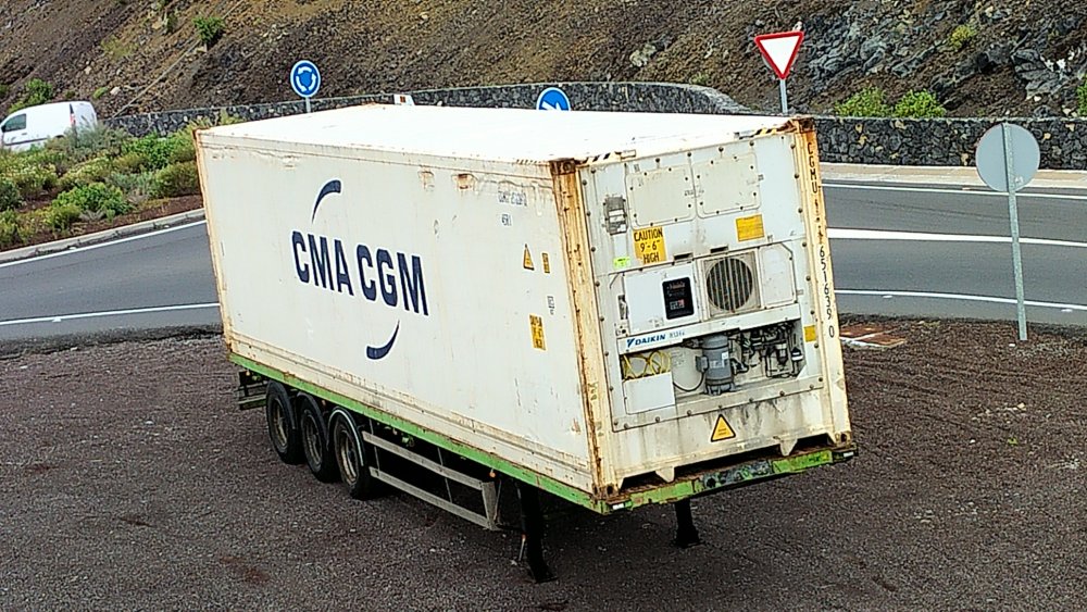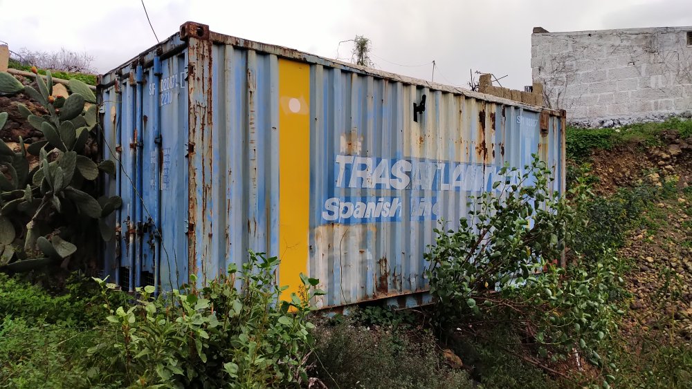 By special request, I stumbled up the little hill behind the reefer and climbed onto a little wall thing, just for you... CMA CGM reefer parked off the TF1 at the Chio roundabout, and a Transatlantica box in Chio that looks like it's been repurposed to house a generator or something. -
