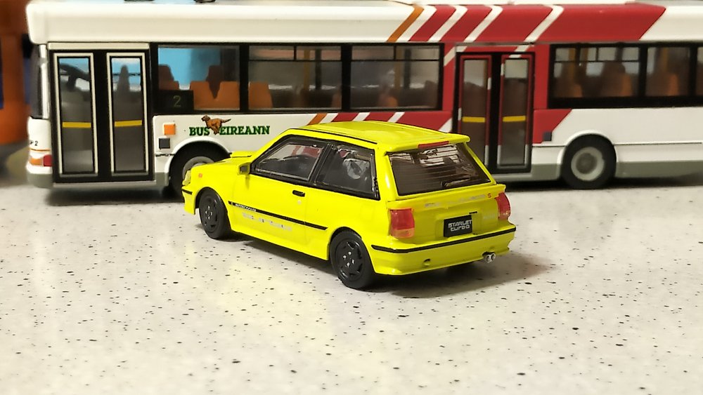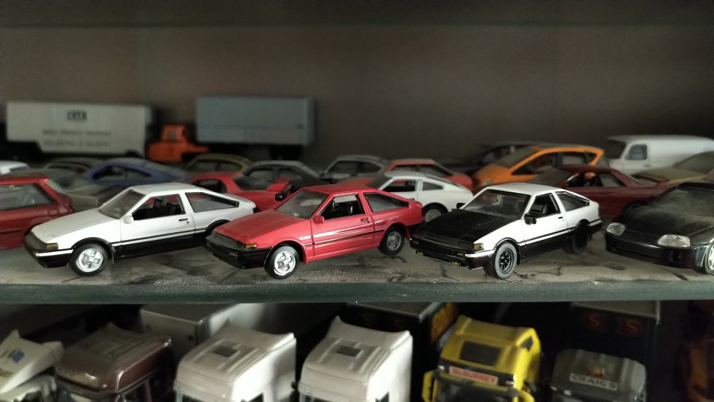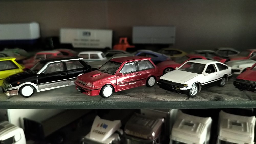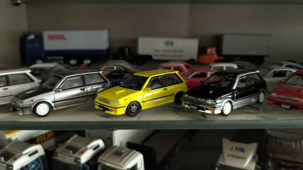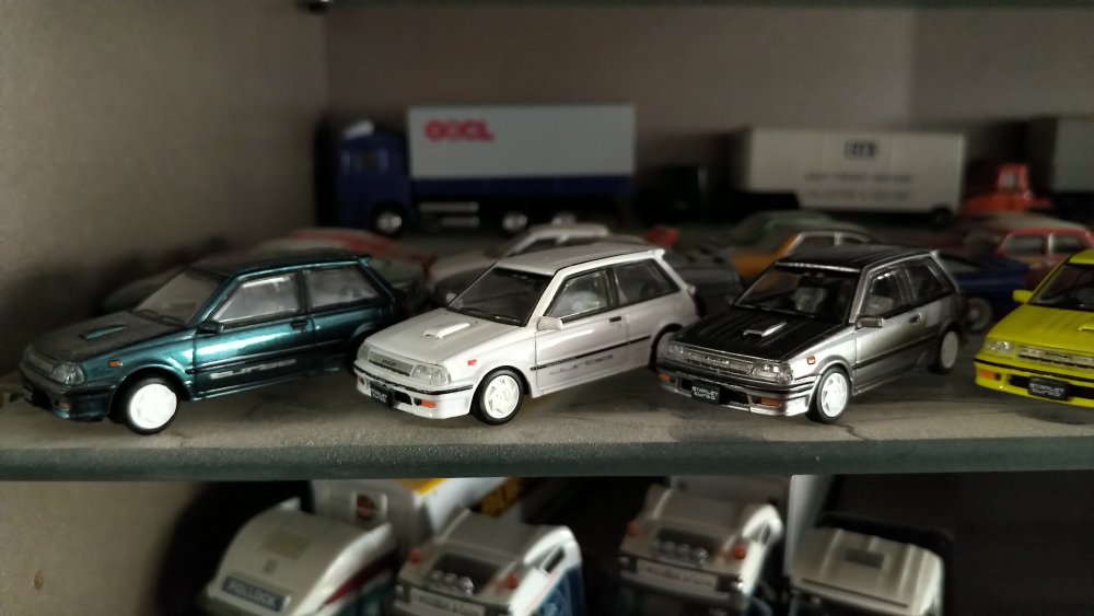 Only Toyotas that I have are older models. A mix of scales. The Starlets are supposed to be 1:64 but I'd say they're more 1:70. The rest are 1:72. The Evo at the end is 1:80 or something, so is too far off.