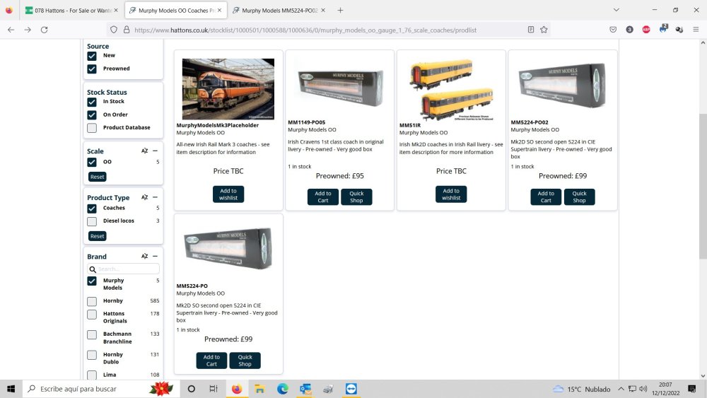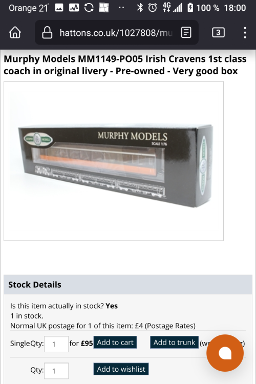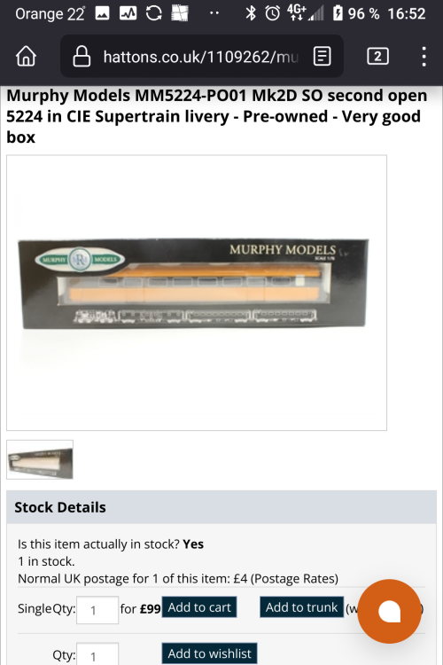 This thread should be renamed and stickied like the eBay and Bargain threads. Something like the "Hattons Pricing For Suckers" thread. https://www.hattons.co.uk/1109262/murphy_models_mm5224_po01_mk2d_so_second_open_5224_in_cie_supertrain_livery_pre_owned_very_good_box/stockdetail £99 STG for a coach!