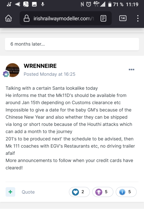 Email from IRM today that Murphy Models' Mk2D coaches are due in stock in a little over a week. The IRM website says that payments will be charged on Wednesday, January 17th. So, to avoid disappointment, get the fingers out, get the cards out, and get splurging on the IRM website! Posting this on both of the Mk2D threads to help as many people as possible.