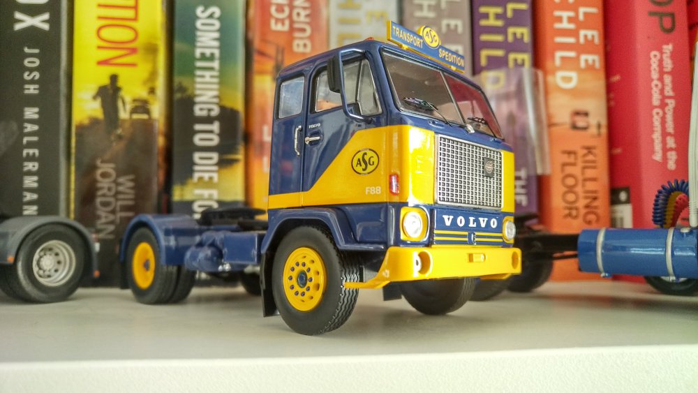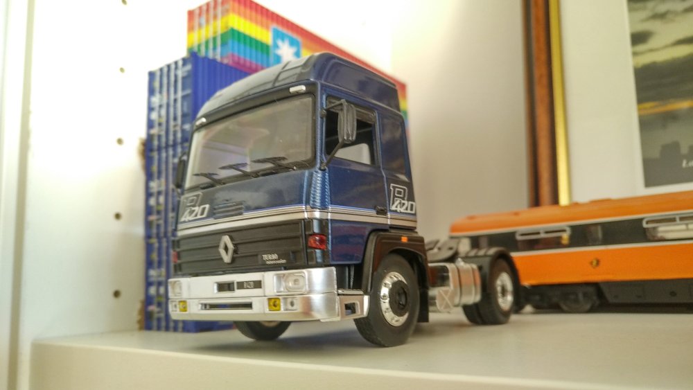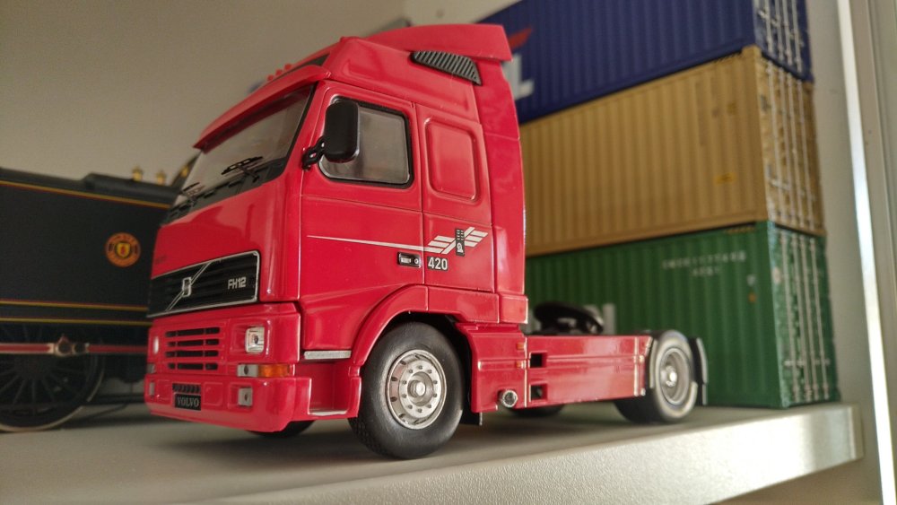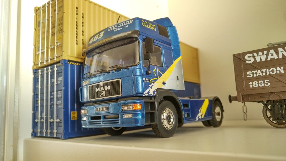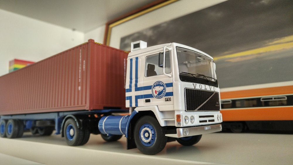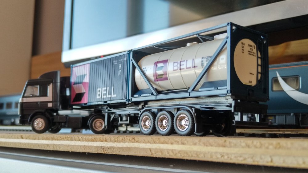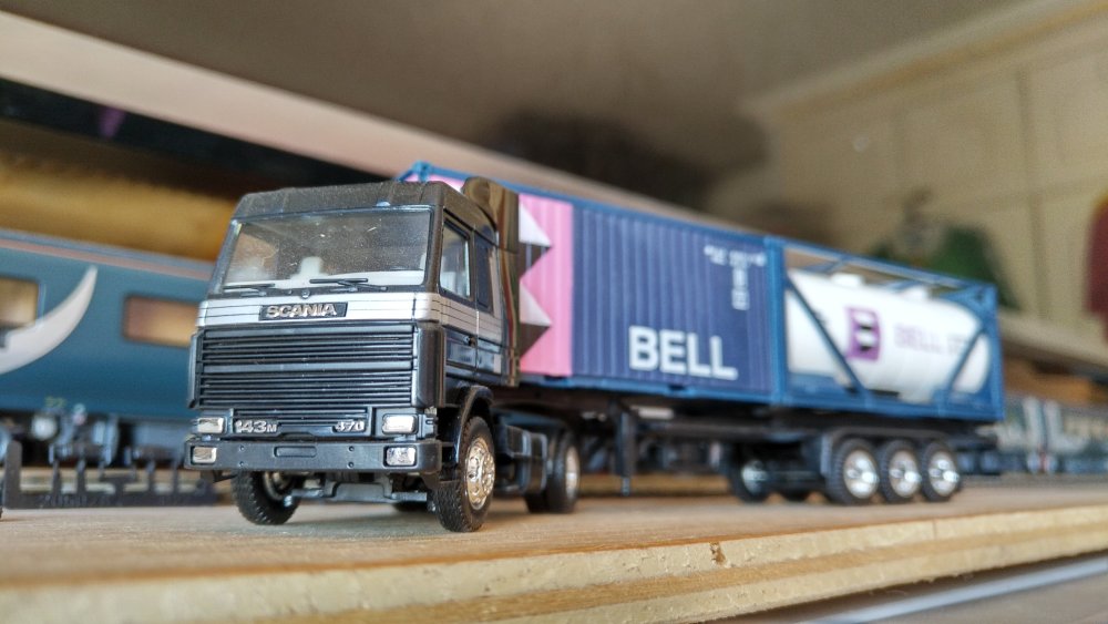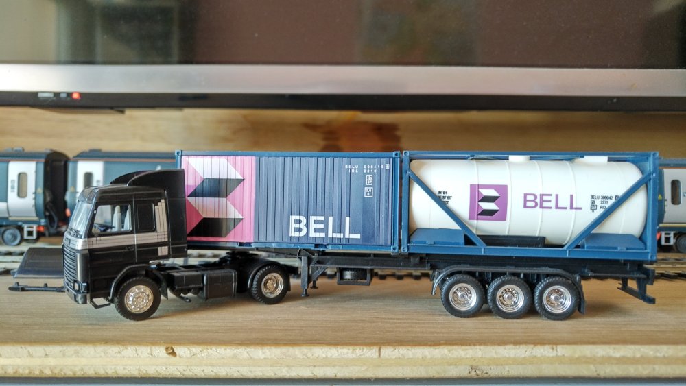Herpa 1:87 Scania 143 with a Bell 20' and a Bell tanktainer. Not sure how prototypical the tanktainer is but I like the look of it. This didn't arrive in the usual Herpa packaging, just a transparent plastic box with no branding nor info, no model number or anything.