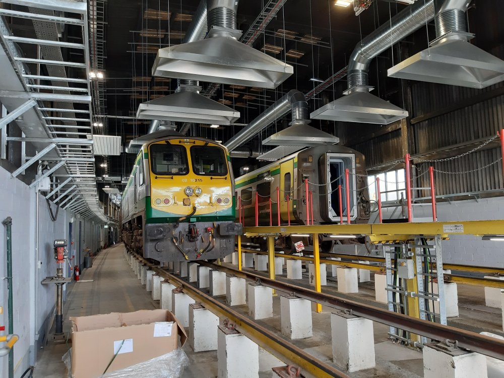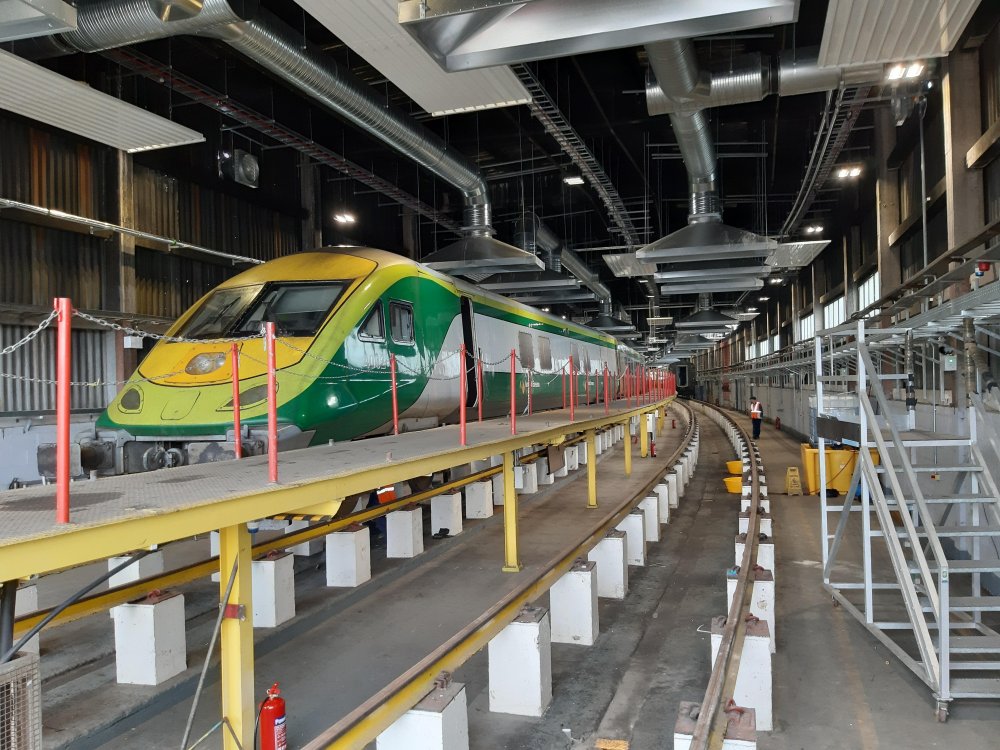After years in the doldrums, the Heuston Valeting Plant has reopened after completion of a full Mechanical & Electrical refurbishment. A gauge run to ensure fume extraction hood clearance and track inspections were recently completed and pictured below. The refurbishment is in preparation for the use of the facility for the roll out of the new Train Protection System to the fleet from 2020 onward.