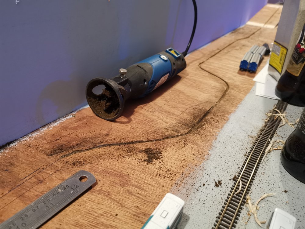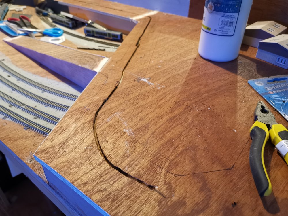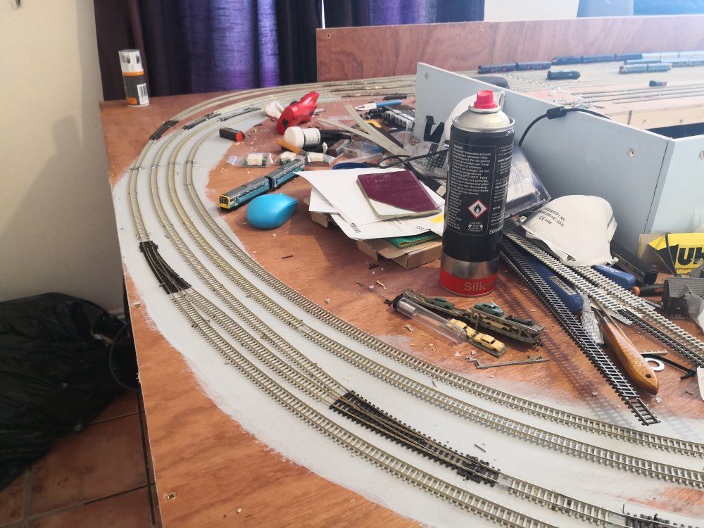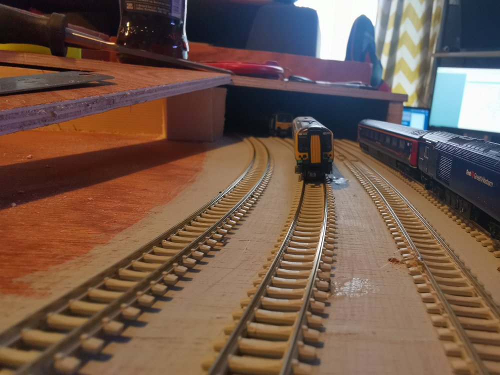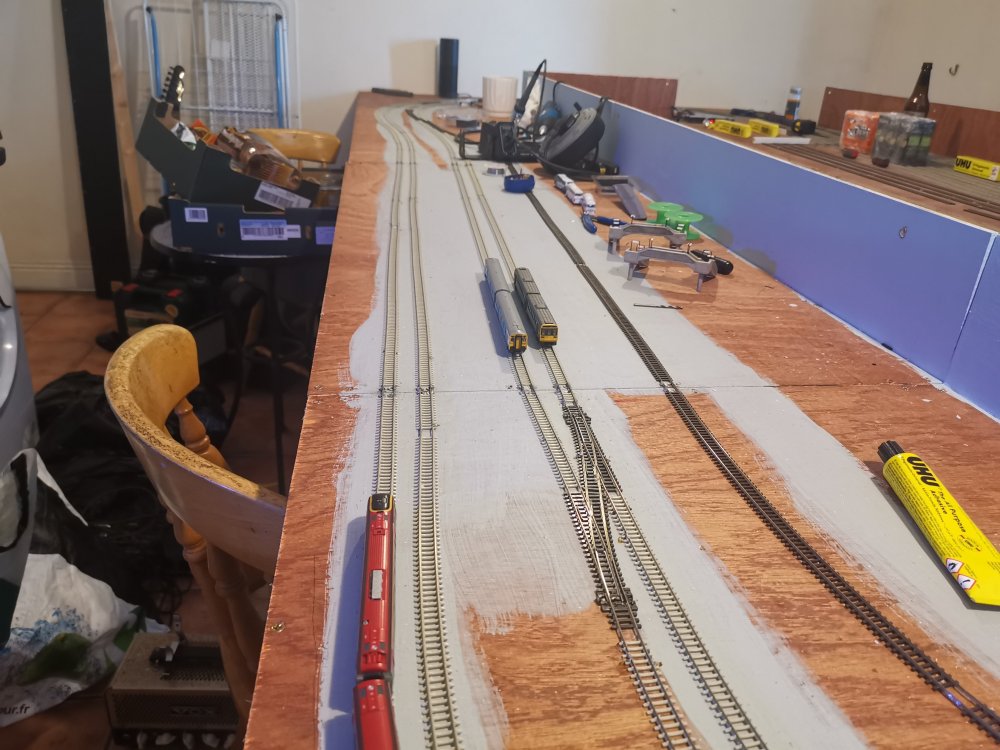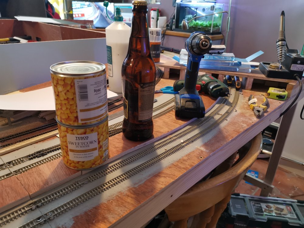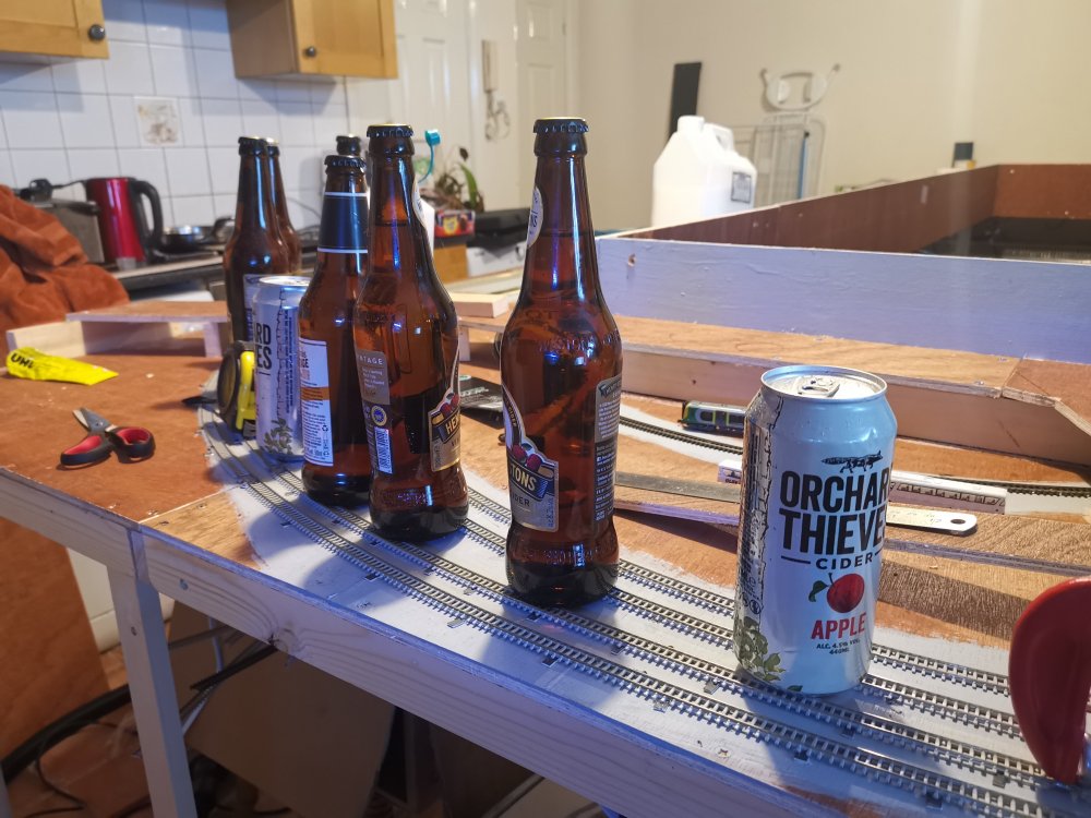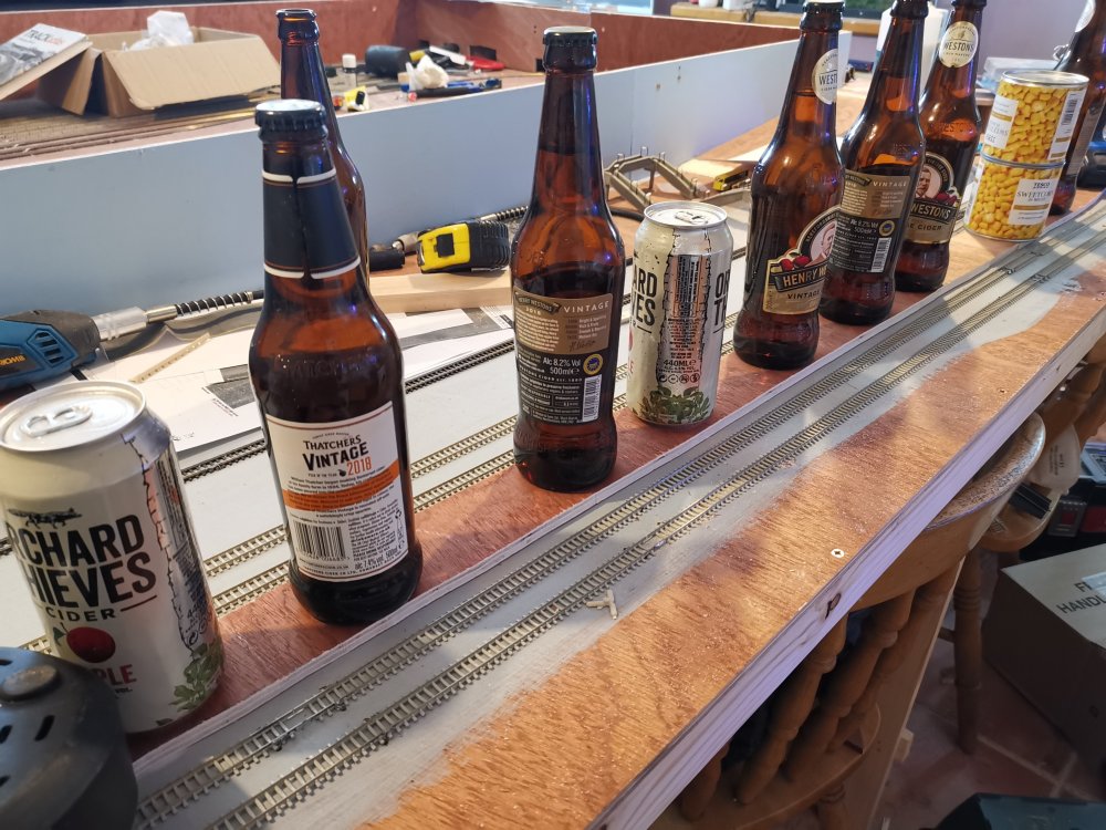 I've gone with some superelevation on the curves, cider bottles to hold track in place whilst glue sets!