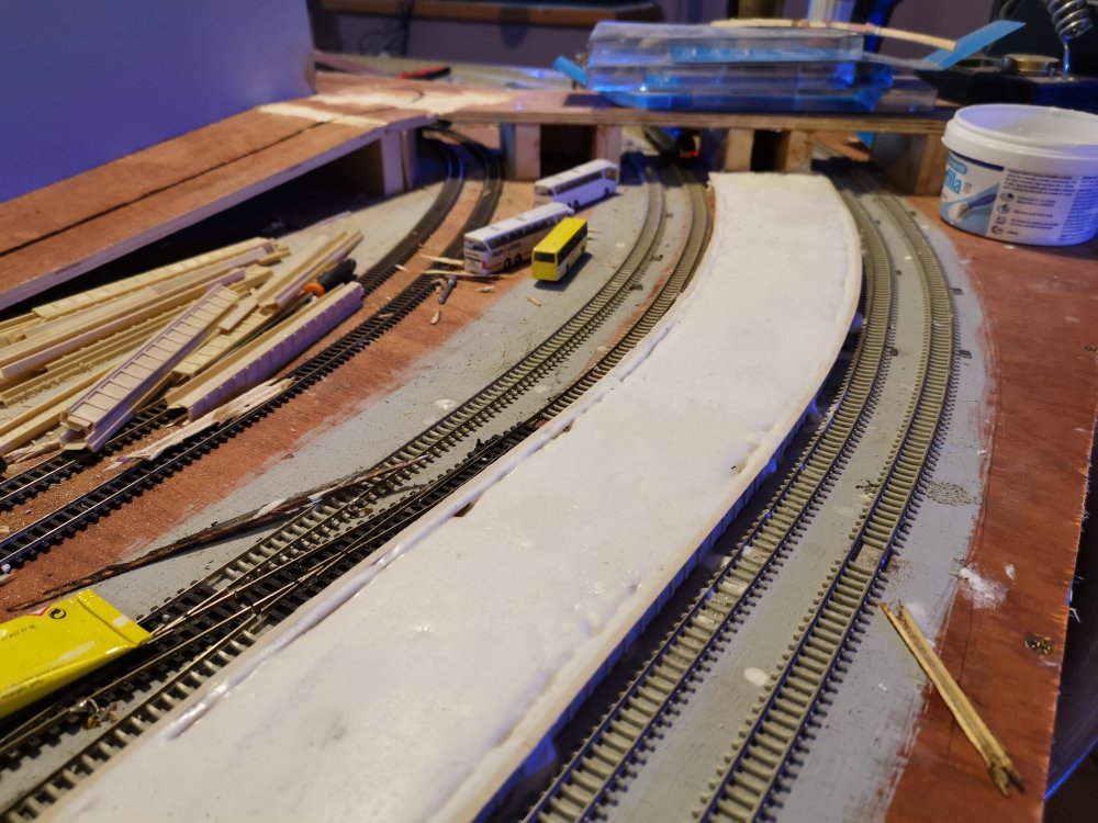 Filler on the first platform to be laid, and routing the route for the tomix car system bus route, loads more routing to go! And a picture of two of my HSTs stabled.