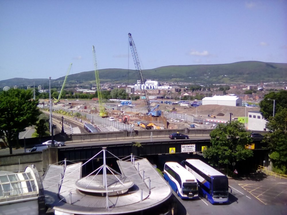 Work is progressing, preparing the site of the new railway and bus station or 'Transportation Hub' to be called Weavers Cross, on the site of the former Grosvenor Road Goods Yard. The sheet piling is being used in the construction of a new culvert for the Blackstaff River which runs through the site. The bus depot has been moved towards the West Link motorway and the two canvas buildings are temporary bus maintenance sheds. The Royal Victoria Hospital can be seen in the distance. The U shaped roof is the Great Victoria Street Railway Station. This part of the project is only preparing the site. Eventually, the present station will be demolished and the 'BOYNE BRIDGE' removed, although this is being opposed in some quarters. There is more information on the Weavers Cross Web Site. DSERetc