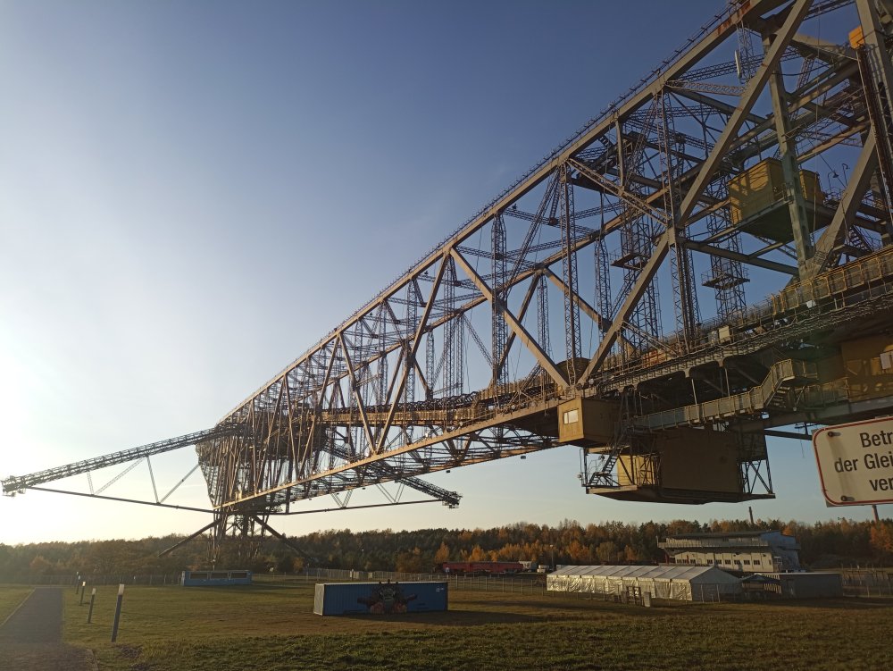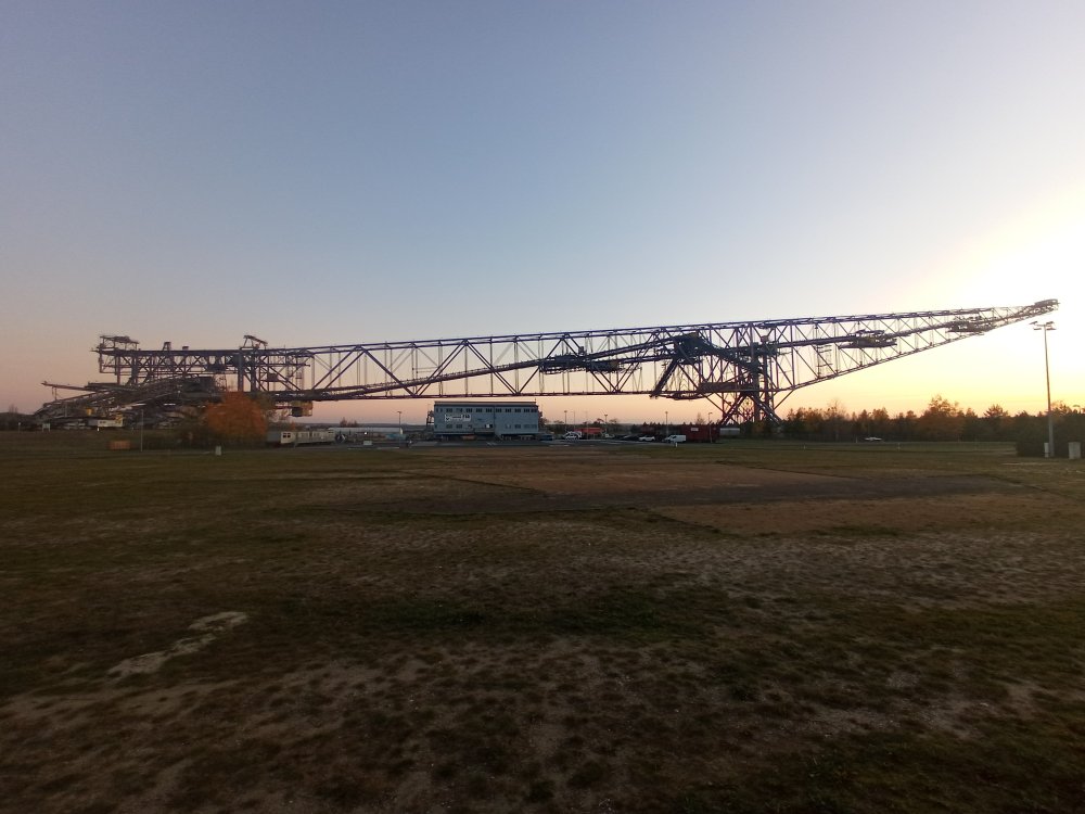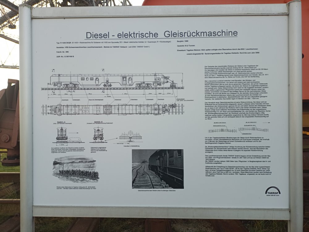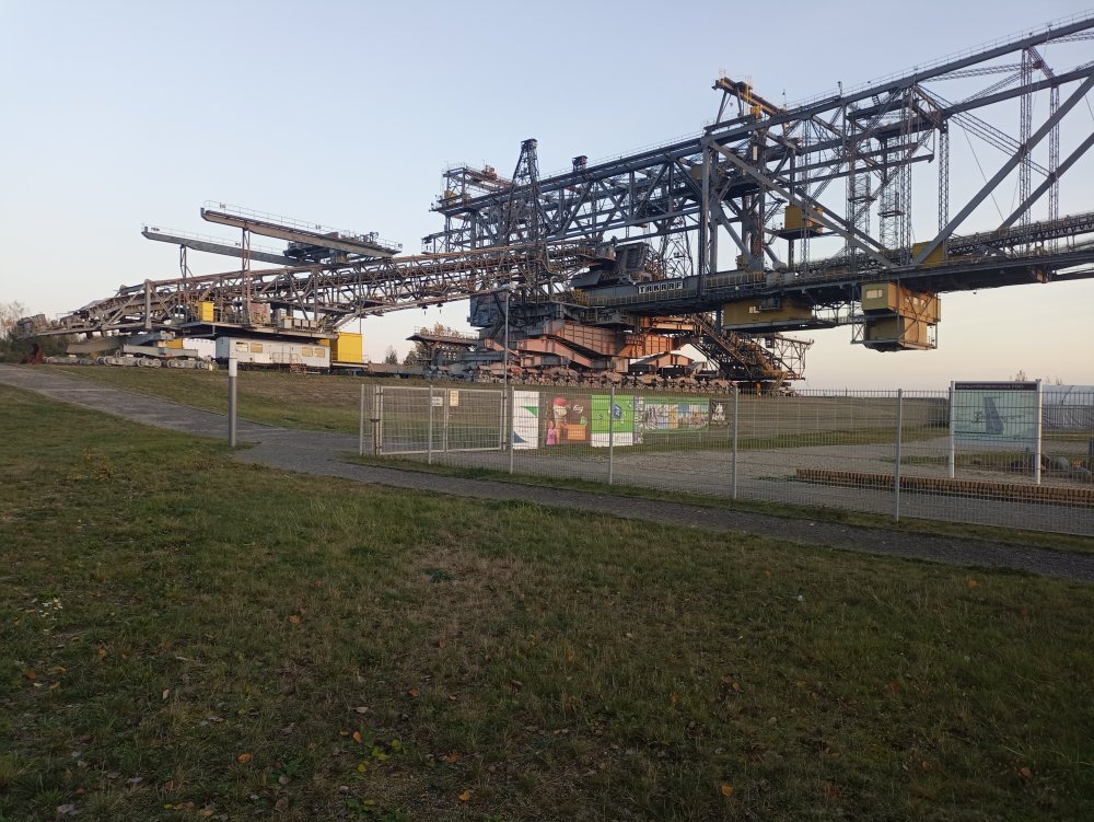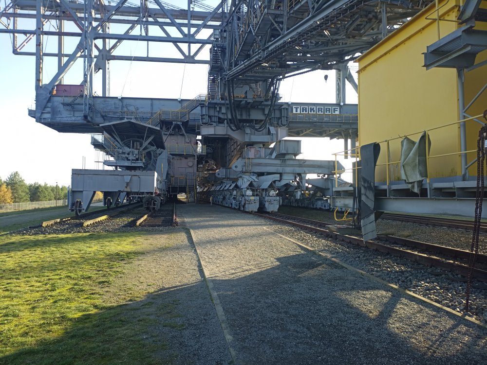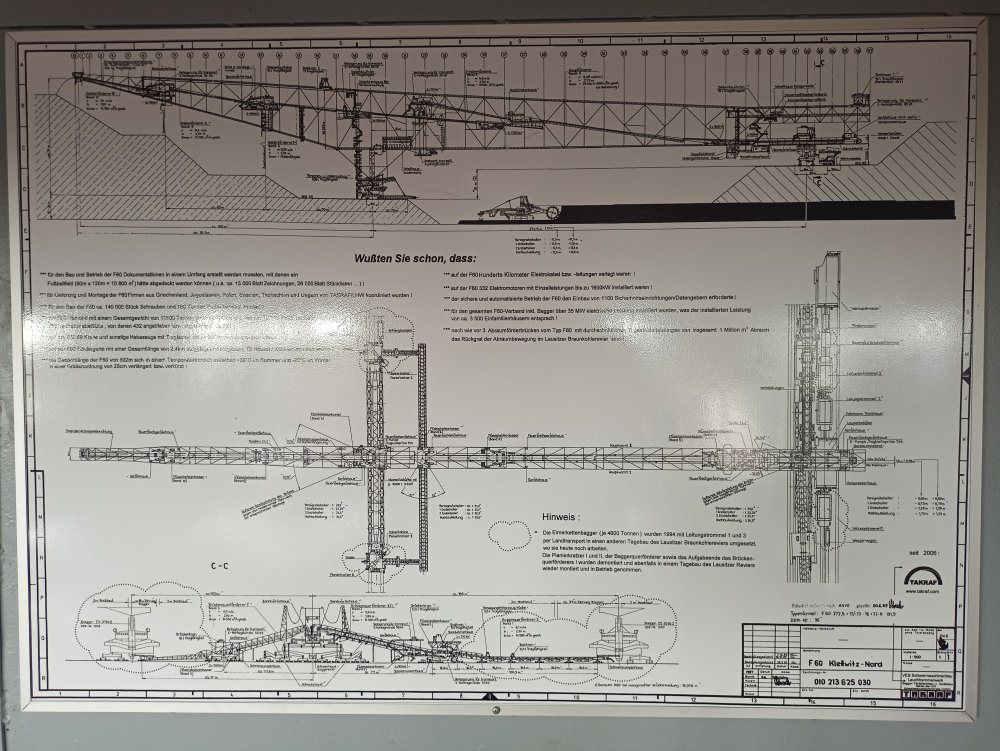 So strictly speaking this is a rail based vehicle and not just any rail based vehicle, but the second heaviest movable work machine in the world, weighing in at a massive 13.5 k tonnes and the largest (by dimensions) vehicle of any kind ever built, with a length of over half a kilometre. I was blown away by the scale of it. This one is preserved and will likely be the only one of its kind that will be preserved. There is no call for multiple examples of these machines all within a fairly small radius of each other. This one was in fact supposed to be detonated and scrapped, but thankfully some local enthusiasts intervened and were able to save it. The purpose of the machine is to remove what is called the overburden (a word I learned today) which is the soil covering and preventing access to a natural resource such as (as in thic case) a coal seam. It is not used to mine the actual coal! This example was the youngest, being built around the time of the collapse of the GDR. It was only in service for about one year, before being retired. The coal mine it operated in produced fairly low grade lignite that was used solely for the production of briquettes and coke for the local steel industry. Both of these customer bases dried up almost immediately after the fall of the wall. Nobody wanted briquette fires when gas and oil heating became readily available. The steel plants closed along with so many others. We took the guided tour and walked around a mile from the start to the end! We entered the beast at the excavator end and walked all the way to the highest point at the tipping end. The soil was released from a sufficient height to ensure it self compacted on impact and could support the weight of the machine when it came time to slew the tracks over and excavate a new part of the mine. https://en.wikipedia.org/wiki/Overburden_Conveyor_Bridge_F60 All pics taken today in glorious autumn sunshine Excavator end. The large drum on the left used to transport the main power cable. The machine is entirely electric with over 700 wheels. View out towards the tipping end. Spoil was released from the arms left and right. The larger yellow box slung under the conveyor was the control room. The tipping end. In the foreground the workshops, canteen etc. which was also rail borne and followed the conveyor as it moved. The excavator end. Note the two excavators were removed and are working in other mines to this day. The excavators fed the conveyors reaching down from the bridge on these huge arms. The spoil was carried up to the main bridge deck and across the open cast pit, to be deposited by the tipping end. Drawing of the behemoth. The excavators (Bagger) are shown in the lower drawing. It's pretty high even at the excavator end! The walkways were adapted before tourists could access the machine. The miners did not have the luxury of almost solid decking. They had to look down through a metal grid. They also had simple handrails, without the extra plating. The yellow structure slung under the bridge and nearest to the camera is the computer! This thing was ultra modern in 1990 (for GDR standards anyway) but it still took a room to contain a fraction of the computing power we carry around in our pockets these days). View from the highest point at the tipping end. A good 74m above the ground. Above the open cast pit the height was actually higher but falling from any part of this machine would not have ended well! A picture of an F60 in operation with teh 2x Es 3750 excavators showing how it operated. In the open cast pit itself the coal was excavated with a separate machine, the SRs 1301 and the coal was transported out lengthways along the seam along a conveyor belt (Kohlebandanlage). View along the main axis towards the tipping end.At this point we descended the stairs and then continued towards the highest point along the right hand catwalk, returing on the catwalk on the left. Another view from the top. The lake began forming as soon as the pumps keeping the groundwater out were switched off in 1992. It took 10 years for the water to reach its current level. The area is now being developed for tourism. A panoramic view of the machine, which involved a long walk and setting my camera to panorama! No chance of taking a normal picture from within the site. The track slewing machine. The sleepers are hollow steel type, lighter than wood, which enabled this machine to pick them up and slew them over by 60cm. Close up of the "slweing head". It could be moved left ir right, depending on which way the main machine needed to go. Sketch of the track slewing machine. Locomotive used on site. Not exactly sure what role this had. The guide had left at this point so I couldn't ask unfortunately.