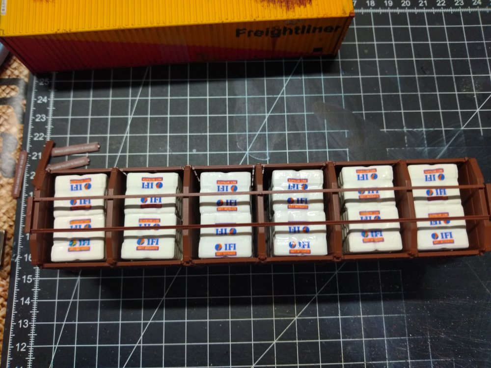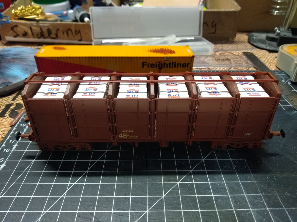 Yeah it's very forgiving too. You just need white transfer paper (not clear!). Print off the decals in photo quality on a half decent printer. I only have an inkjet printer, but I presume it would work on a colour laser printer as well. Let the ink dry well then seal with a light coat of clear varnish. Let dry well then cut into rectangles. Cut out a slightly larger rectangle than the top of the load. Apply microset to load top and sides around the top. Let decal soften in water but really only just as long as it takes to come loose then take it out and slide decal onto top, folding the edges down. The white transfer paper is now your fake outer plastic wrap around the sacks. Looks fairly close to the pics I've seen. No need to do the sides for the wagon loads as you can't see them For a bit more definition between the pallet loads (remember the double height models are two pallets top and bottom) apply some micro sol just between the pallets so the transfer sucks in along that line only. Don't apply it to the whole top or the transfer will suck in around the individual sacks which is not really what you want.