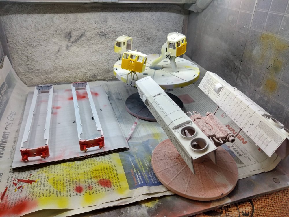 086 has been joined by 088, also ex-ST. Both models were stripped down to bare plastic after an initial attempt to feather the edges of the paint lines before priming was less than satisfactory. You could still see a shadow under a vertical light source and as these models may well be lit from above I wasn't happy with that and after experimenting on 086 above, 088 went into the dip to remove the primer and factory paint underneath and also bring it back to bare plastic. Stripping was done in 99.99% IPA. Afterwards rinsed in soapy water and then sprayed off with distilled water through the airbrush, just to be sure everything was neutralised. Probably overkill but these aren't my locos oh and the mould lines around the cabs were sanded out while I was at it. After drying overnight, the primer was applied from a rattle can (buffer shanks were masked up first). I had one can of Vallejo Hobby Paint left and decided this would be a suitable application as I wouldn't have too much waste and detail is maintained due to the finer pigments compared to automotive sprays, allegedly. I already decided not to buy any more aerosol paints, including primers, simply because you waste so much as you have to keep 20cm away from the subject and most of the spray goes to waste like that. I guess I could have depressurised the can and decanted the contents off for use in an airbrush but I'm too lazy for all that so I sprayed it from the can. A couple of hours later I began applying the final colours, working from light to dark. The colours were matched as closely as possible to my MM0112. The yellow is Vallejo 71.135 Chrome Yellow from the Air range. The red is RAL 3013 Tomato Red from Oesling Modellbau. Both paints are water based acrylics. The yellow warning panel as well as the buffer bosses will be reverse masked before the blue is applied. The centre grab irons on the cabs were removed to make it easier for the masking tape to sit flat. I will have to make up custom masks, approximating the curve radius of the corners.