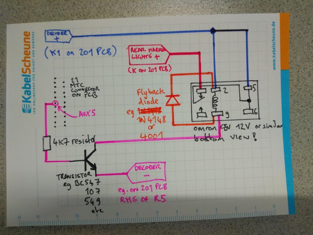 Problem: Rear red marker lights on the 201 are permanently illuminated with the front marker lights unless the manual switch under the loco is operated. This kind of defeats the purpose of DCC etc. It would be nice to be able to remotely disable the red marker lights, while leaving the front white ones on. It looks unprototypical in some circumstances to have the marker lights on. (my) Solution: desolder the wires leading to the current switch and slot in a relay instead of the switch and trigger the relay using one of the remaining free aux outputs on your decoder (in my case I used aux 5), if you have any. Hint: a Lokpilot v4 that many units will have fitted does not have any spare aux outputs to do this. I have fitted a Lokpilot/Loksound v5 for this, but any standards compliant decoder with an aux 5 output should do. (kind of ) tricky bit: The NMRA spec calls for the aux 5 and above outputs on the 21MTC connector fitted decoders to output at TTL (transistor-transistor logic level, a kind of low power used for microelectronics and not strong enough to switch anything) so we need to take this TTL voltage and amplify it using a small signal transistor such as a BC107 or (as I used) a BC549. The amplified signal is then used to drive the coil of a sub miniature relay (I chose the omron G5V 12V, but any 12V relay that fits should be ok) where the normally closed output of the relay is connected to the rear marker lights + terminal on the 201 PCB, while the common of the relay is connected to the decoder + (again, K1 on the 201 PCB). The Aux 5 terminal on the 201's PCB does not go anywhere so you have to solder your wire directly to the pad of the 21MTC connector (please don't start soldering stuff to the decoder even if it appears easier, we want to modify the loco itself, so decoders can still be changed in and out without de-soldering stuff) Other bits: You need to fit a resistor between the aux 5 output on the 201 PCB and the base of the transistor (marked b in circuit diagram attached). The transistor collector connects to the other side of the relay coil and the emitter of the transistor connects to the decoder - (minus). I used the RHS of the resistor marked R5 on the 201 PCB rather than solder to the MTC21 connector, though you can do that too of course, just be sure to use decoder minus and not track minus or something. After desoldering the wires to the switch I black tacked the relay on it's head beside the switch. I then superglued the BC549 also upside down to the side of the relay. This is then easy to solder everything to. A so called flyback or clamp diode should be fitted across the coils of the relay even though ESU never mentions this in their own documentation about fitting a relay. This is purely there to suppress any induced voltage spikes during switching but should not be omitted as some decoders will be damaged over time if no suppression is included here. Note the flyback diod has the negative end connected to the decoder +. This is not an error, it's how it works. If this is reversed it will provide no protection. This all sounds more complicated than it is probably. The circuit diagram should clear it up. I've included a couple of pics too. The colours of the wires in the diagram don't always match the actual colours I used I'm afraid. The white wire I used is coming from aux 5 on the 21MTC connector via a resistor that is difficult to see because it is enclosed in heat shrink where it's soldered to the base of the transistor. Don't forget to use heat shrink or otherwise adequately insulate your wiring, especially at the transistor if you choose to do it my way. YOu could use a small piece of veroboard but space is limited in the loco so Iike my way with almost everything stuck directly to the upside down relay. You then need to map some free function key to aux 5. Briefly the circuit works by using the transistor as a switch. When the base-emitter junction is saturated, the resistance between the collector and emitter falls to almost zero, allowing current to flow from the decoder + through the relay coil to decoder -, this switching the relay. When the relay is not energised, the red marker lights + has a path to the decoder + so its circuit is complete and the red lights will be on if the marker lights are on. When the relay is de-energised the path is interrupted (you can see nothing is connected to relay pin 10) and so the red lights cannot illuminate, just like with the manual switch, except it's controlled remotely now. I've left the old switch in there as I can use that to isolate a stay alive capacitor (during programming) later. Any questions, feel free to ask. Any suggested improvements are also welcome. I know a FET would probably be a better job instead of the NPN transistor but I had them in my bits box. No warranty, modify your loco at your own risk, incorrect wiring can fry your stuff etc.