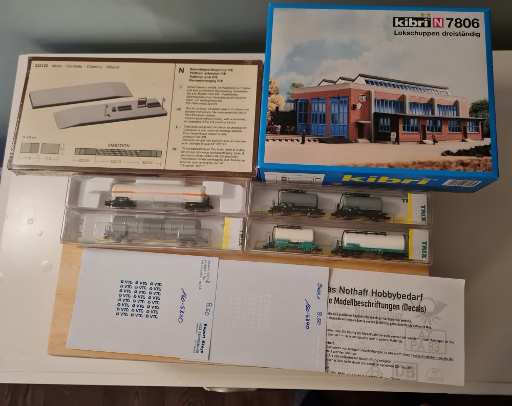 I have the following N-gauge 1/160 items for sale, preferably as a single sale. €150 o.n.o. I'm based in Carlow so can drop/collect in South East up to Dublin, otherwise postage at cost Ireland. 4 sets of Trix tanks, liveries removed and grey undercoat on some. VTG decals blue & white set, Kibri Diesel Depot kit, and platform set. Was planning to do a micro layout depot scene, but just don't have the time at the moment! Regards, Dave