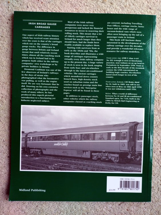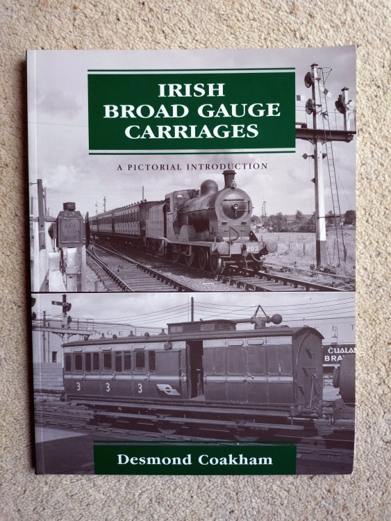 Clearing a departed relative's house means I have a duplicate copy of "Irish Broad Gauge Carriages - A Pictorial Introduction" by Desmond Coakham. (c) 2004, ISBN 1 86780 175 X Lightly used and in good condition - see photos. I thought I'd give forum members a first shot at it, as my copy is invaluable to me. Looking for £5 plus postage at cost via Royal Mail. I'm in the UK, so postage in UK would be £2.60 Standard or £4.20 Tracked 48 - successful buyer can let me know which they would prefer. Happy to post to Ireland but that costs a bit more: £5.25 International Standard or £9.85 International Tracked - successful buyer can let me know which they would prefer. (Euro conversion rate to be confirmed on sale) If there's a buyer, I'd refer payment by PayPal or bank transfer, could also take a cheque but that'll take longer. I would post when payment received. Details can be sorted out by PM. Michael