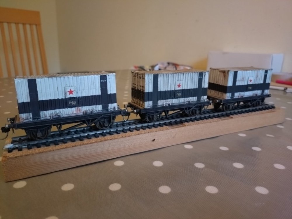 Thank you for the info. I was wondering why they would use containers as vans, since it's basically the point of a container to not be treated like that - why not just buy some old vans from BR? And then I started thinking that a metal container is probably less vulnerable to petrol bombs and such than a traditional wooden-bodied van...!? Thanks for the reply @LARNE CABINand a photo that I hadn't seen before. I hadn't noticed the different colours of the bands @jhb171achill; might have to try to replicate that.