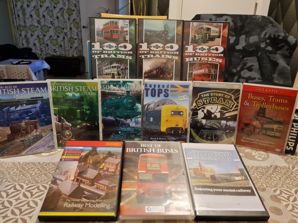 Collection of 12 DVDs. €25 plus postage (An Post rates) PayPal payment. 100 Years of British Trains 100 Years of British Trams 100 Years of British Buses The best of British Steam of Yesteryear The best of British today The best of British steam 1950's and 1960's Beyond Tops Diesel & Electric Traction 1970's and early 1980's The Story of Steam Classic Buses, Trains and Trolleybuses The Hornby Step by Step guide to railway modelling Best of British Buses Hornby - enjoying your model railway