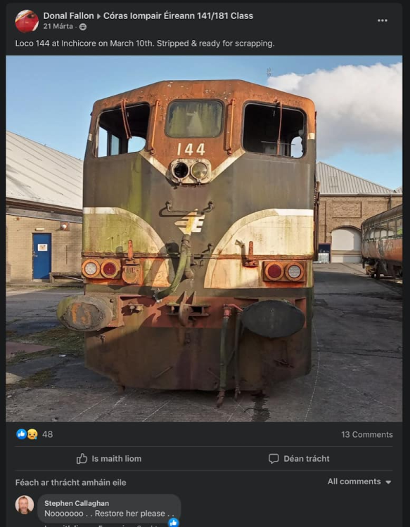 Most likely chopped up at Inchicore! And no, it's a Mark 3 of some sort, it appears to be on temporary bogies... I can only assume it was the spares for the Belmond set or the intended replacement of the Mark 1 Sperry coach (a buffet Mark 3 was also supposed to work in junction with the aforementioned Mark 3). Here's to hoping the last 141s can be saved somehow... haha...