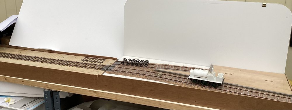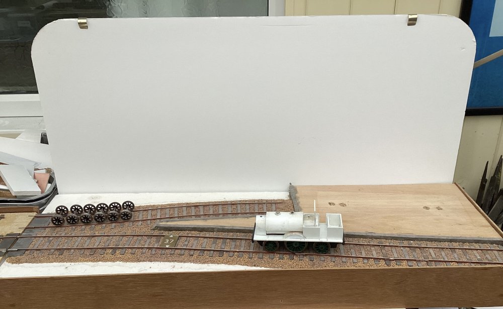 6. No post on here for too long, I’m afraid. There has been a bit of progress, for the track is now laid and ballasted, what bit of it there is. I’m using copper clad fibreglass strip and nickel silver rails from Marcway of Sheffield, laid to 37mm gauge. The main board is to the right, running line in front of the platform and a bit of a siding behind, then a fiddle yard to the left, one siding laid and at least one more needing track materials. There’s some Slaters wagon wheel sets waiting for bodies, The wheels pushed out over the axle a bit to the wider gauge and a drop of Superglue ploshed on in the hope they’ll stay there. The other item of interest is the loco, which is a runner. It’s intended to be a Fairbairn single driver tank, and as it’s a wider gauge I did it all in .060”Plastikard, chassis and body, rather than the more usual strip brass and machined brass spacers I use for 32mm. gauge.