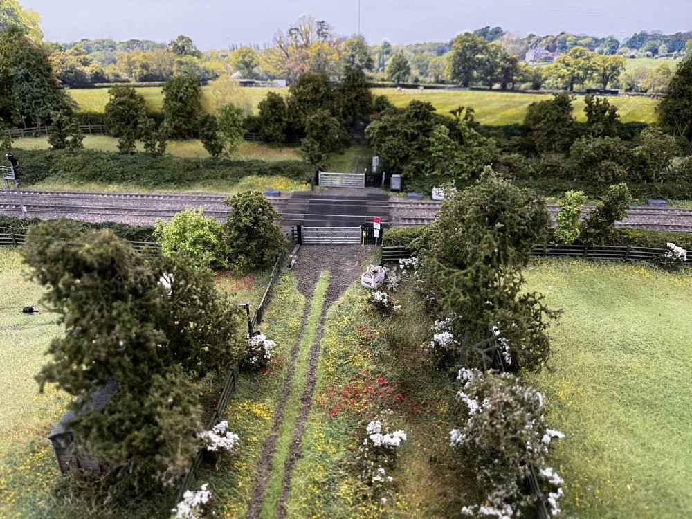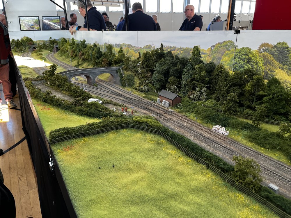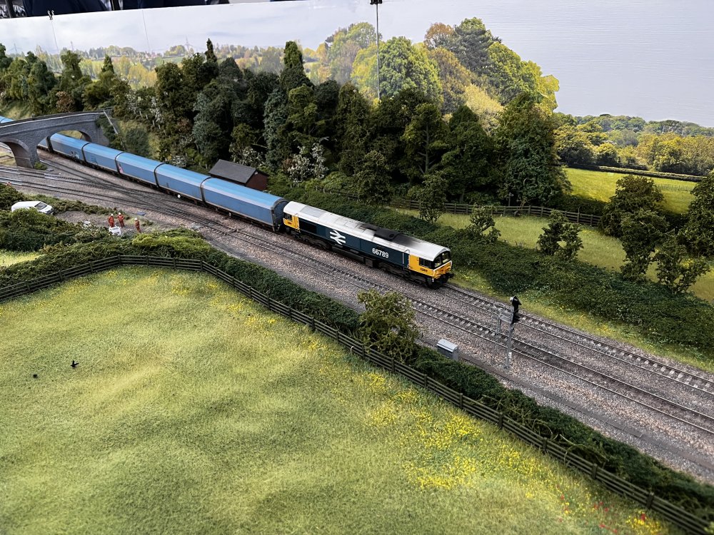 5. As promised, more from Basingstoke. This is Fairfield Jct, modelled (pretty exactly) on the junction of that name to the West of Westbury. Now this layout had some terrific scenery modelling - look at this lane which could have been in Ireland - I'd never before seen Hawthorn in bloom modelled! Pretty good, eh? Now the actual junction, with (incorrectly, they never run here) a car carrying train! And then sans train. The white patch is the sun coming through a window!!!! And finally, the iconic HST in full GWR Bling tearing along - I do approve of layouts with full size trains! IMG_4763 2.MOV More later.....