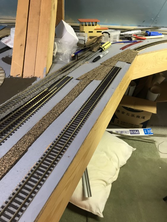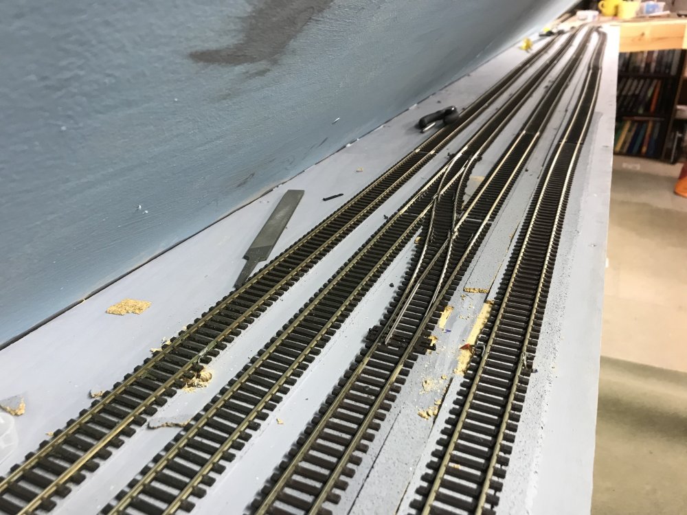 To try and overcome an issue with a diamond crossing on my layout, I have been ripping it out and replacing it with points. So much removal of track, replacement of the underlay first. Then - inserted a crossover on the "loops" section (and straighten the mainline. Loops next. Since this photo, point motors attached. I have motorised the points at the other end of the loops (which will take a twenty wagon goods train) and connected them up to a Digitrax DS64 point controller - that has changed my life, for they are 30 feet from the main control position!