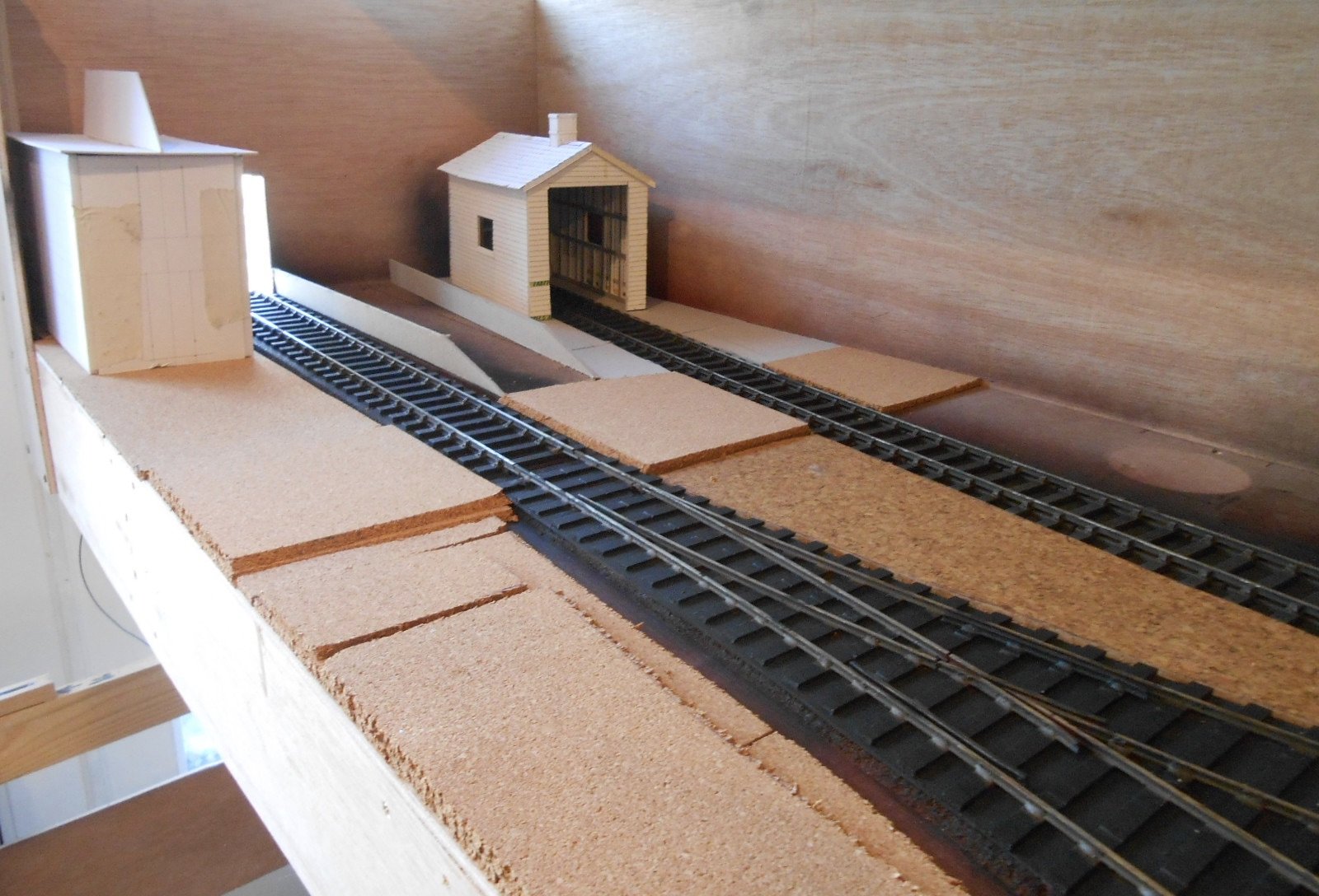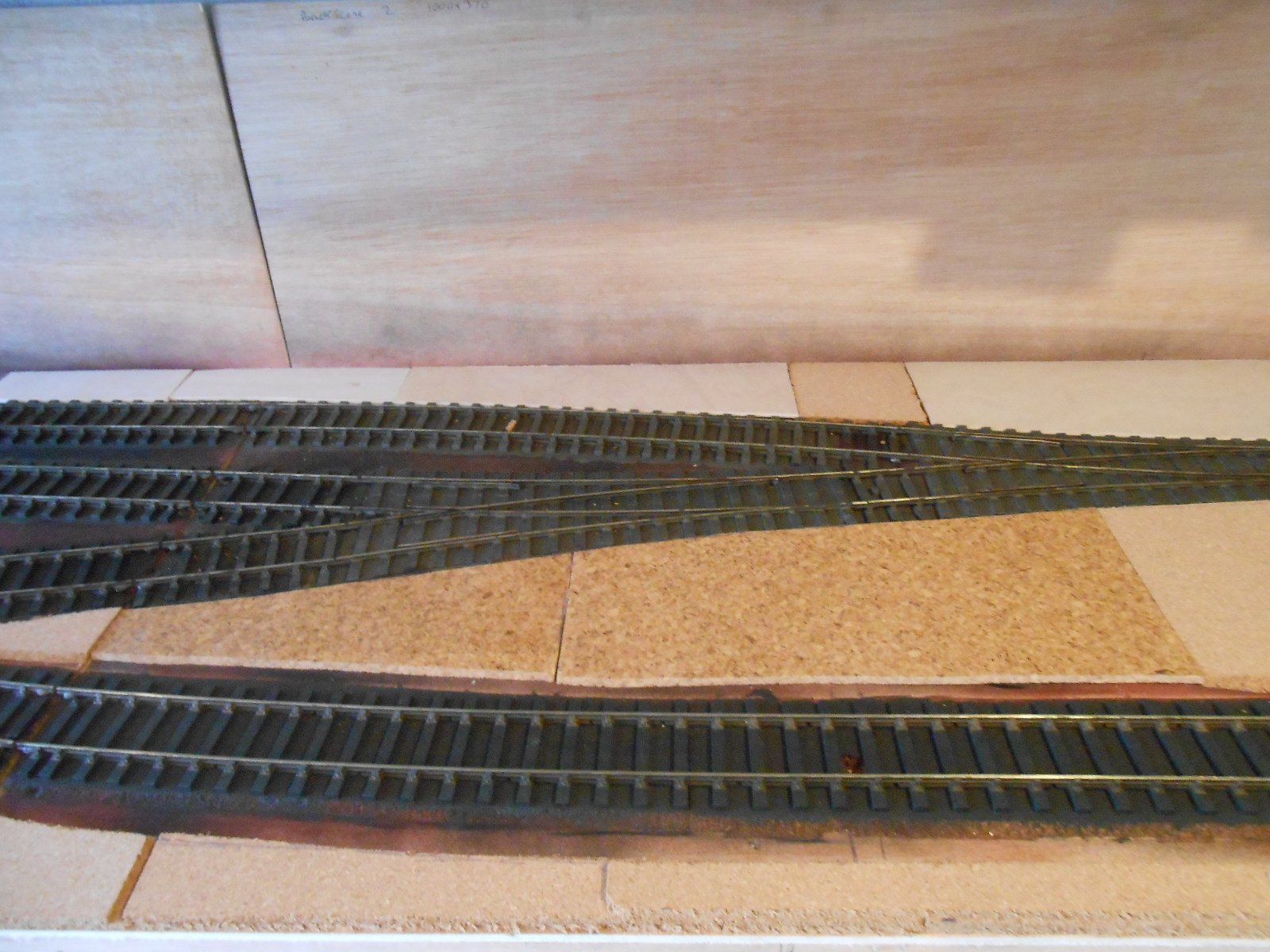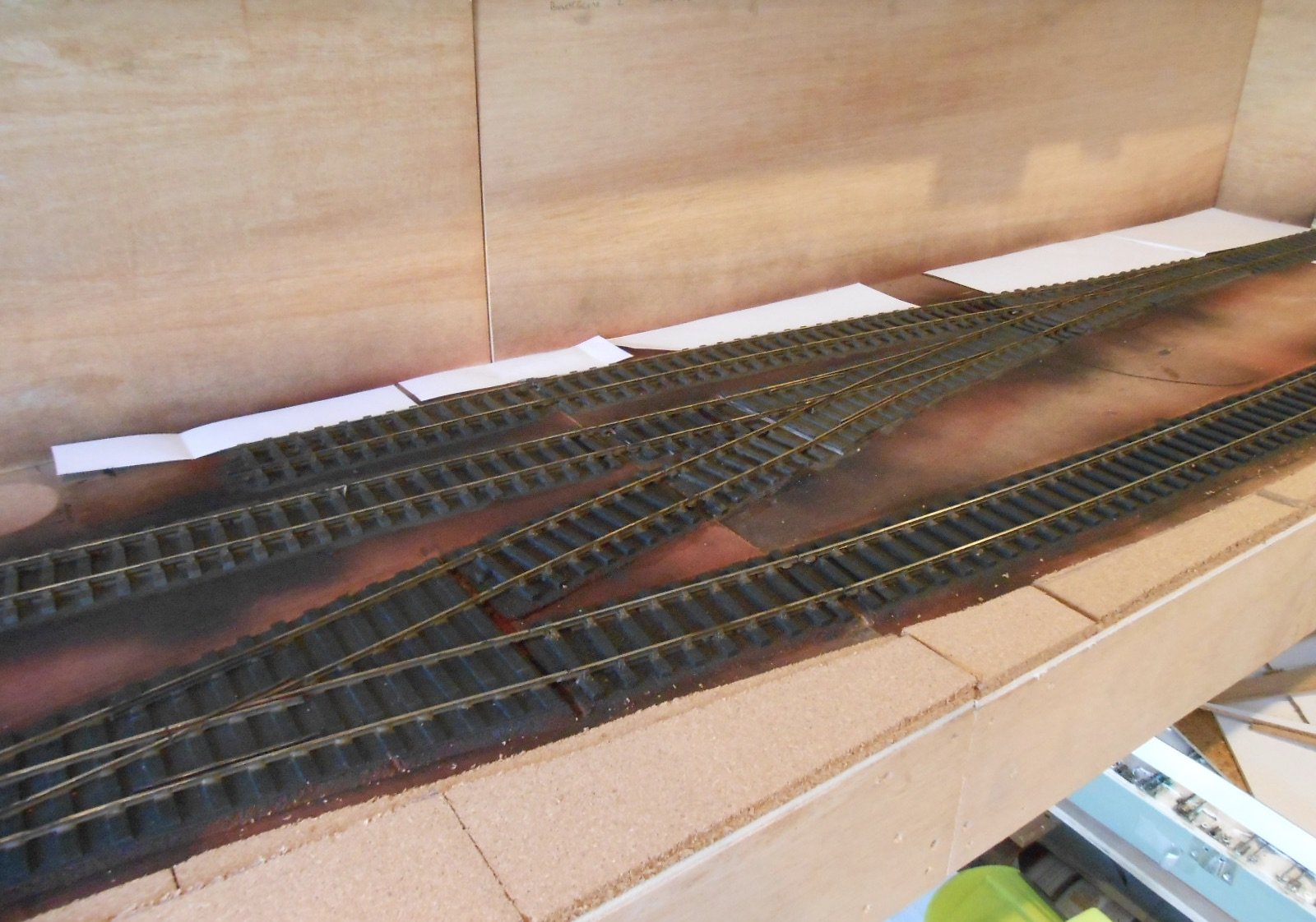 One of the nice things about building your own layouts is there is always something new to do. You can always play trains as well of course, so with with my two Irish layouts going out to shows in October & November, plus this new one on the go, I have plenty of choice! Next job on the BR layout was to get the track painted. So back to Martyn Welch's seminal 'Art of Weathering'. This has excellent suggestions for track work. The mainline sleepers are deemed to be fairly new, so have been painted with a mix of matt black and chestnut [Humbrol 186]. Later, these will be dry brushed with gunmetal [53] which gives a slight silvery effect. The private sidings, being much older & run down track are a lighter colour and will also be getting the gunmetal treatment. Martyn's suggestion for rails and chairs is to use a mix of leather [62], orange [82] and matt black for the mainline, but with gunmetal added for the sidings - along with further treatment to follow. As it is only a small layout, there is more reason to go to town with the fine details. Something that has been bugging me for a while is the ground levels on the layout. The mainline sits on 3mm cork, while the sidings are just laid on the base board. The mainline would have a cess running beside the ballast shoulder, so this becomes my datum, as it were. The problem has been deciding where the ground levels would be in the sidings - at the base of the sleeper or level with the tops, while road surfaces need to be level with the rails where there is a crossing. Ultimately, it is a bit like doing a painting - you start with the background and gradually work forwards. With a model though, you are working in three dimensions, hence the desire to get the base levels right. Another thing to think about was that this is intended to be a 'jigsaw' layout, with exchangeable sections to try and portray several different locations over time. Ultimately, decided to start with the permanent sections - the front edge, the level crossing to the yard and the area around the loco shed. These were built up with cork and card, cut to shape after first making paper formers. The same method was used to create the removable sections too. The removable sections have been cut from 3mm ply and comprise the areas in front of the back scene [mainly on the second baseboard, plus one piece to cover the join and another to hide the exit to the fiddle yard. However, NPQ at Aldershot this weekend, after which it is only a few weeks to Tolworth in November and Swillybegs first outing. Get these out of the way and I can hopefully get back to this layout again. Variety is the spice of life, after all.