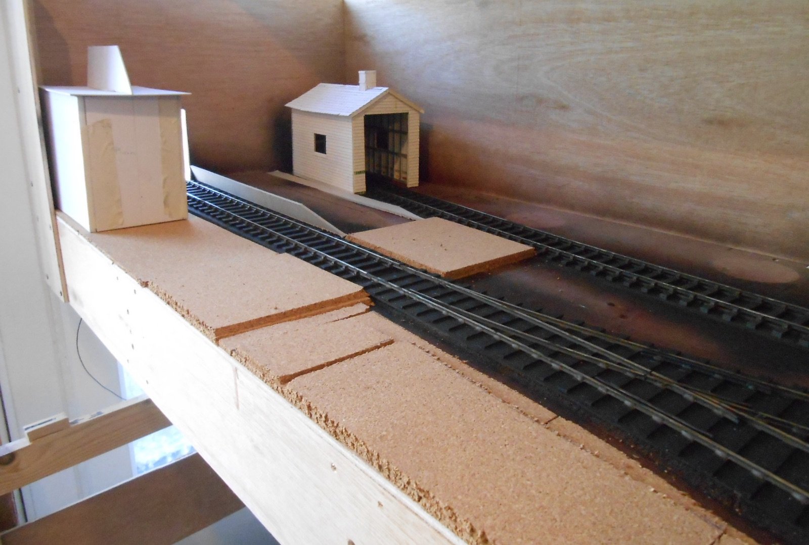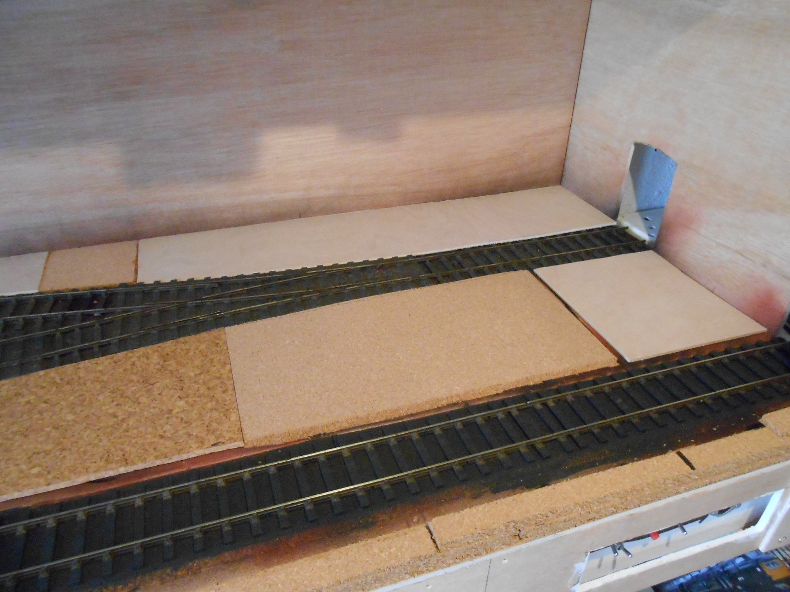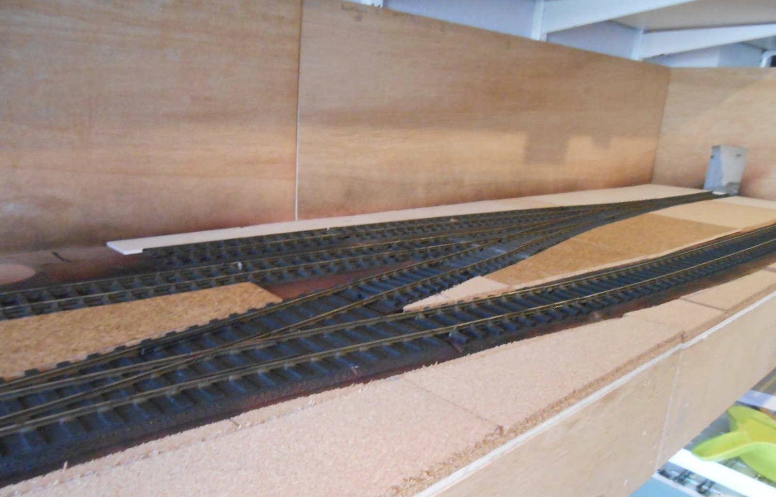 One of the nice things about building your own layouts is there is always something new to do. You can always play trains as well of course, so with with my two Irish layouts going out to shows in October & November, plus this new one on the go, I have plenty of choice! Next job on the BR layout was to get the track painted. So back to Martyn Welch's seminal 'Art of Weathering'. This has excellent suggestions for track work. The mainline sleepers are deemed to be fairly new, so have been painted with a mix of matt black and chestnut [Humbrol 186]. Later, these will be dry brushed with gunmetal [53] which gives a slight silvery effect. The private sidings, being much older & run down track are a lighter colour and will also be getting the gunmetal treatment. Martyn's suggestion for rails and chairs is to use a mix of leather [62], orange [82] and matt black for the mainline, but with gunmetal added for the sidings - along with further treatment to follow. As it is only a small layout, there is more reason to go to town with the fine details. Something that has been bugging me for a while is the ground levels on the layout. The mainline sits on 3mm cork, while the sidings are just laid on the base board. The mainline would have a cess running beside the ballast shoulder, so this becomes my datum, as it were. The problem has been deciding where the ground levels would be in the sidings - at the base of the sleeper or level with the tops, while road surfaces need to be level with the rails where there is a crossing. Ultimately, it is a bit like doing a painting - you start with the background and gradually work forwards. With a model though, you are working in three dimensions, hence the desire to get the base levels right. Another thing to think about was that this is intended to be a 'jigsaw' layout, with exchangeable sections to try and portray several different locations over time. Ultimately, decided to start with the permanent sections - the front edge, the level crossing to the yard and the area around the loco shed. These were built up with cork and card, cut to shape after first making paper formers. The same method was used to create the removable sections too. The removable sections have been cut from 3mm ply and comprise the areas in front of the back scene [mainly on the second baseboard, plus one piece to cover the join and another to hide the exit to the fiddle yard. However, NPQ at Aldershot this weekend, after which it is only a few weeks to Tolworth in November and Swillybegs first outing. Get these out of the way and I can hopefully get back to this layout again. Variety is the spice of life, after all.