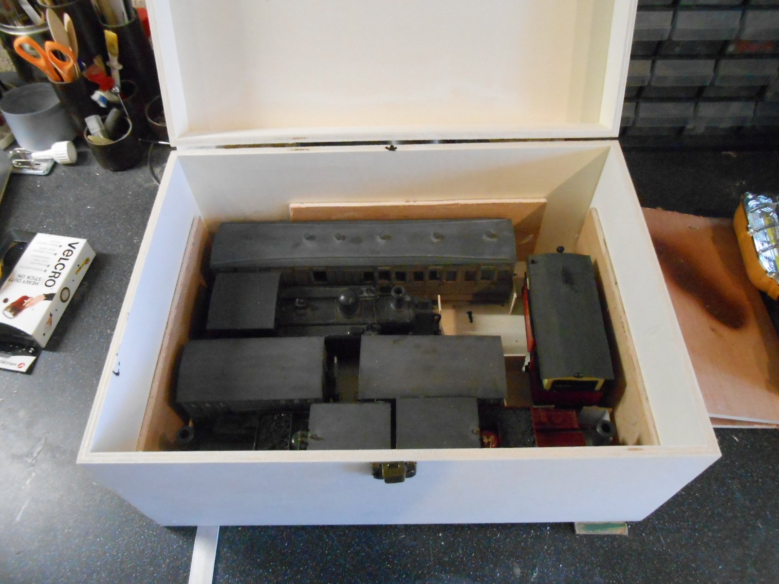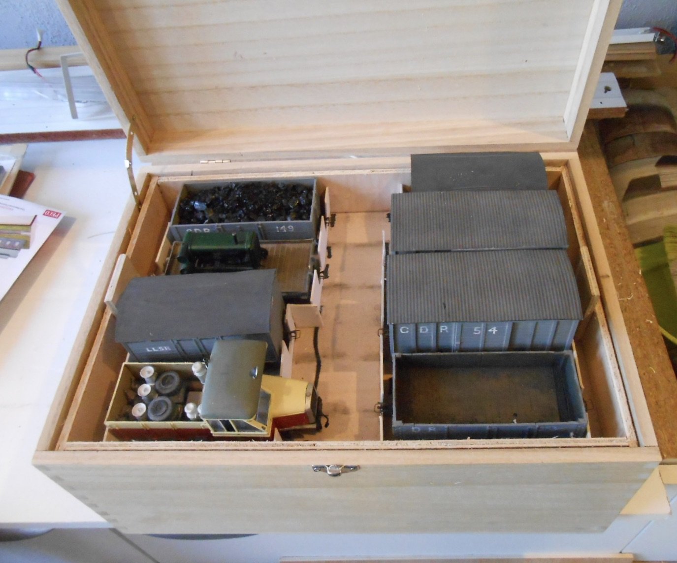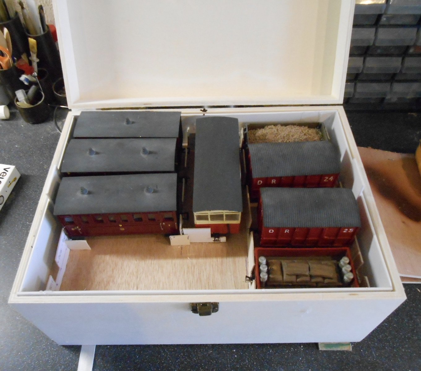 Tolworth next weekend, so essential I made up new stock boxes for all my Swillybegs stuff. Already had one of these [below], from Hobbycraft, so bought another. The new DG couplings require protection during transport, while both boxes have been given an inner extra layer. You should be able to see the strips of card that have been hot glued inside the boxes and top trays to both separate the stock and [hopefully], keep the couplings safe. just two boxes for all the stock, which will go in just a single large carrier bag - a big saving in terms of space compared to Northport Quay, where four bags are needed.
